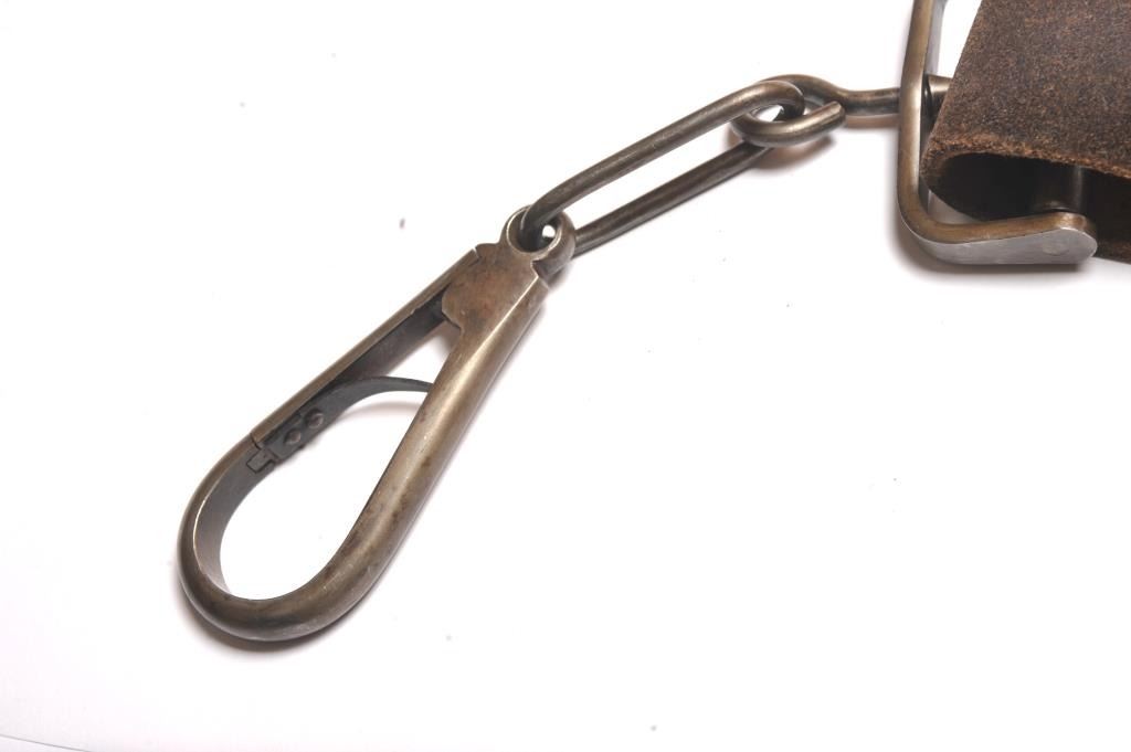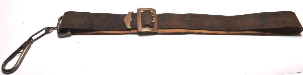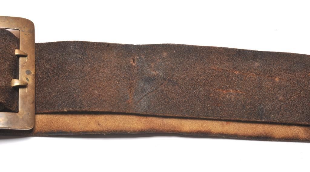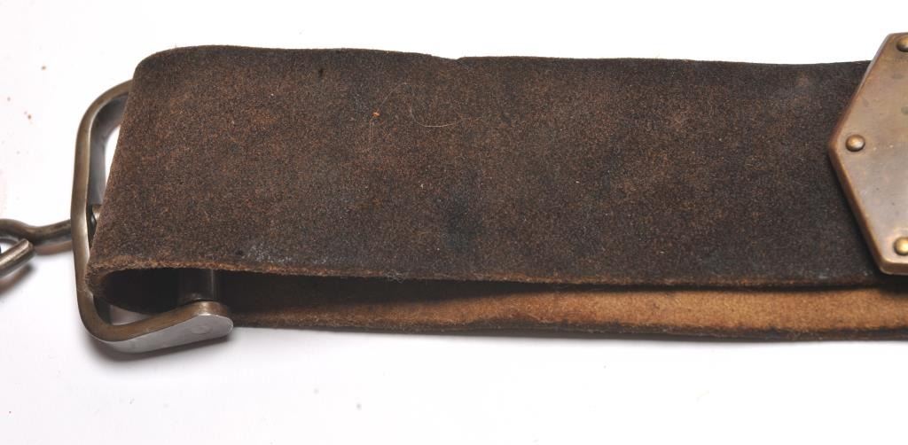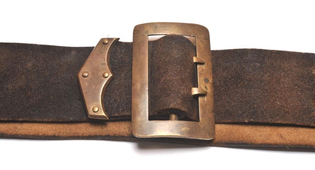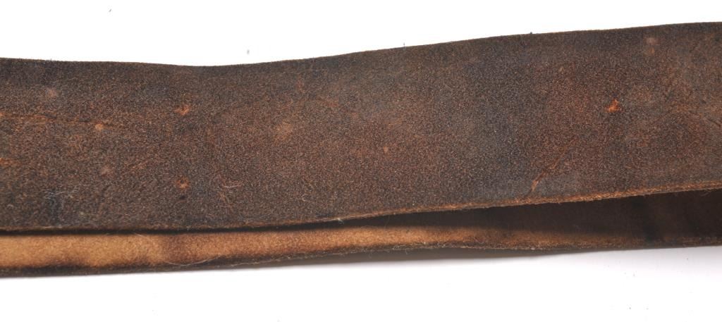 Authentic Early Civil War carbine hook and sling made of brown “Buff” leather marked “U.S., Gaylord Chicopee Mass” and “W.J. Shepar (Inspector). Slight aging and staining with uncleaned brass. Unissued. A 9.9 on a1-10 scale and hard to find. Est.: $700-$1400