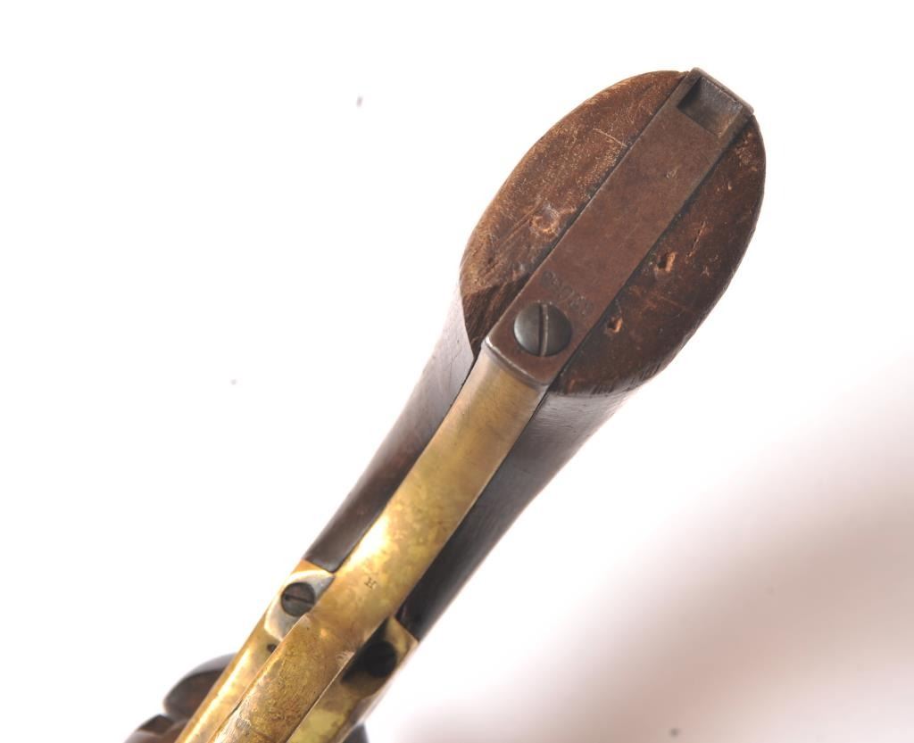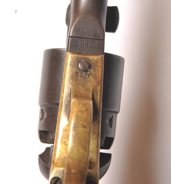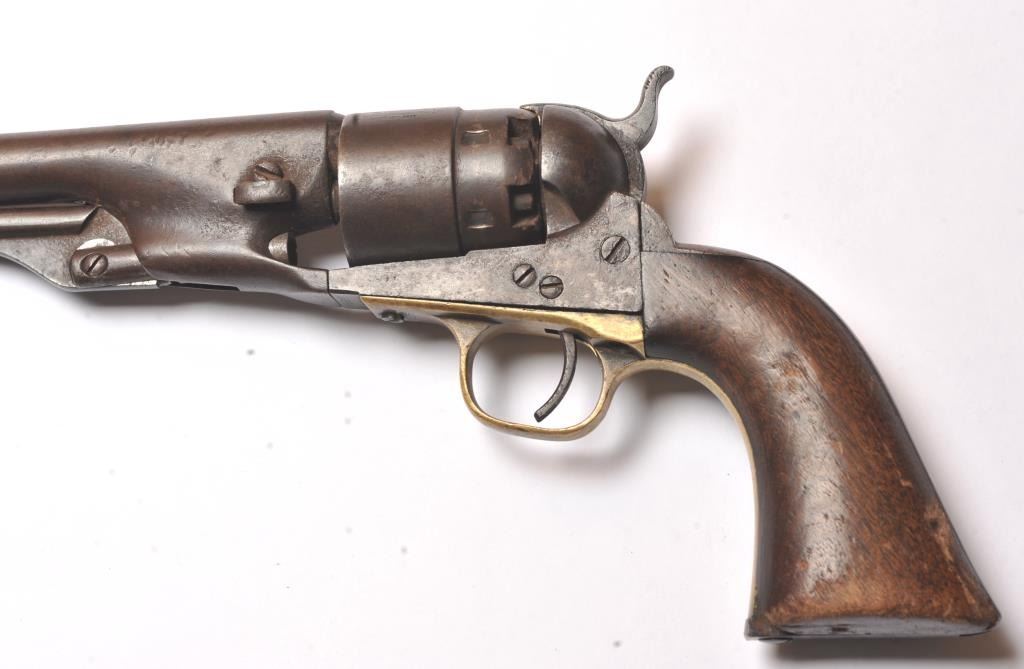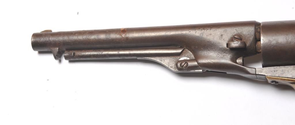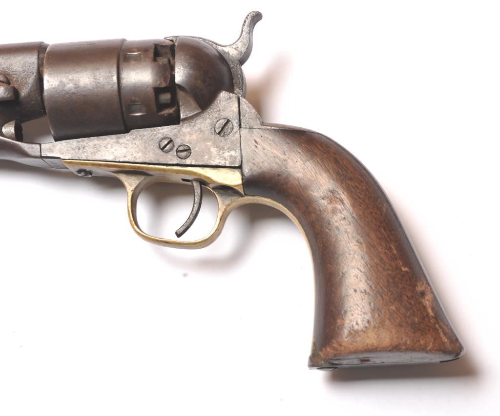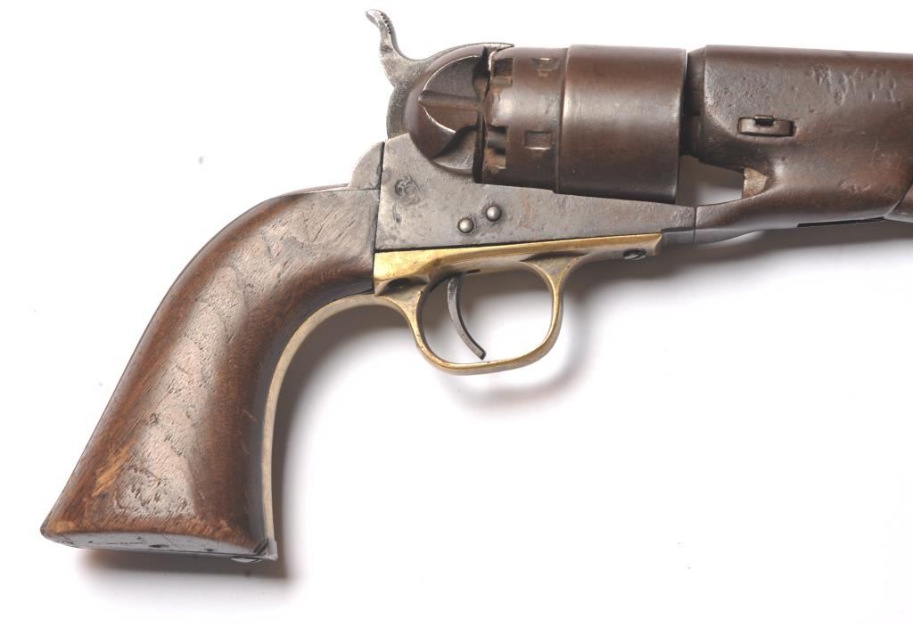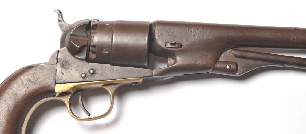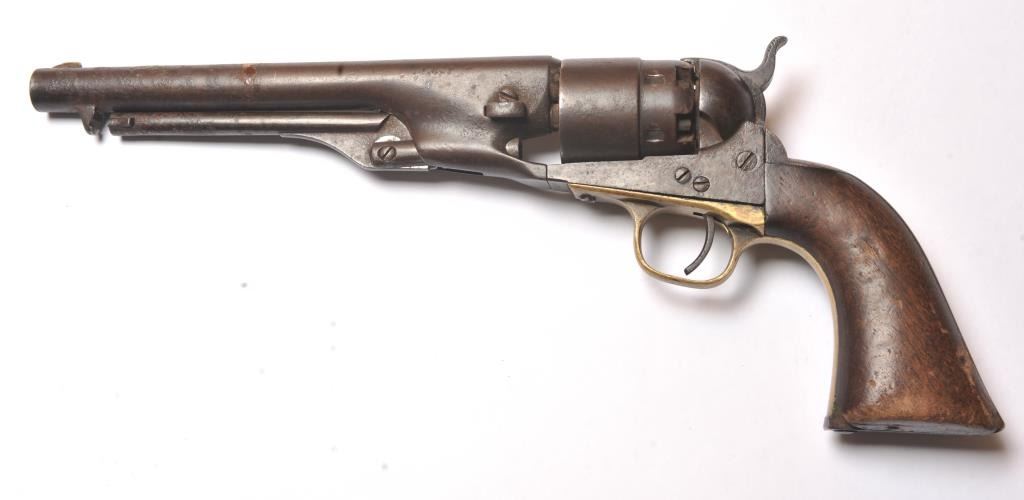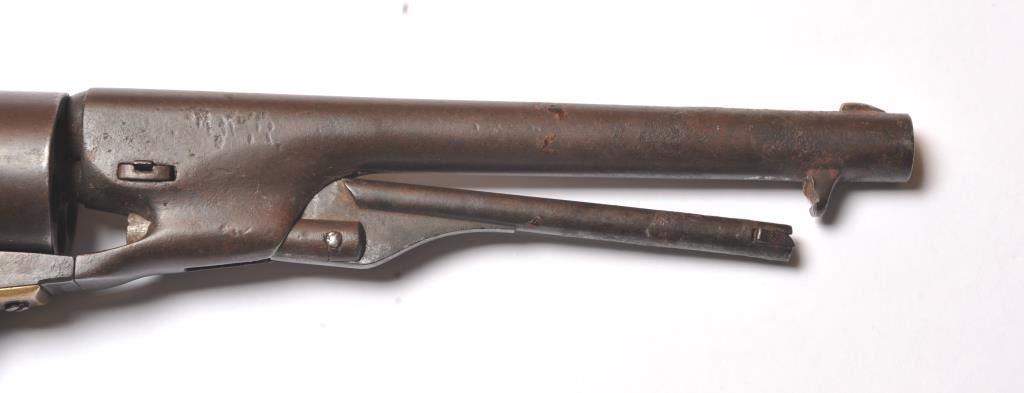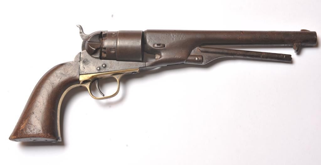 Colt 1860 Army Percussion Revolver in .44 caliber in as found “Out of the Attic” uncleaned condition, S/N 62856. Matching visible numbers with heavy brown patina and rust. The lever is loose and detaches. Theaction does not revolver but spring is good. The barrel address is good and frame markings is light. The grips are good with loss at the left toe. Hard to find ‘Unrestored” and uncleaned Civil War relic Colts. (Antique)Est.:$800-$1600