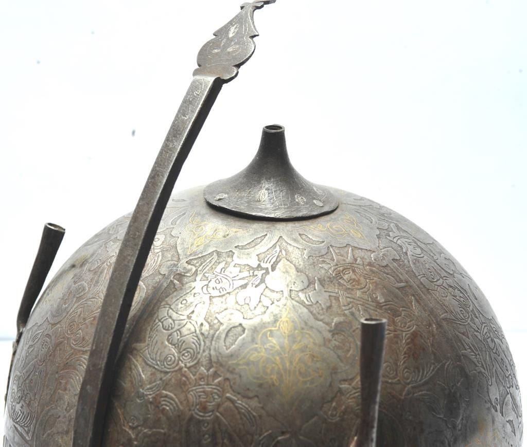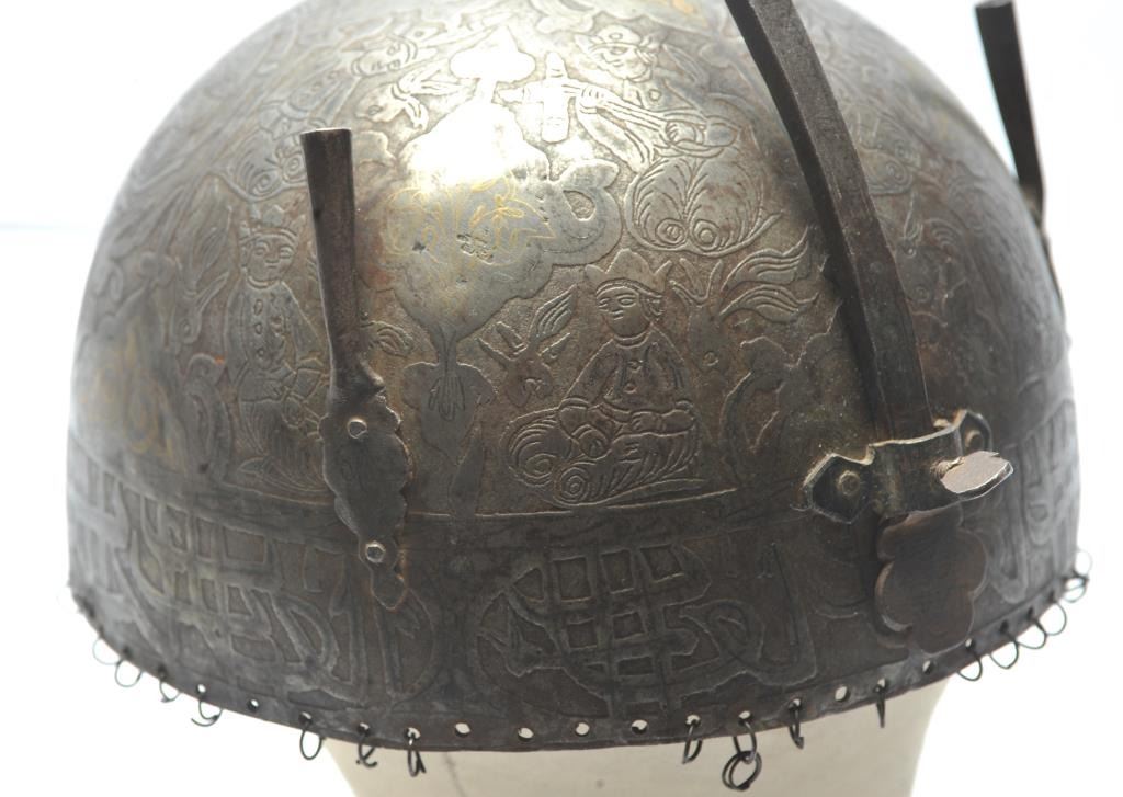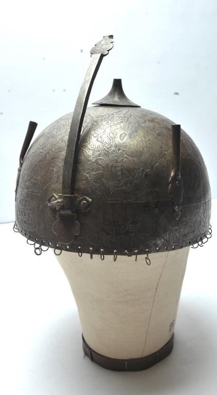 19th Century Kajar helmet with etched and engraved with gold damascened decoration. Spike and camail missing. Authentic armour not 20th century copy. Est.: $600-$1200