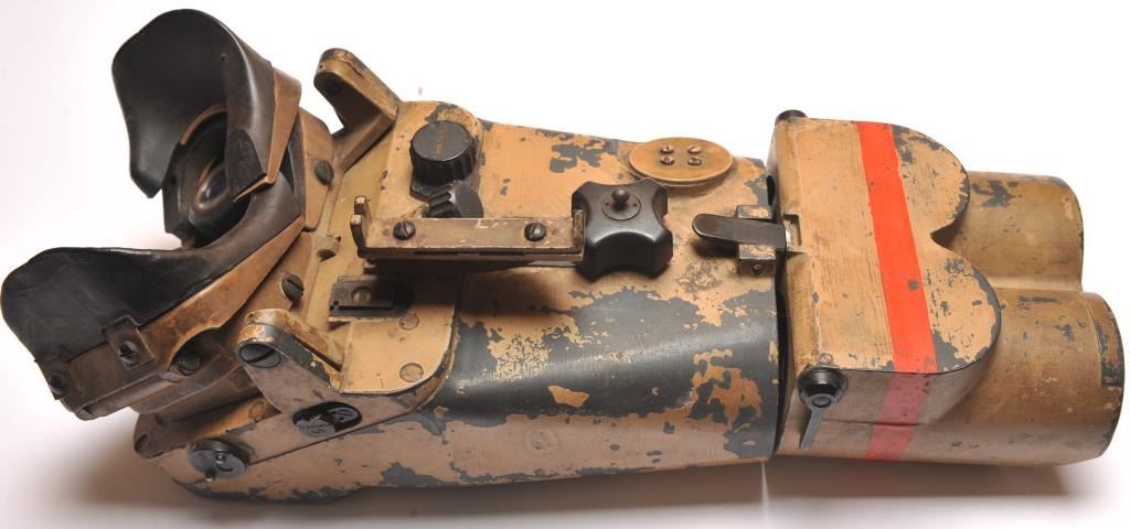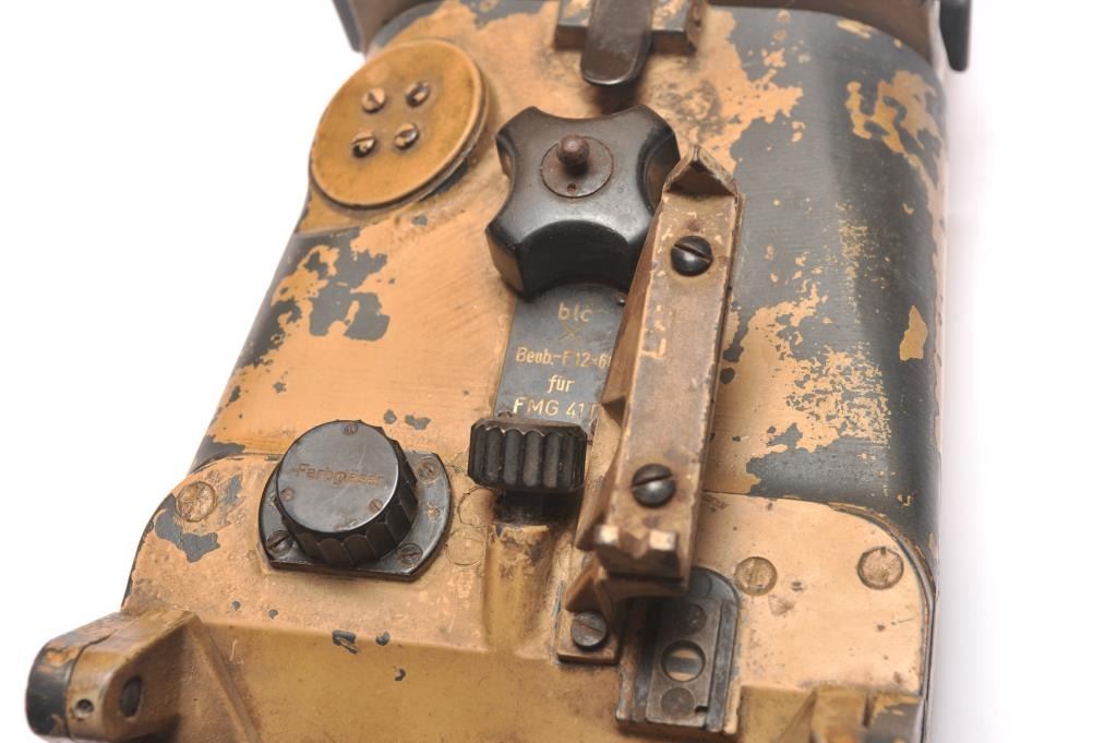 WWII Zeiss made spotting binoculars for tank or artillery showing military plate marked “blc-Beob-F-12-60-Fur-FMG-41T (anti-tank gun). Dull brown desert camouflage type paint about 75% intact with rubber eye pieces andclear lenses. Undoubtedly WWII GI bring back. Est.: $800-$1600