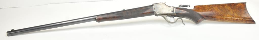 Winchester Hi Wall Deluxe Special Order Rifle in .32-40 Caliber with 26” Round Number 2 marked barrel, checkered pistol grip stock, crescent butt, Lyman tang sight, spirit level rear and beech type front sight, S/N 16608.90%-95%+ original blue on the barrel that is toning and aging naturally. 50%-70% case colors with some good rainbow hues and also aging well with some darkening and natural age. The checkered select burl wood stocksshow crisp checkering and good burled grain with some minor use, slight scratches and minor crack imperfections at least 3x. The action is good and the bore is bright with well-defined rifling. An attractive hi wallin the right caliber. Note: Very light pull on trigger (Approximately 2 lbs.) Est.: $2500-$5000