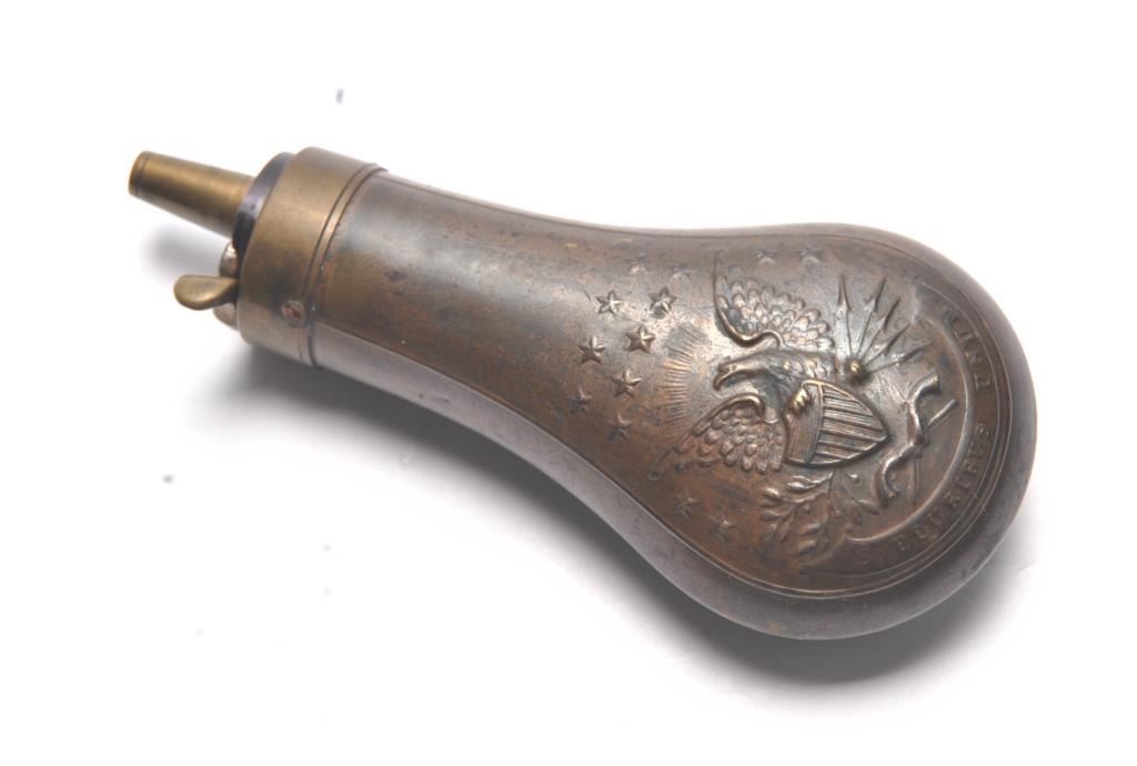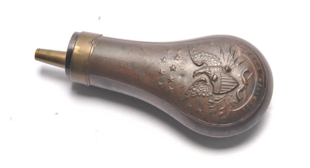 “E. Plurbus Unum” marked flask with eagle and shield generally associated with Colt 1849 Pocket model and other .31 caliber percussion revolvers. Very good condition with 75%+ original darkened lacquer and spring showsmost blue. Minor aging. Good enough to case with 75% finish or less pistol in our opinion. Est.: $250-$500