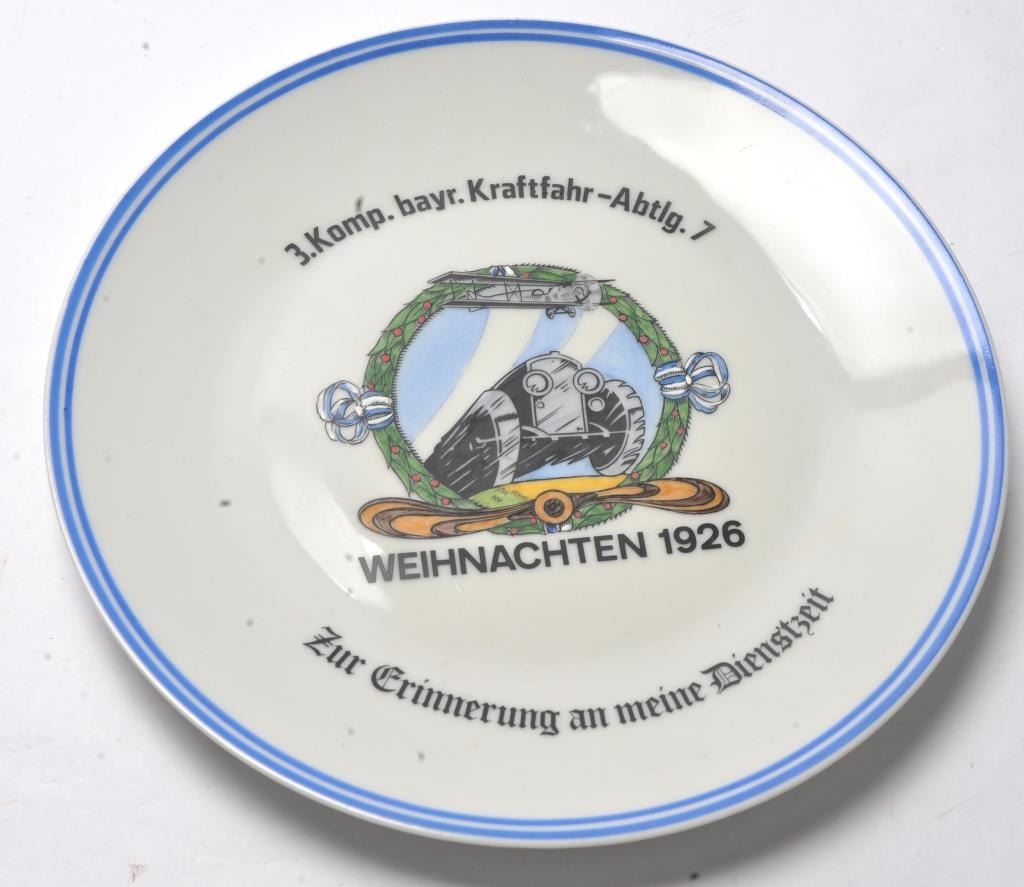 Authentic WWII Era Porcelain plate for wall display showing aircraft and military vehicle at the center with the wording “3. Komp. Bayr. Kraftfahr-Abtlg 7, Weihnachten 1926, Zur Erinnerung an meine Dienstzeit”. Measures 9 ½” across the center. Made to hang with piecing for wire or string. Raised hand painting (Not decal) in almost fine condition. Est.: $100-$200