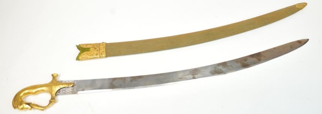 Excellent Indian Tulwar sword and scabbard showing rich gold gilt and fancy mounts with figural hilt circa 19th century. Measures 36” overall with a 31” blade. Well-made English steel blade with some minor erosion andbeginning pitting in a few patches from age. The hilt and mounts are almost fine as is the original scabbard. A very fine and elaborate sword made for Indian Raja or person of importance and wealth. Est.: $1500-$3000