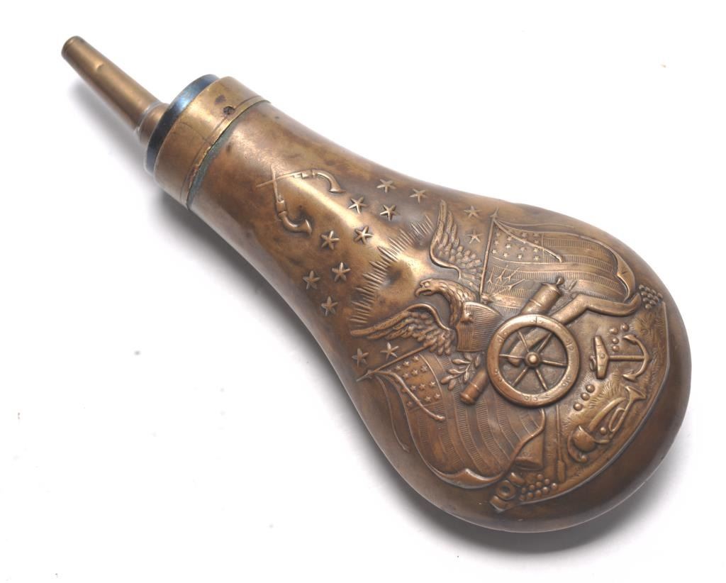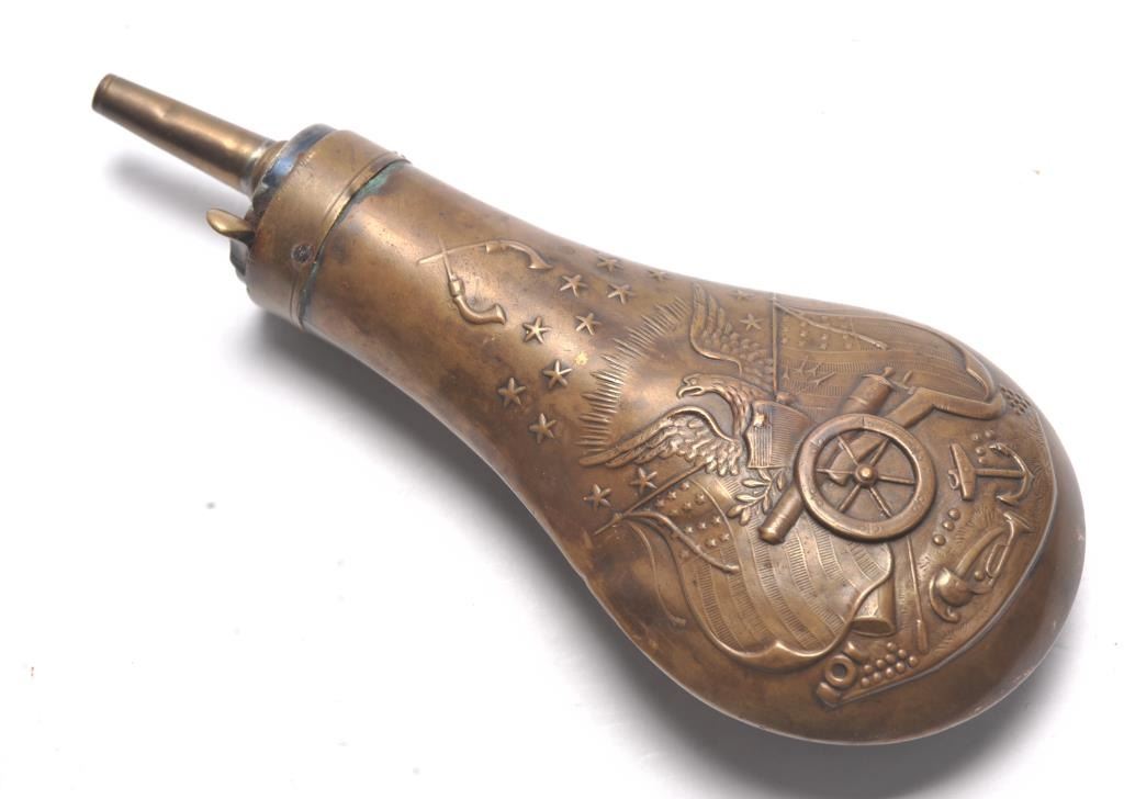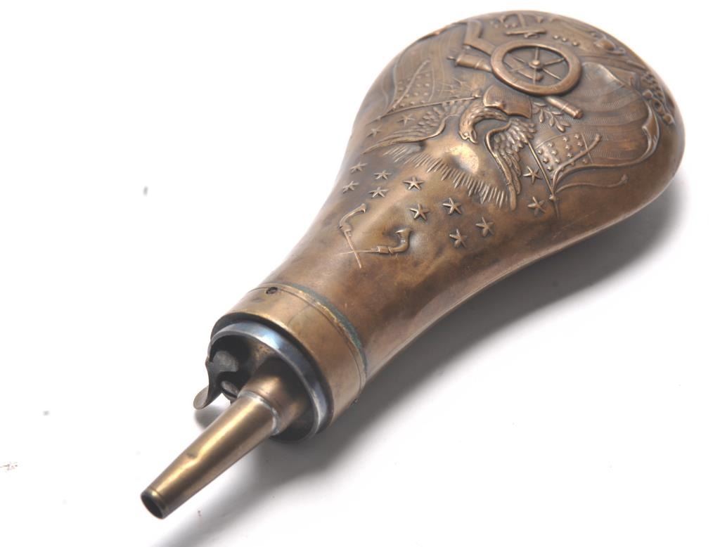 Bent spout flask for Colt Navy or other .36 caliber percussion revolvers showing American eagle, crossed pistols, cannon, stands of flags, and naval anchor. Good condition with minor dents and good spring with most blue.Some traces of lacquer but mostly patina. Casable with a 50% finish Colt or less in our opinion. Est.: $600-$1200