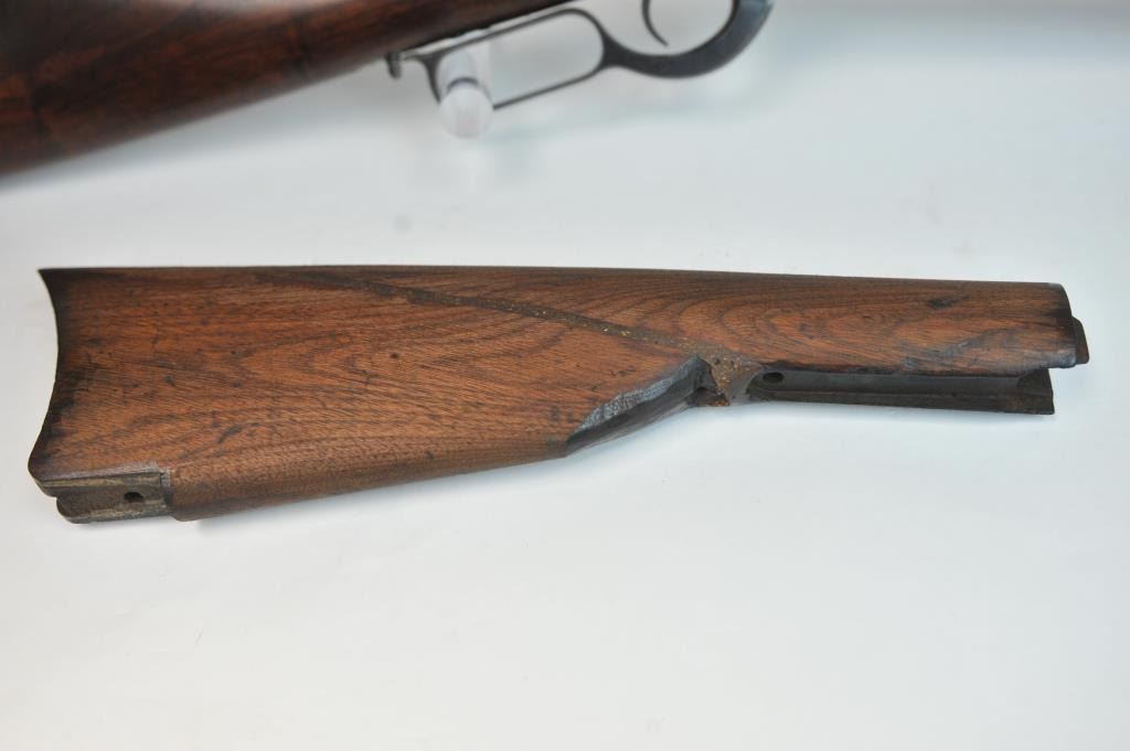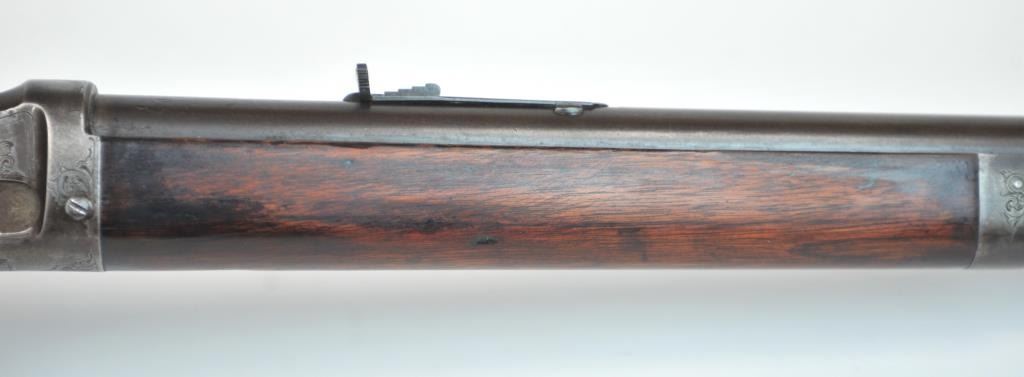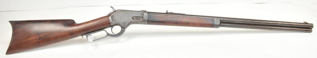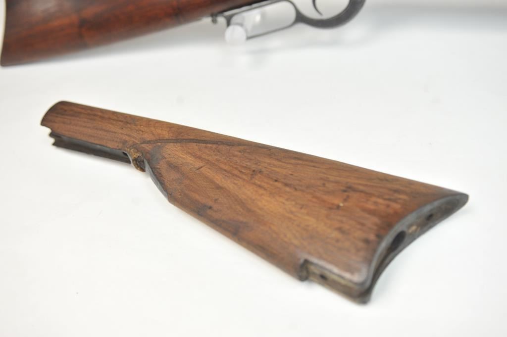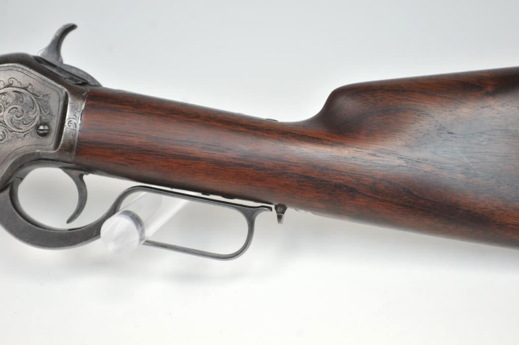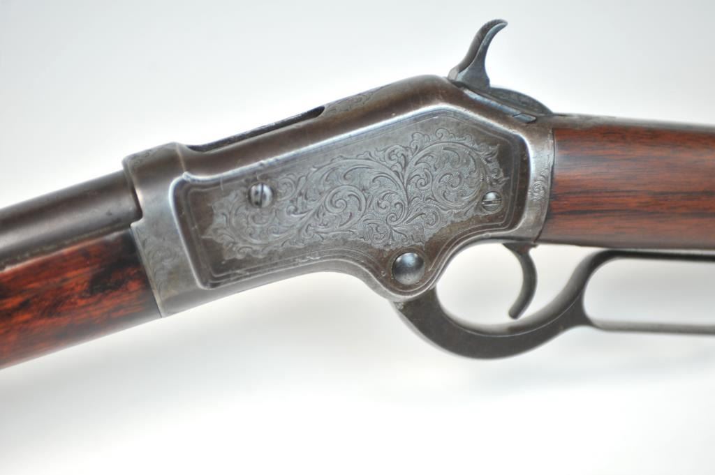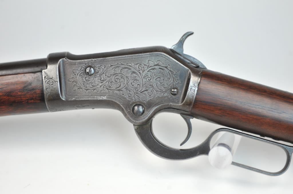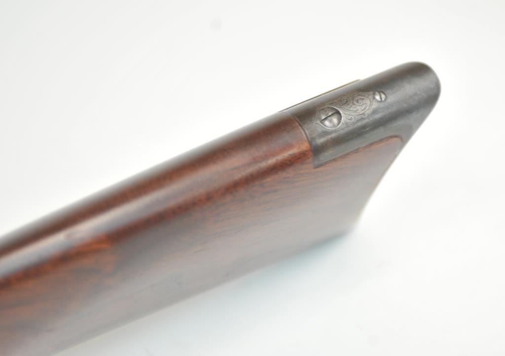 Colt Burgess Lever Action Rifle in .44-40 caliber S/N 1913 showing period New York scroll engraved. Good to very good overall condition showing a blue to brown patina with good markings and good bore. The engravingis absolutely authentic to the period and may be the shop of L.D. Nimschke who worked through the New York distributions like Schuyler, Hartley and Graham. The butt stock is an excellent restoration and the originalis included also. From a major Montana collector who looked 50 years to find one and experts estimate less than a dozen authentic engraved Burgess Rifles are extant. (Antique) $10,000-$20,000