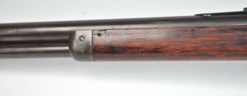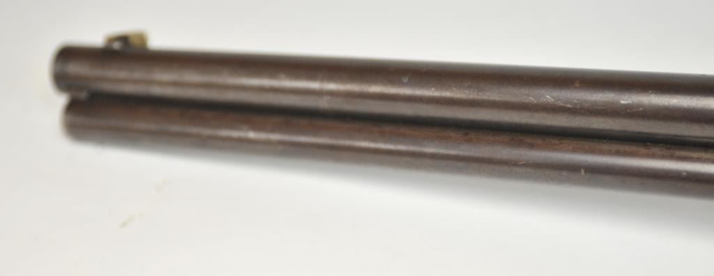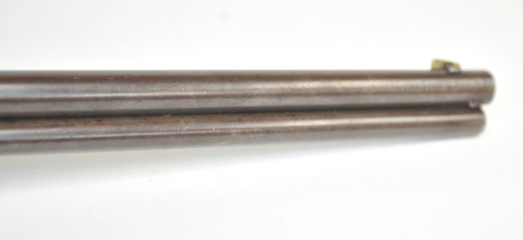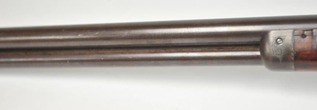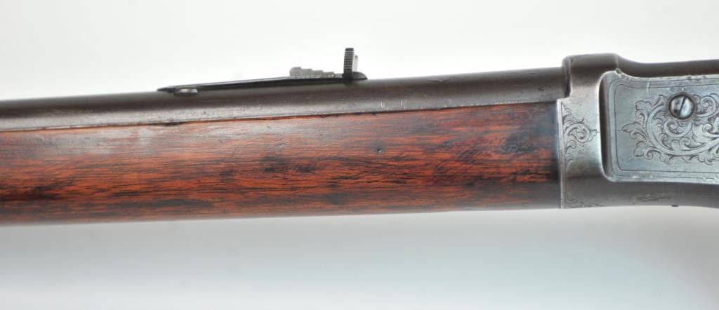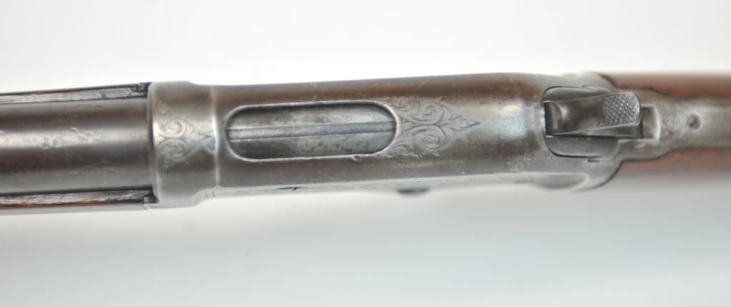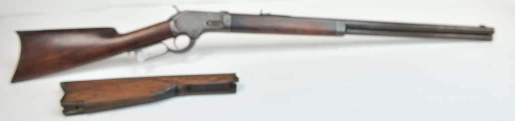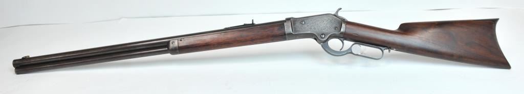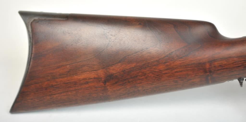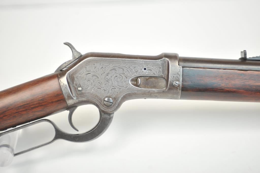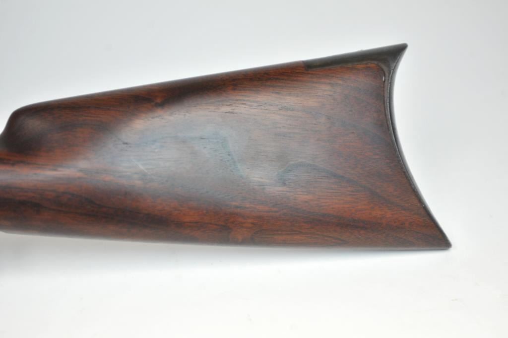 Colt Burgess Lever Action Rifle in .44-40 caliber S/N 1913 showing period New York scroll engraved. Good to very good overall condition showing a blue to brown patina with good markings and good bore. The engravingis absolutely authentic to the period and may be the shop of L.D. Nimschke who worked through the New York distributions like Schuyler, Hartley and Graham. The butt stock is an excellent restoration and the originalis included also. From a major Montana collector who looked 50 years to find one and experts estimate less than a dozen authentic engraved Burgess Rifles are extant. (Antique) $10,000-$20,000