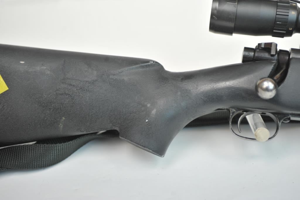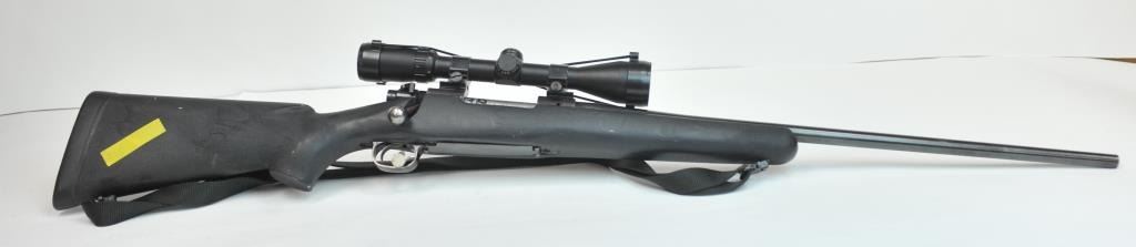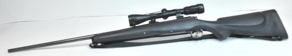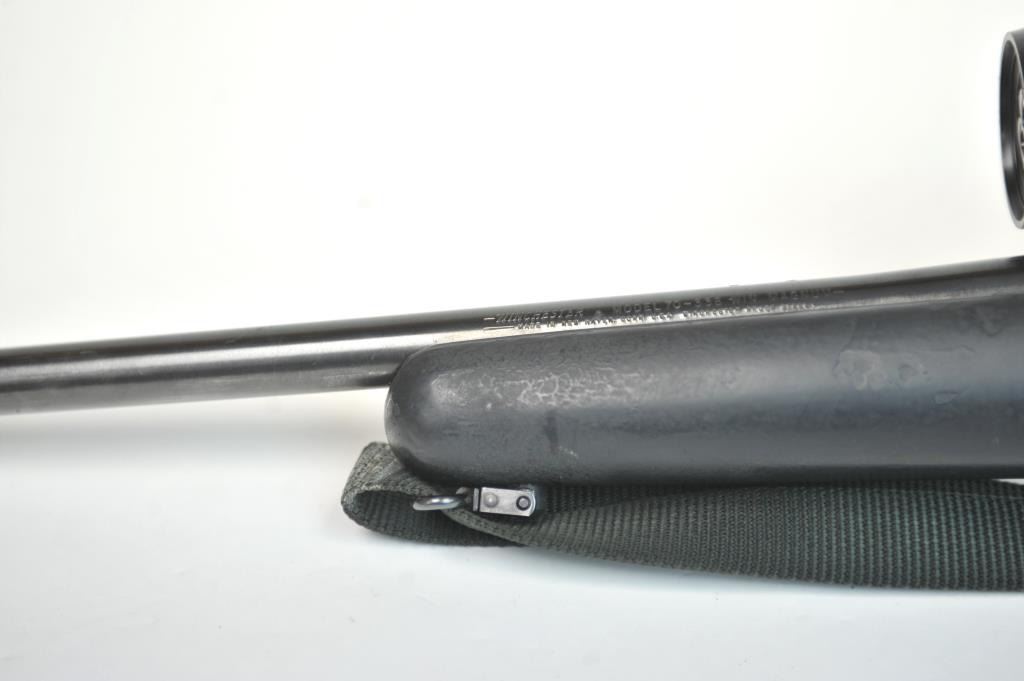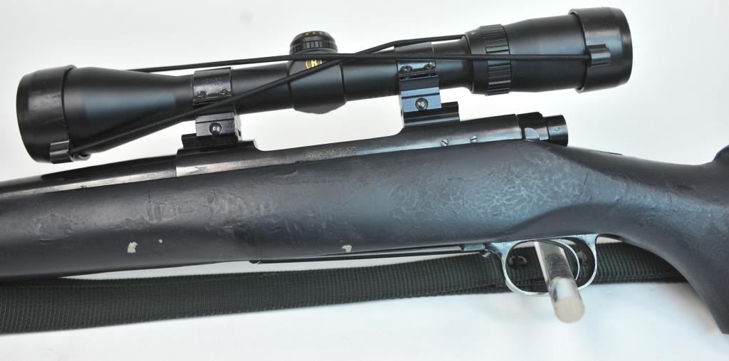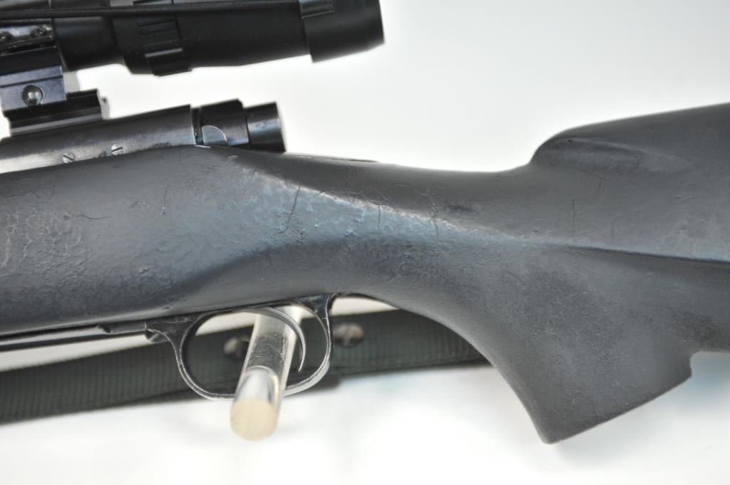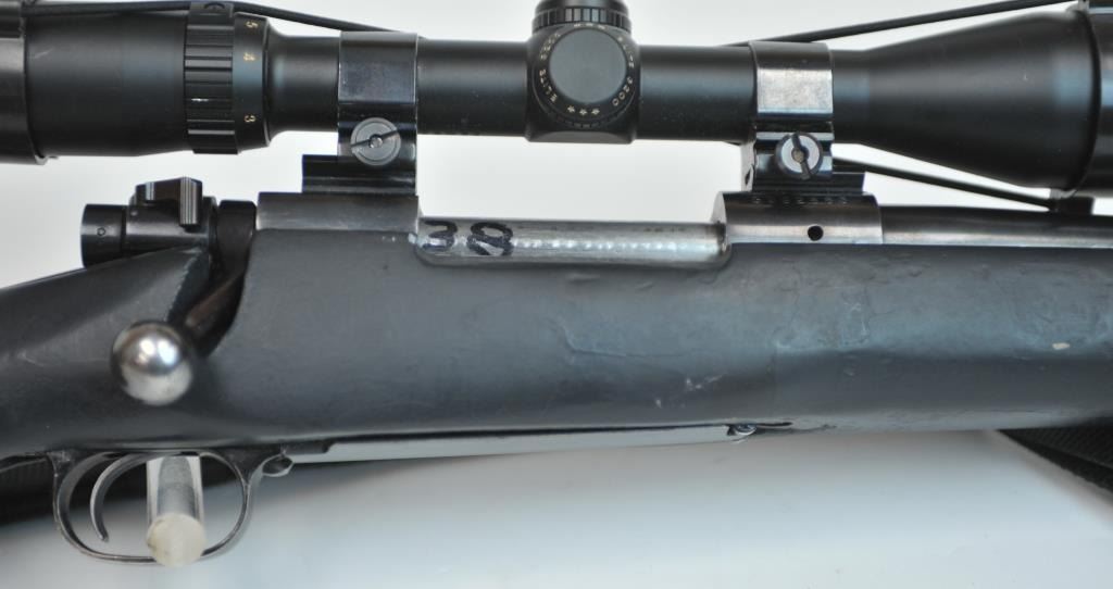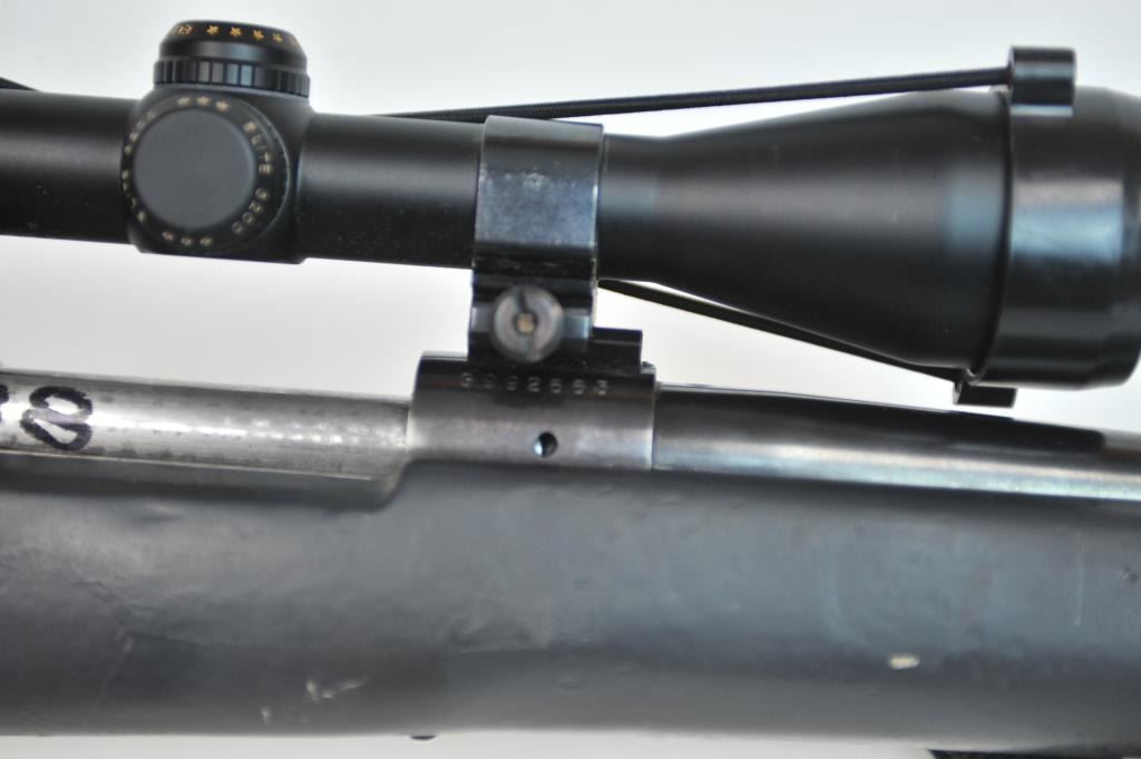 Winchester Post-64 Model 70 bolt action rifle, .338 Winchester Magnum caliber, Serial #G992663. The rifle is in good overall condition with a 24” barrel with the front and rear sights removed. The rifle retains a significant amount of blue finish with scratches and mars consistent with field use. The black synthetic stock is in good condition with a solid rubber recoil pad, sling swivels and a nylon sling. The bore is good and the action is crisp. The rifle is topped with Weaver two-piece bases and rings under a Bushnell Elite 4200 3 x 9 variable power rifle scope. Est.: $500-$1,000. (Modern/PPT).