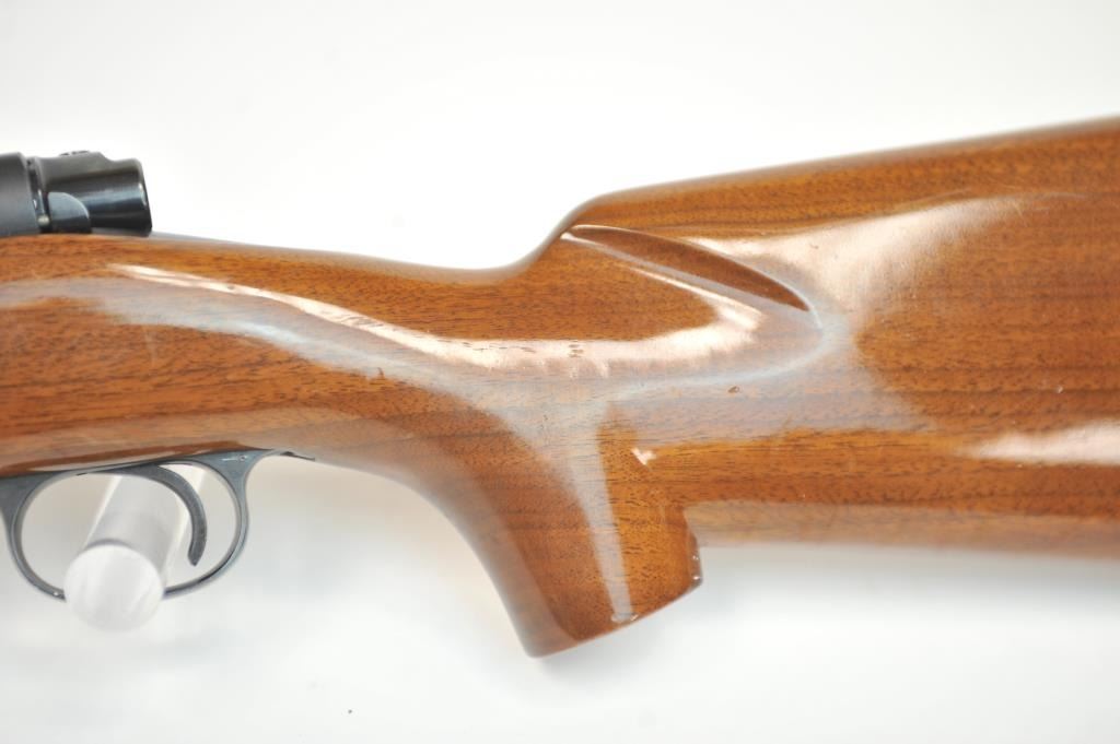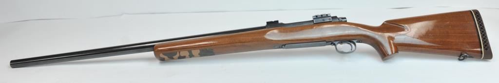 Winchester Pre-64 Model 70 bolt action target rifle, .30-06 caliber, Serial #414010. The rifle is in very good overall condition with a 26” custom bull barrel with the front and rear sights removed. The barrel retainsnearly all of an old re-blue. The receiver shows significant original blue finish. The smooth wood stock is in very good condition with a beavertail fore end and a ventilated rubber recoil pad. The receiver is drilledand tapped with Weaver mounts and a side mount base added. The bore is good and the action is crisp on this custom Model 70 with a receiver manufactured circa 1957. Est.: $500-$1,000. (Modern/PPT).