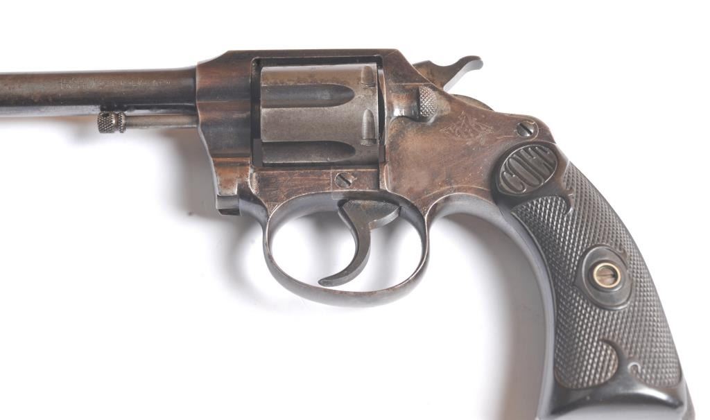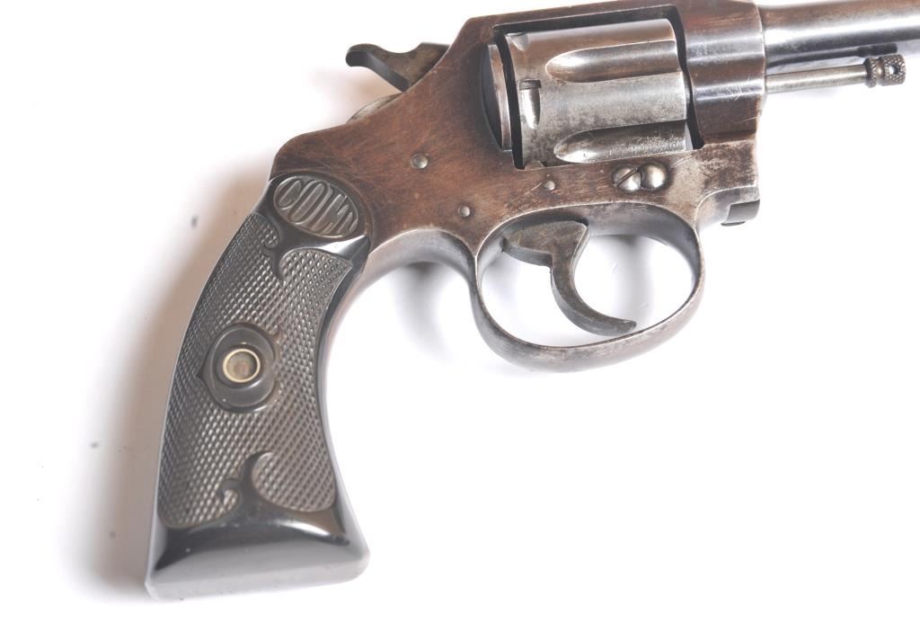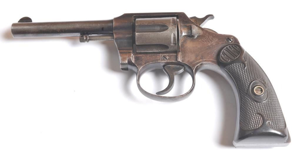 Colt Police Positive DA revolver, .32 caliber, Serial #70788. The pistol is in good overall condition with a 4” barrel. The pistol retains a significant amount of toning blue finish drifting to dark patina.The trigger and hammer show traces of bright niter blue. The checkered hard rubber grips are in good condition with a small chip missing at the base of the left panel. The bore is fair and the action functions on this Colt DA revolver circa 1909. Est.: $200-$400. (C+R/PPT).