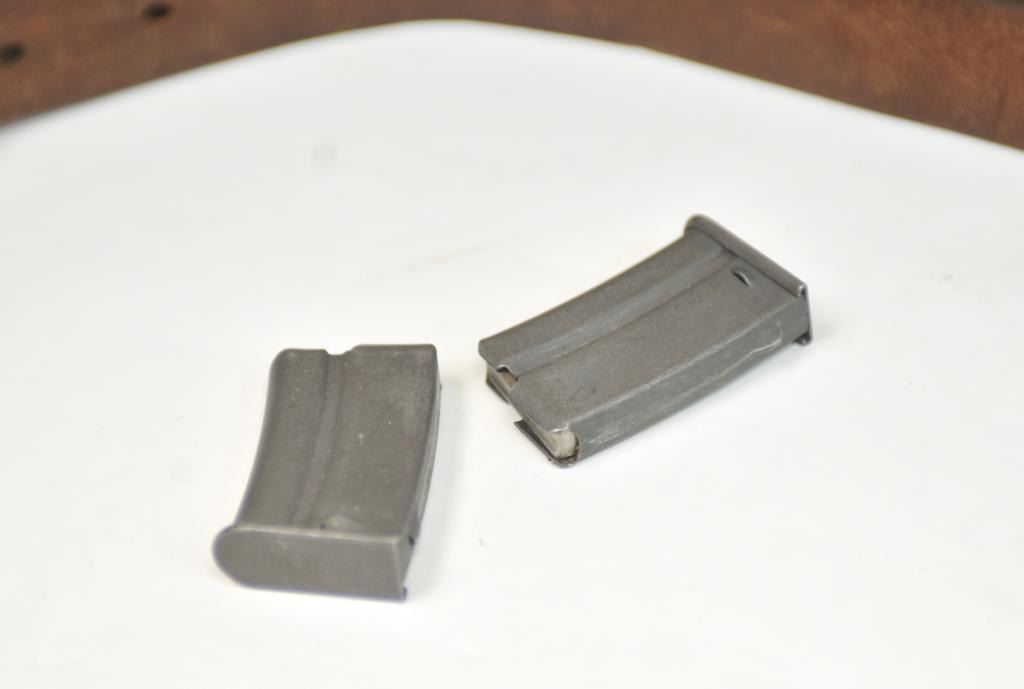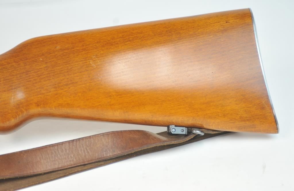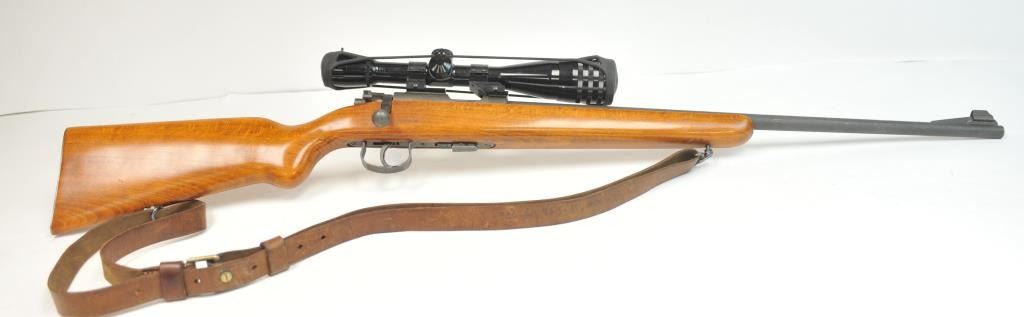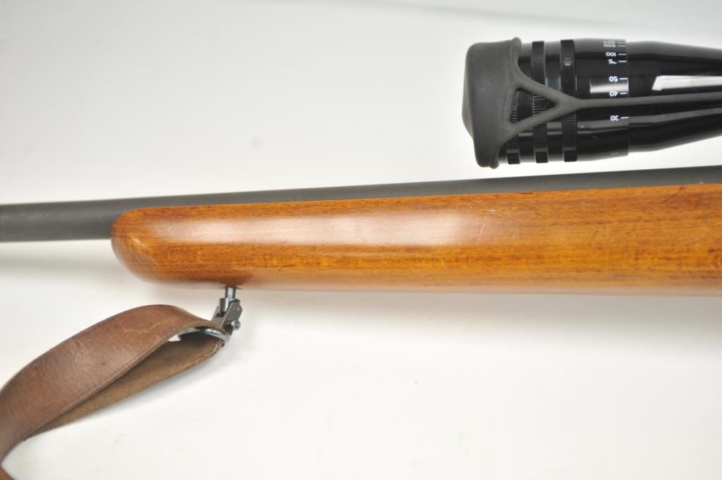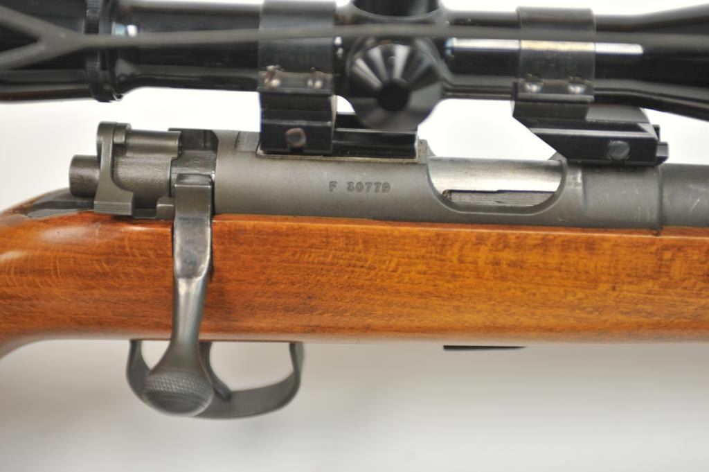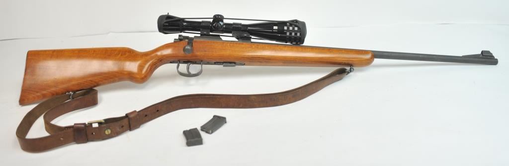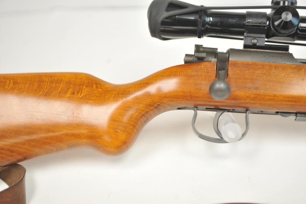 French MAS Model 45 bolt action training rifle, .22 Long Rifle caliber, Serial #F30779. The rifle is in very good overall condition with a 24” barrel with a hooded ramped blade front sight. The rifle retainsa significant amount of military finish with small and scratches consistent field use. The smooth wood stock is in very good condition with sling swivels, stippled trigger guard and MAS marked polished steelbutt plate. The rifle is topped with Weaver bases, rings and adjustable objective rifle scope. The bore is dirty and may clean to fair. The lot includes three correct magazines and a period military style leather sling. Est.: $250-$500. (C+R/PPT).
