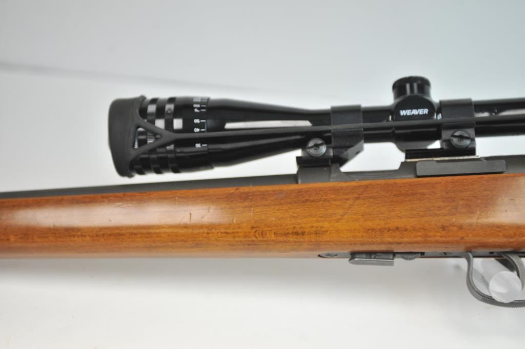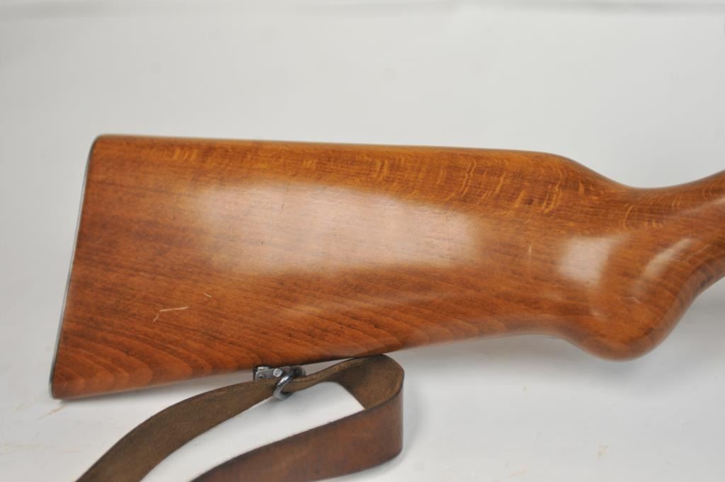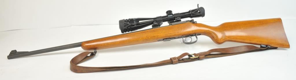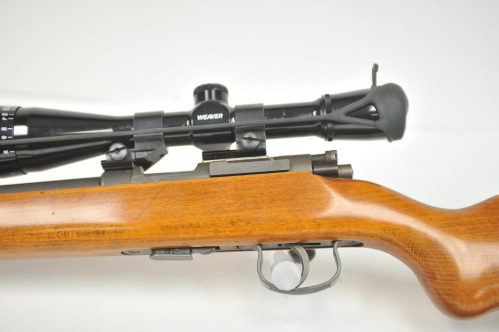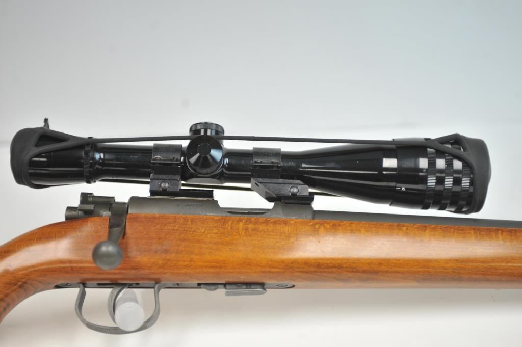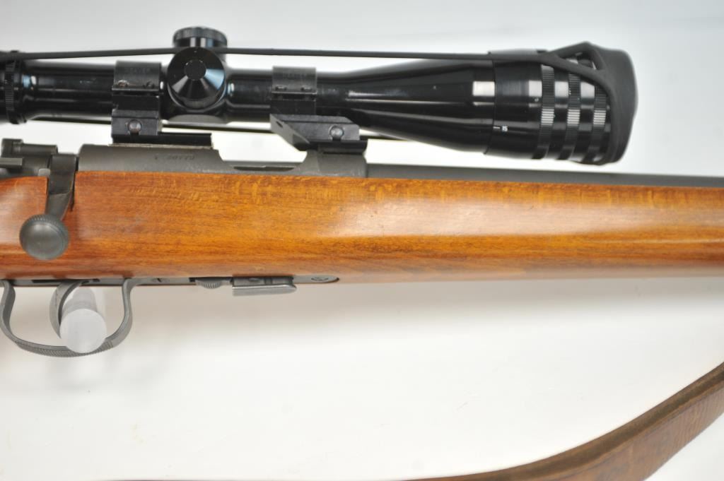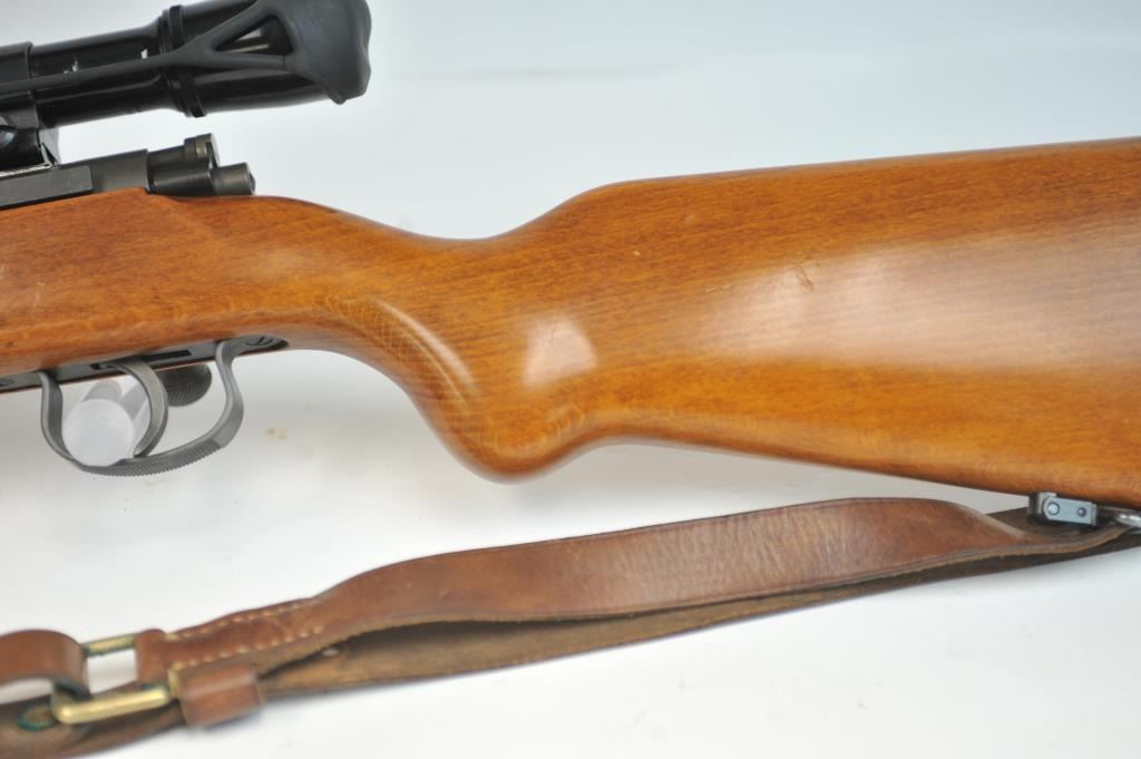 French MAS Model 45 bolt action training rifle, .22 Long Rifle caliber, Serial #F30779. The rifle is in very good overall condition with a 24” barrel with a hooded ramped blade front sight. The rifle retainsa significant amount of military finish with small and scratches consistent field use. The smooth wood stock is in very good condition with sling swivels, stippled trigger guard and MAS marked polished steelbutt plate. The rifle is topped with Weaver bases, rings and adjustable objective rifle scope. The bore is dirty and may clean to fair. The lot includes three correct magazines and a period military style leather sling. Est.: $250-$500. (C+R/PPT).