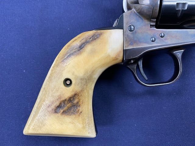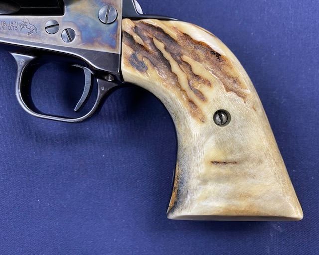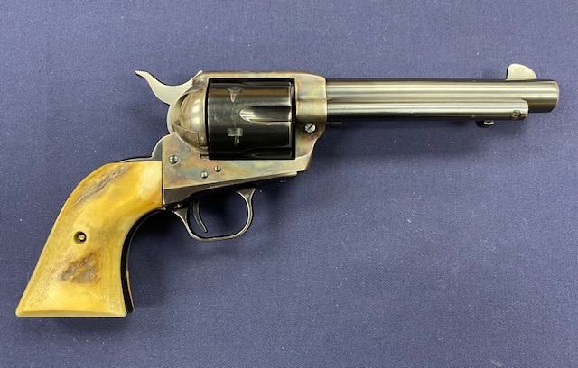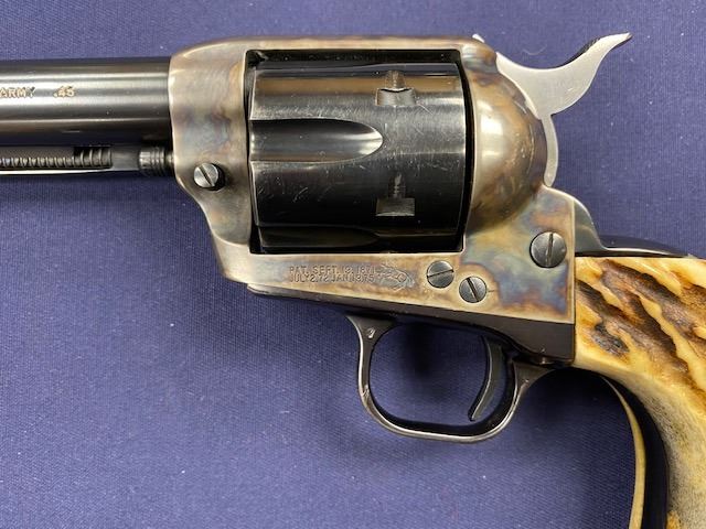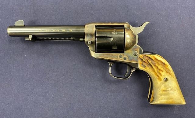 Colt Single Action Army 2nd Generation Revolver in .45 Long Colt caliber with a 5 ½” barrel, blue and case hardened finish, thick old period stag grips, S/N 64957SA. Hammer changed and action re-worked for champion End of Trails winner “MAC” Clough. 80%-90% finish with bright bore. (C& R) Est.: $1200-$2400