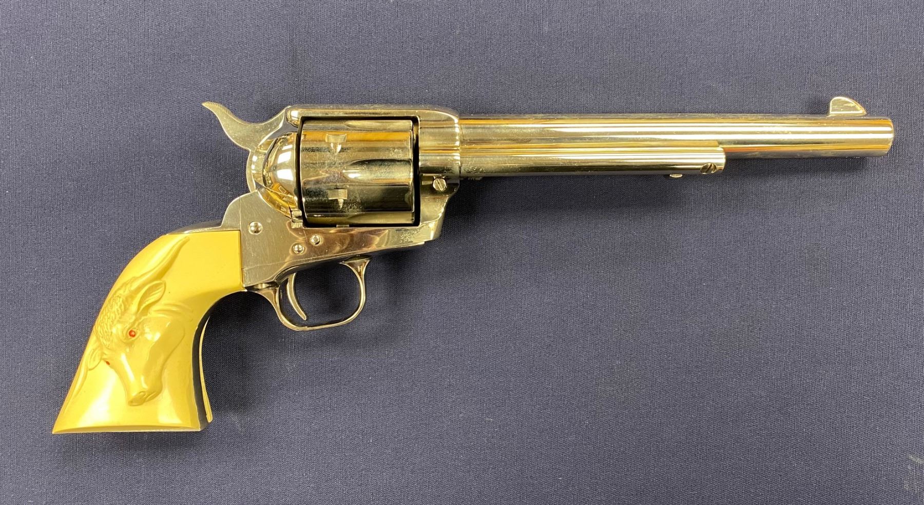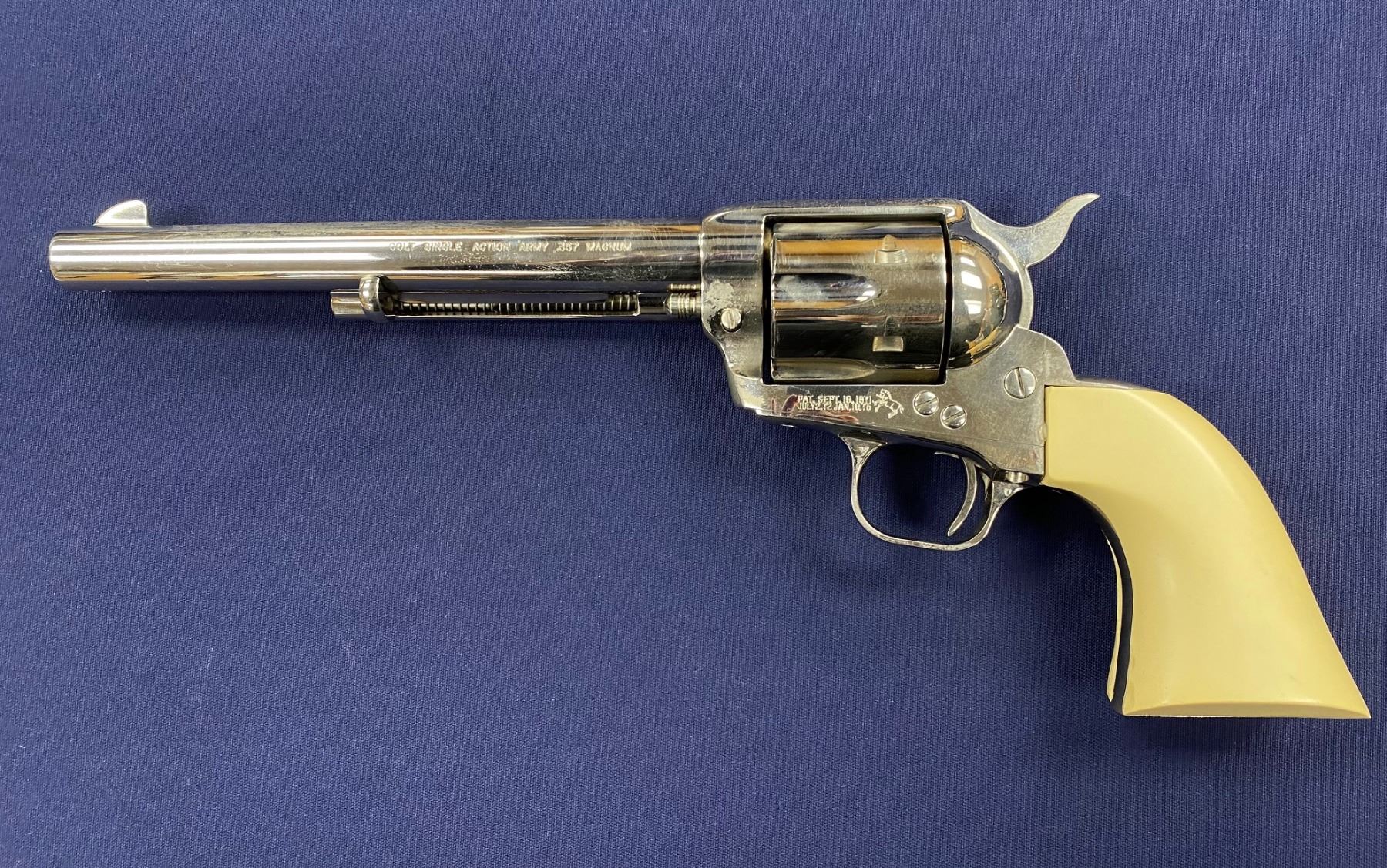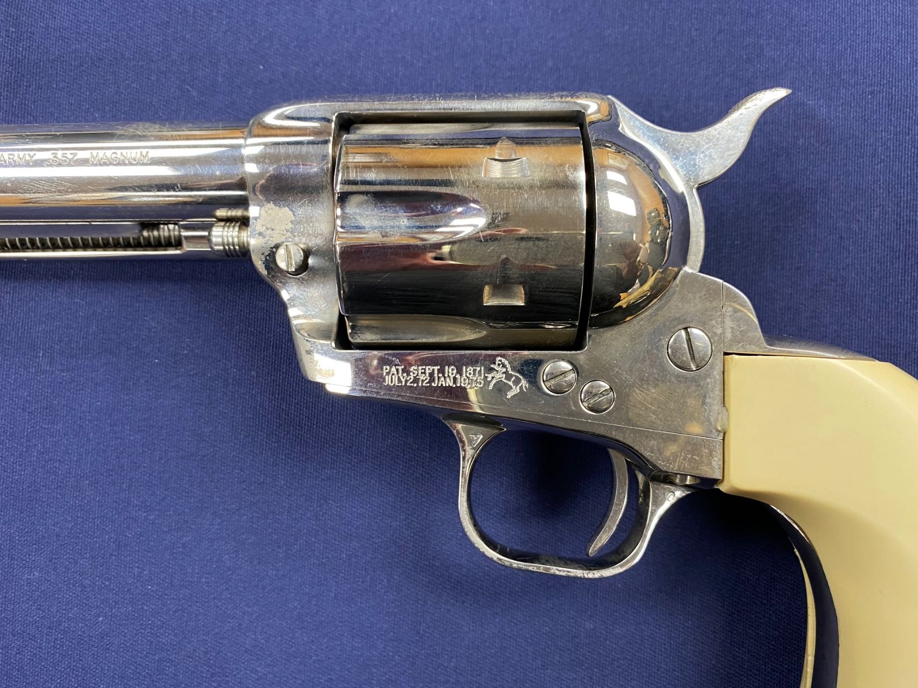 Colt Single Action Army 3rd Generation Revolver in .357 Mag Caliber with a 7 ½” barrel, factory nickel finish, and faux ivory screw less grips. The action is times and worked by “MAC” Clough well known cowboy action shooter, range master and San Diego “Pistolero”. 95%+ original nickel showing some carry and use. (Modern/PPT) Est.: $900-$1800.