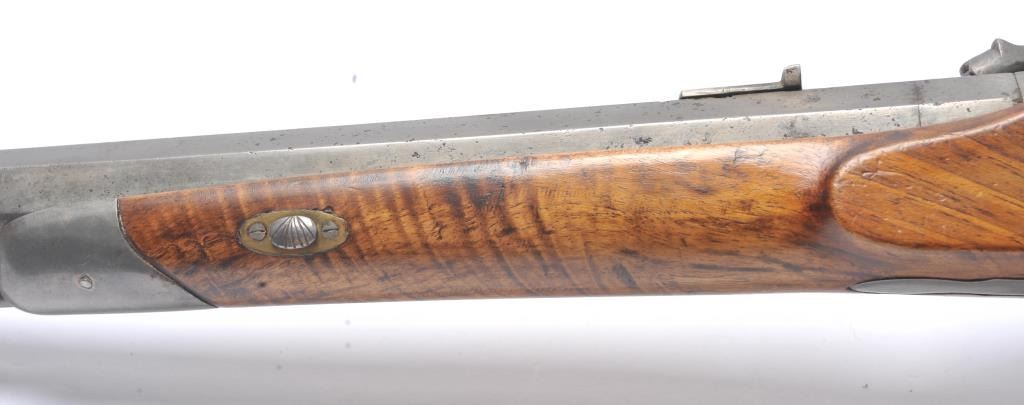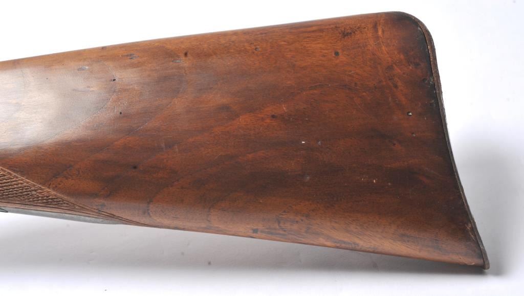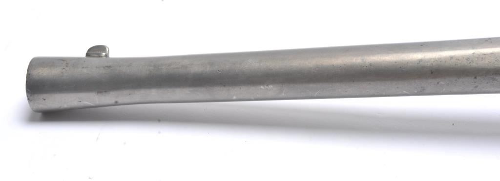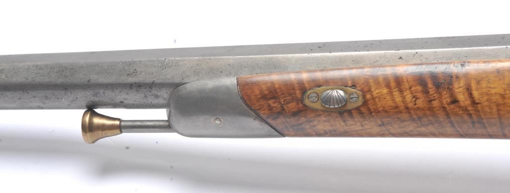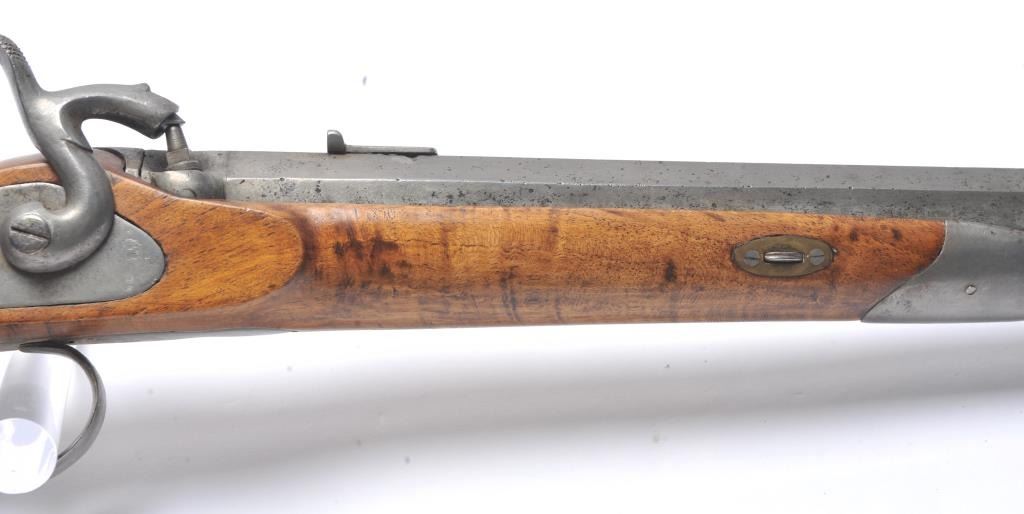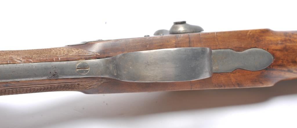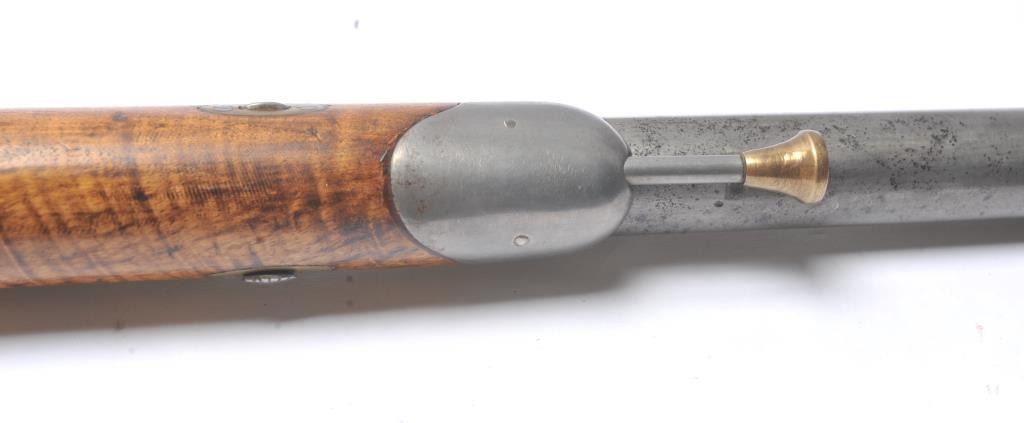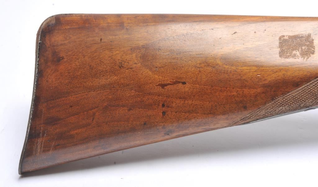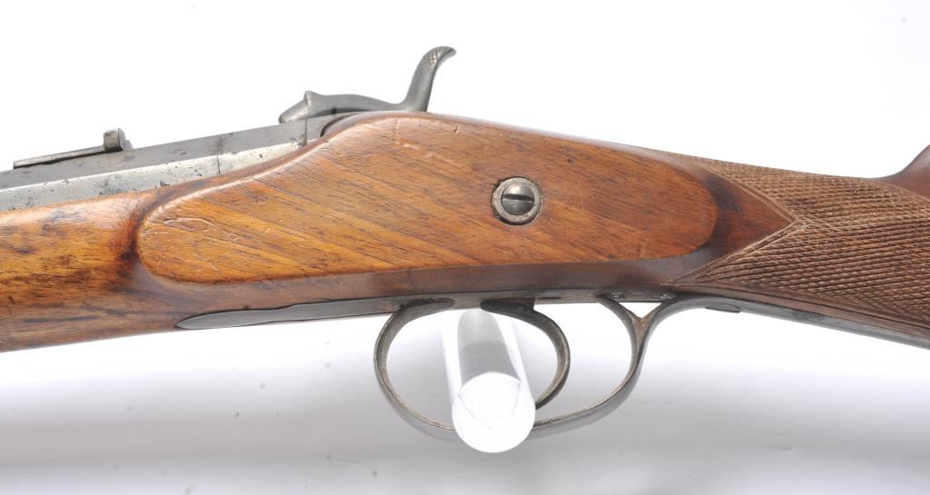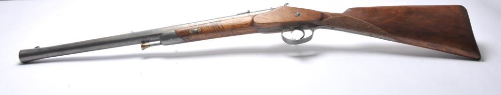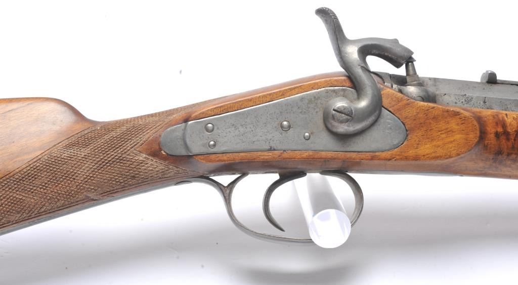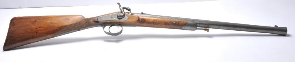 French style percussion muzzle loading carbine circa late 1850-1860’s with a flared iron barrel of nearly blunderbuss size. The carbine measures 37” in overall length with a 21” barrel that is .90 caliber orapproximately 3 bore. Shows sights on the barrel. The metal is cleaned and wood has checkering which has been sharpened. A brass tipped ramrod is included. A recognized French dealer stated that several like thisone were found in Egypt in the 1950’s. Possibly used by the French in North Africa during the colonial period. Est.: $500-$1,000. (Antique).