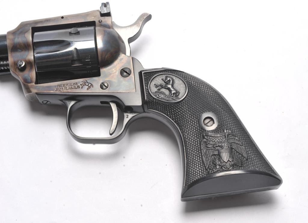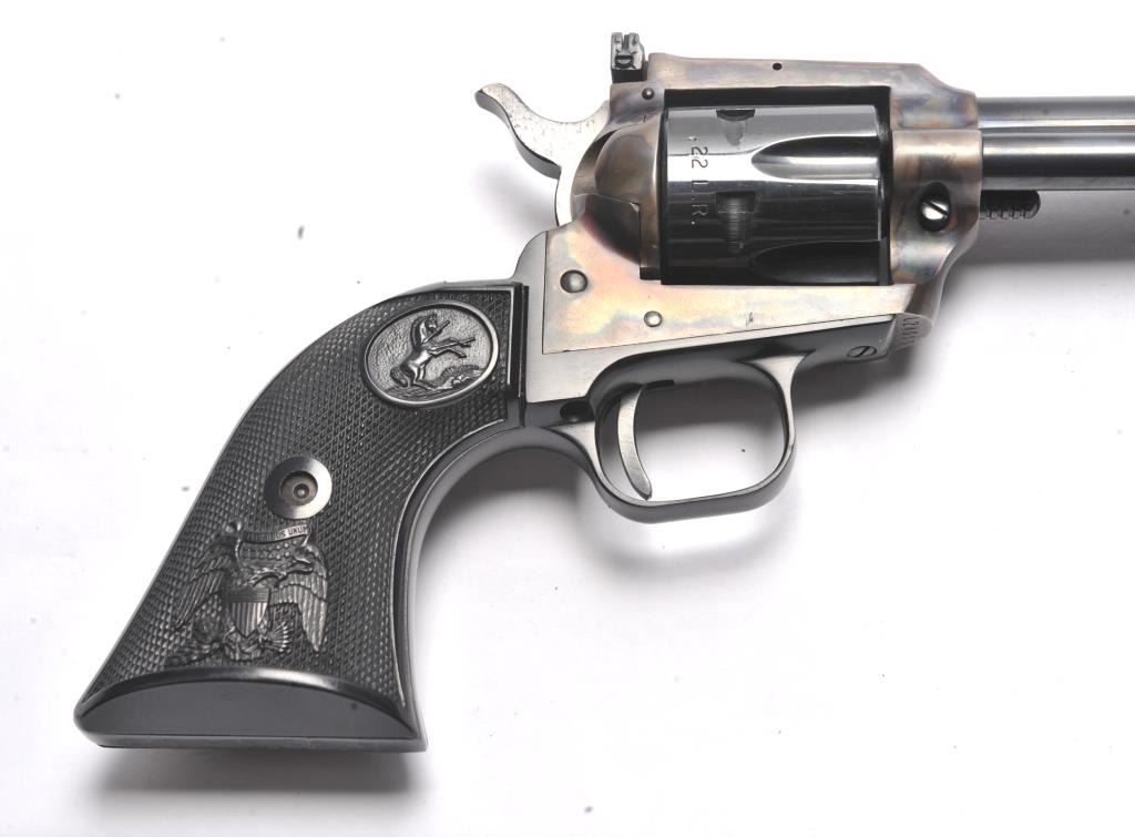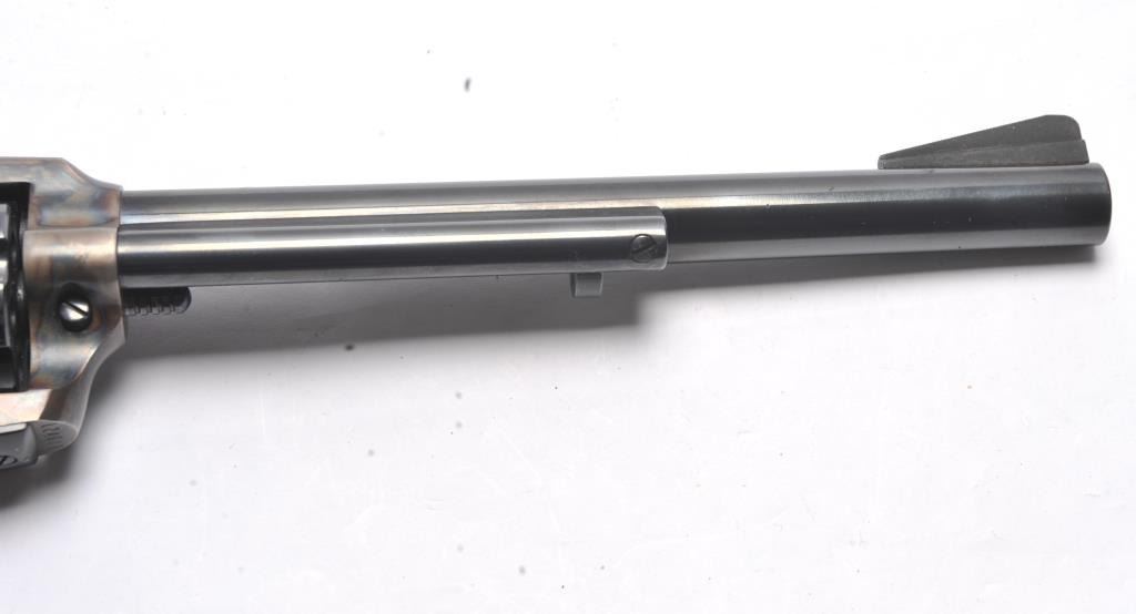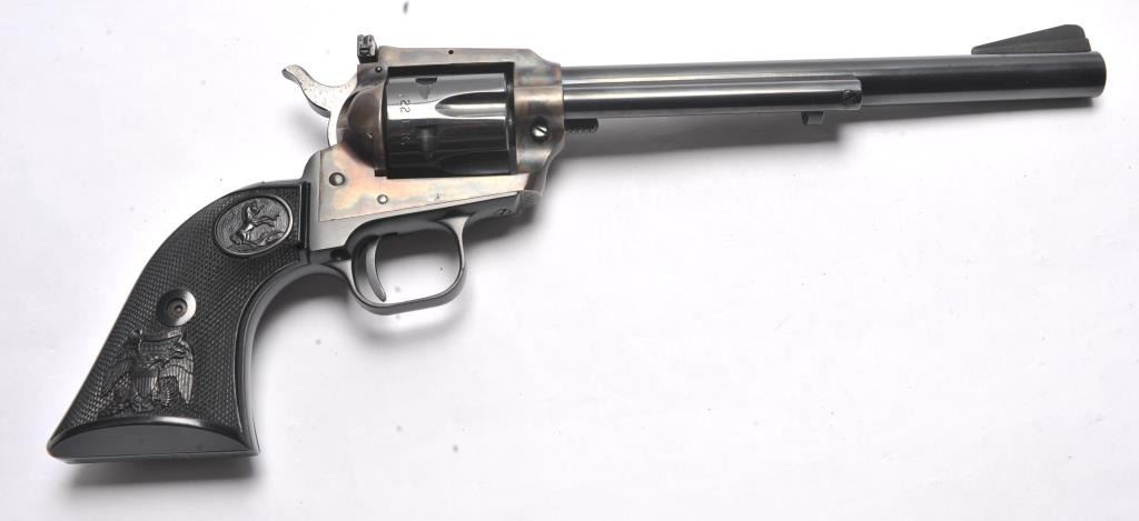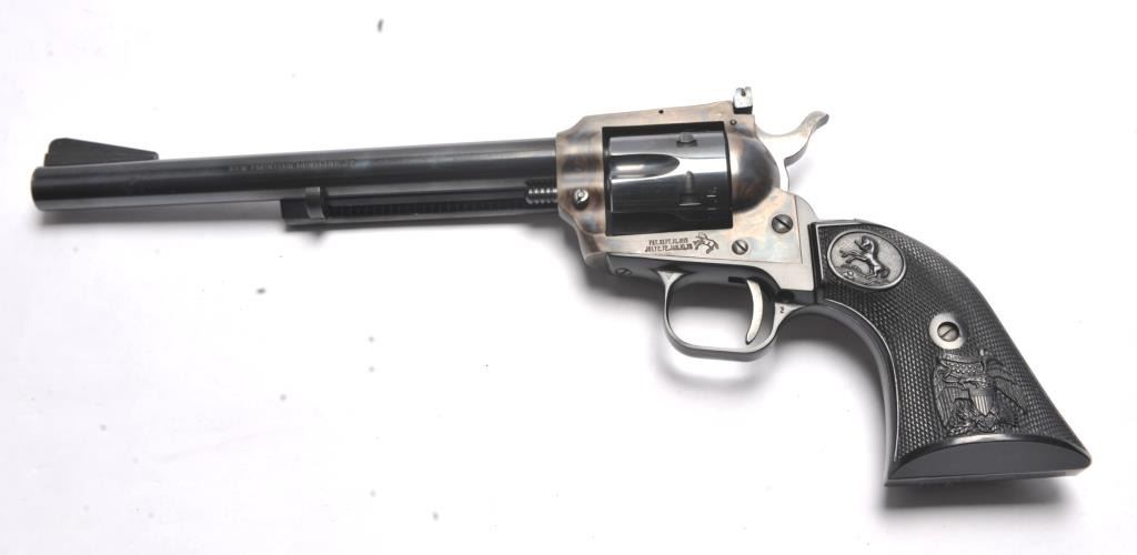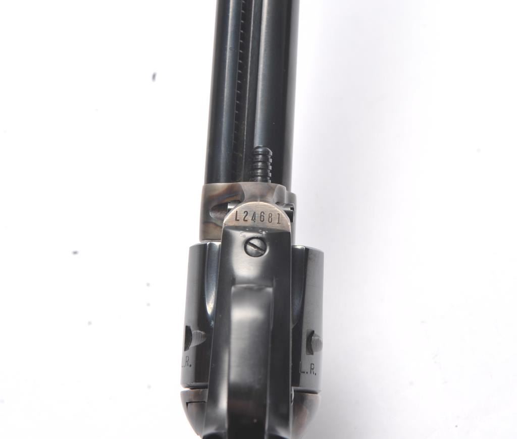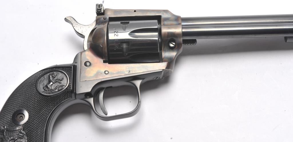 Colt New Frontier Buntline SA revolver, .22 Long Rifle caliber, Serial #L24681. The pistol is in fine overall condition with a 7 ½” barrel. The pistol retains approximately 95-96% of the blue finish with a small areaof light surface rust near the muzzle. The frame is beautifully case colored. The checkered plastic Eagle grips are in very good condition. The bore is good and action is crisp on this desirable buntline circa1974. Est.: $600-800. (Modern/PPT).