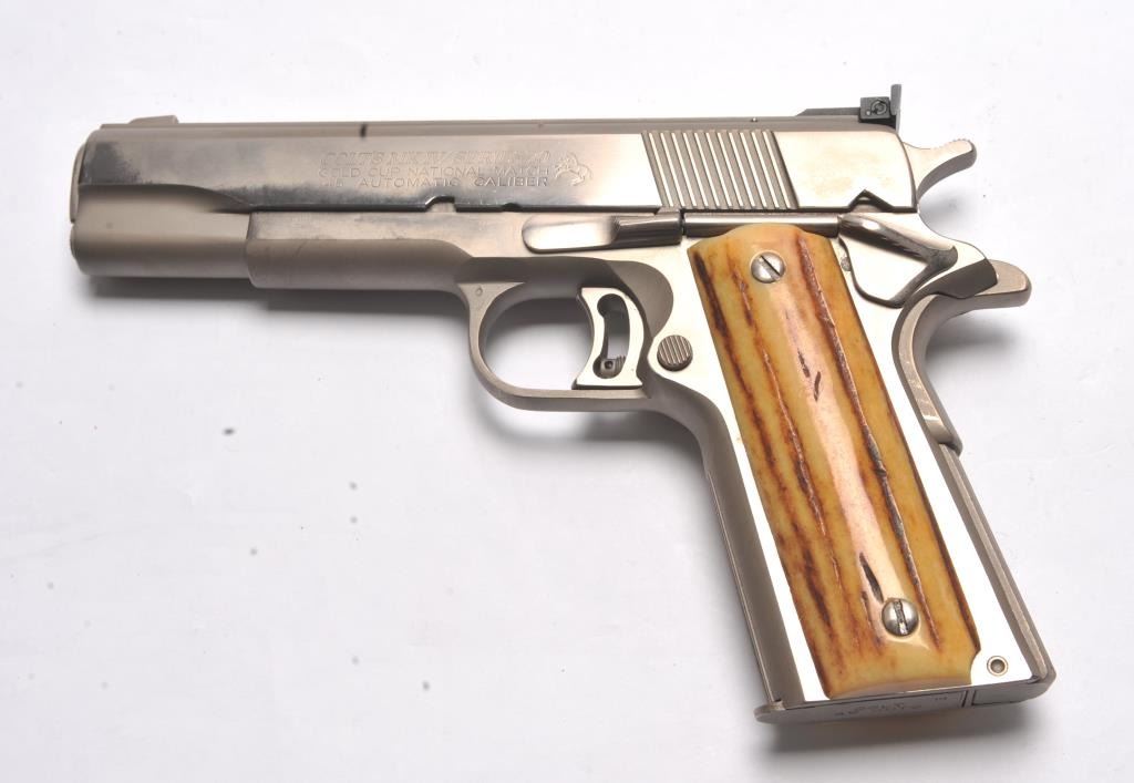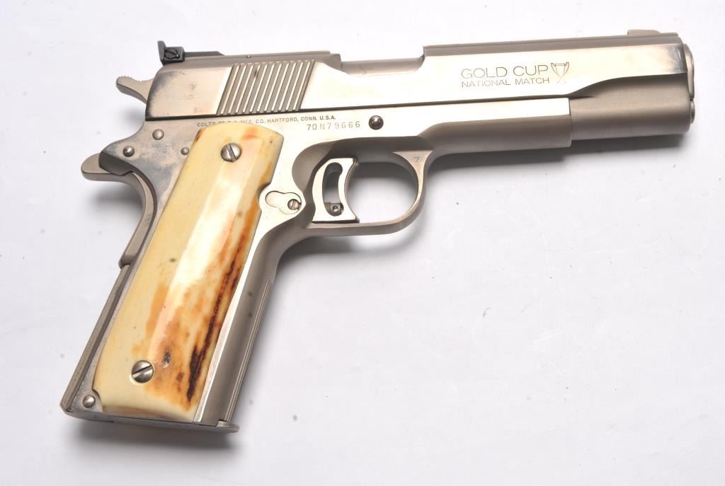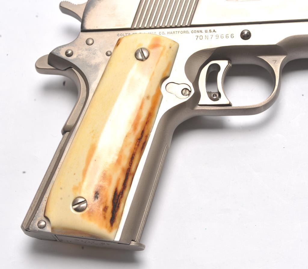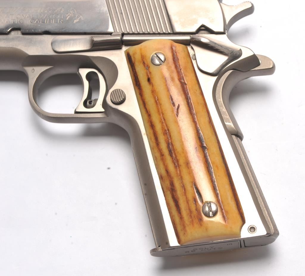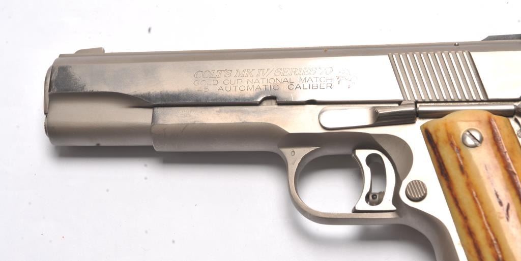 Colt MK IV Series 70 Gold Cup National Match 1911 semi-automatic pistol, .45 ACP caliber, Serial #70N79666. The pistol is in very good to near fine overall condition with a 5” barrel. The pistol retains the majority ofthe factory nickel finish with some frosting, high point edge wear and wear at the muzzle. The adjustable rear sight is marked, “ELLIASON”. The grips are custom replacements in smooth stag with nice fit and finish. The bore is good and the action is crisp. The lot includes one correct, Colt marked magazine. Original Period box with custom shop end label numbered 70N99666 is included Est.: $800-$1,600. (Modern/PPT).