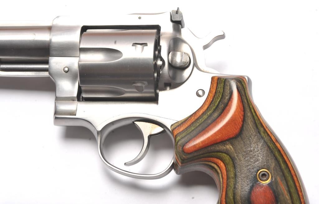 Ruger New Model Black Hawk SA revolver, .357 Magnum caliber, Serial #501-23857. The pistol is in near excellent overall condition with a 7 ½” barrel with a blade front and adjustable rear sights. The pistol retainsnearly all of the matte stainless steel finish with light storage marks. The smooth laminate wood combat grips are in excellent condition showing only light storage marks. The pistol is in the original factorycardboard box with matching end label. Est.: $400-$800. (Modern/PPT).