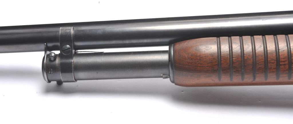 Winchester Model 12 pump shotgun, 12 gauge, Serial #1558739. The shotgun is in very good overall condition with a 30” barrel with a full-length filed rib. The shotgun retains approximately 85-90% of the thinning bluefinish with high point edge wear and scratches. The shotgun is chambered for 3” shells and choked “Full”. The smooth wood stock is in good condition with dents and compressions consistent with field use. Thebutt stock ends with a solid rubber recoil pad providing a 13 ¾” LOP. The bore is fair and the action works well. Est.: $300-$600. (C+R/PPT).