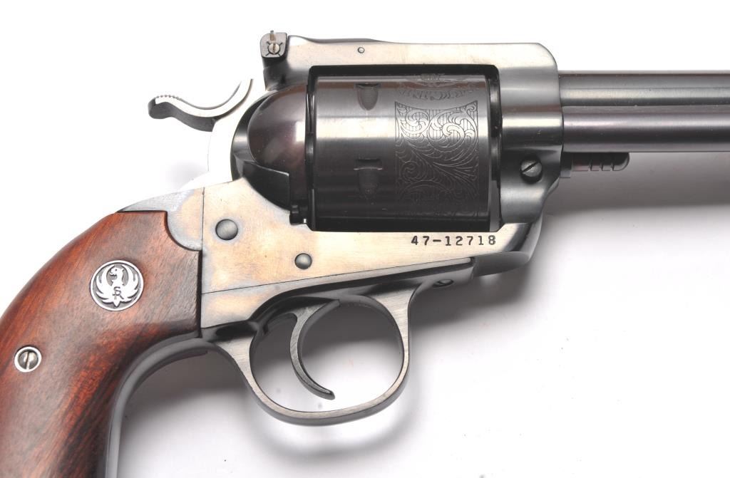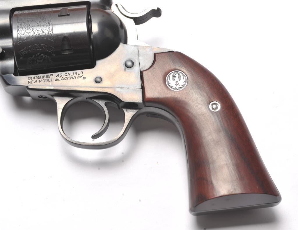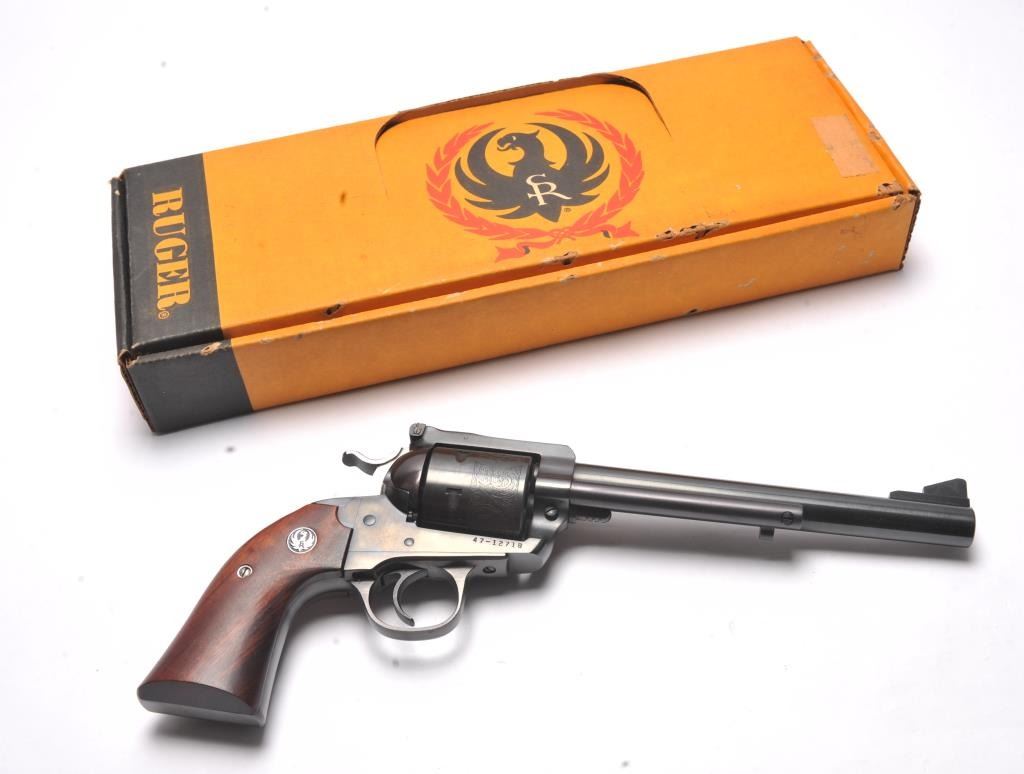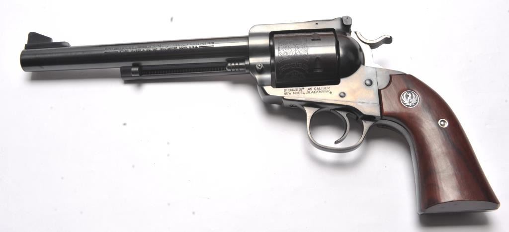 Ruger New Model Black Hawk SA revolver, .45 caliber, Serial #47-12718. The pistol is in near excellent overall condition with a 7 ½” barrel with a ramped blade front and adjustable rear sights. The pistol retainsnearly all of the blue finish with light handling marks. The smooth wood medallion grips are in excellent condition showing little use. The pistol is in the original factory cardboard box with matching endlabel. Est.: $300-$500. (Modern/PPT).