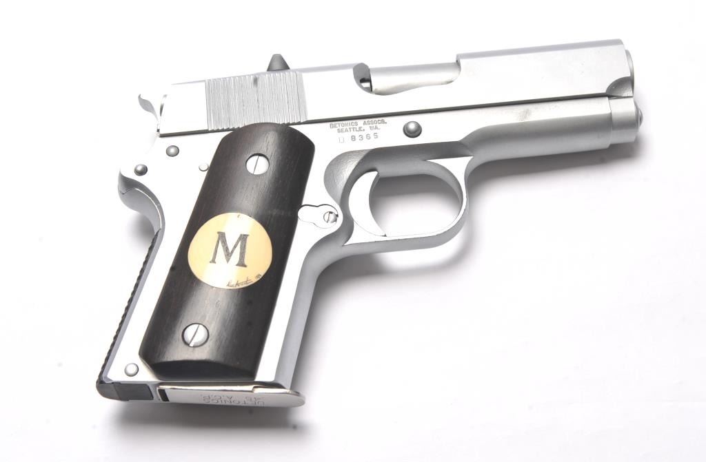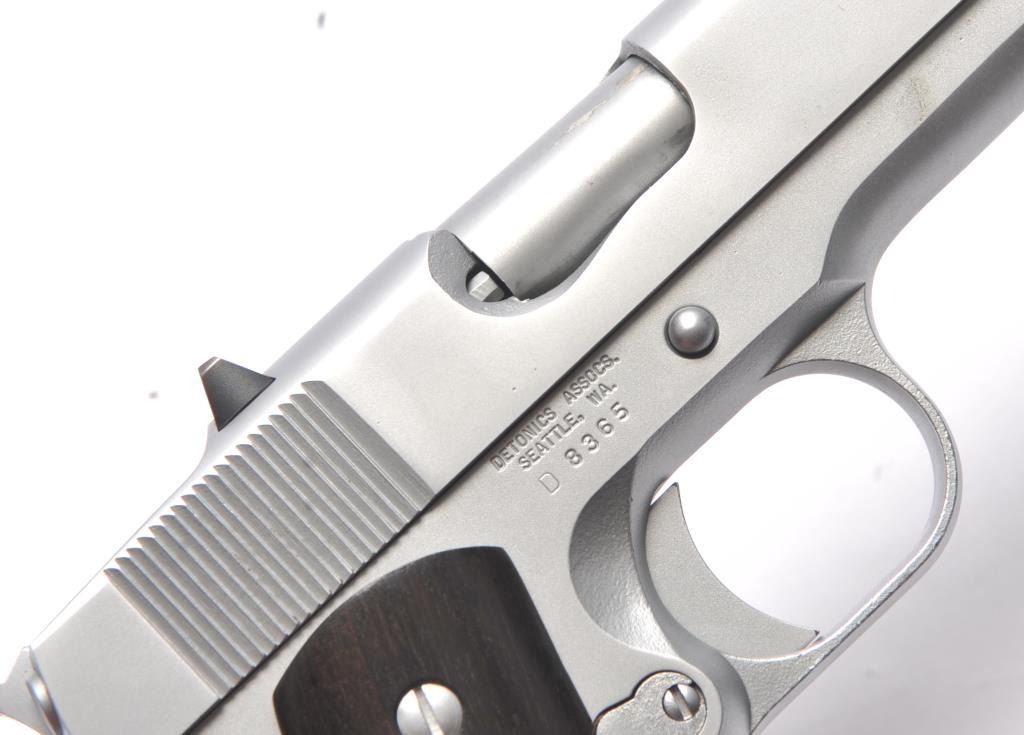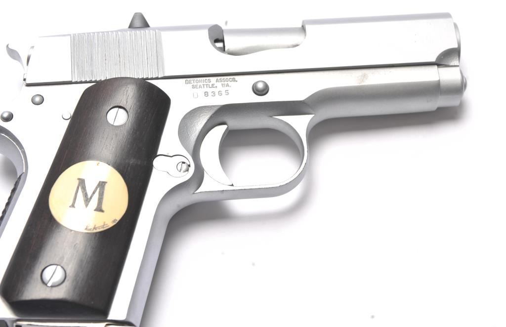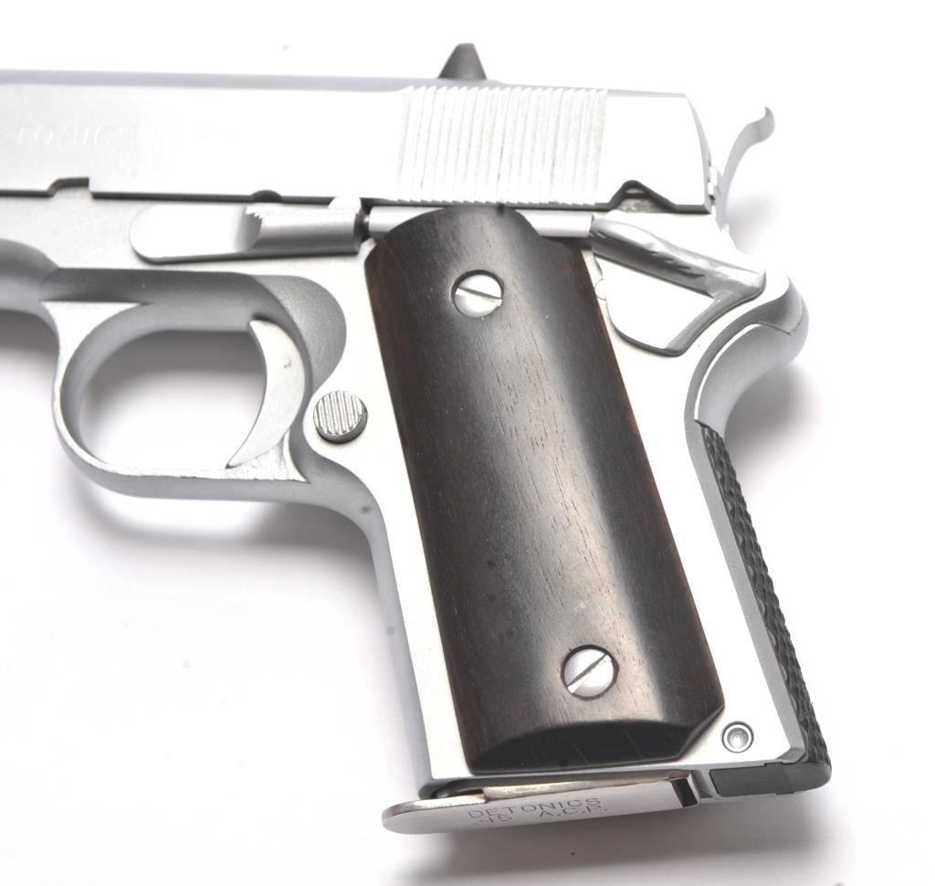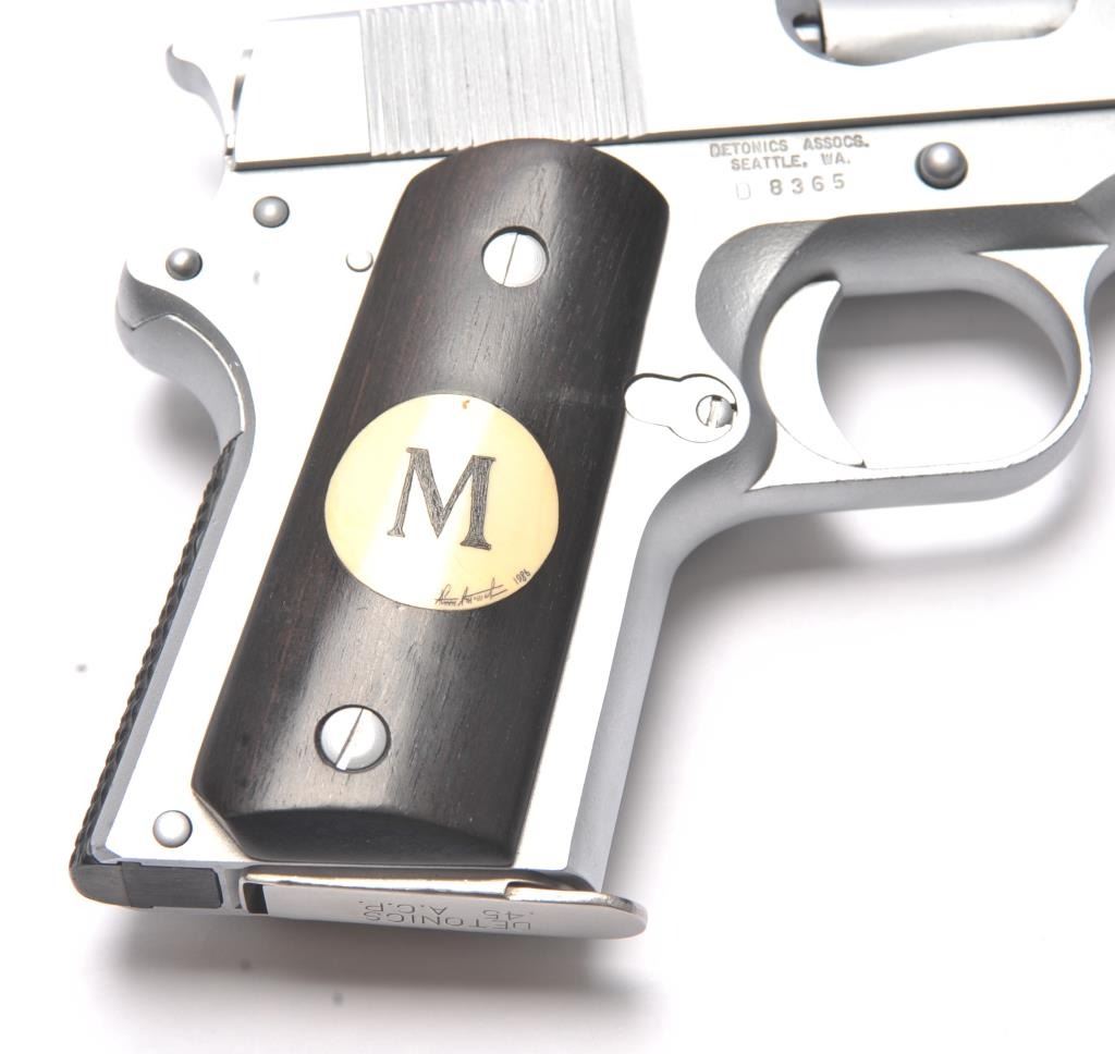 Detonics semi-automatic pistol, .45 ACP caliber, Serial #D8365. The pistol is in very good overall condition as lightly refinished with a 3 ½” barrel. The pistol retains a significant amount of mattestainless steel finish, the slide having been refinished. The smooth wood grips are in very good condition with inlay on the right grip and a checkered rubber back strap. The bore is good and the action is crisp. Thelot includes one Detonics marked magazine. Est.: $500-$1,000). (Modern/PPT).