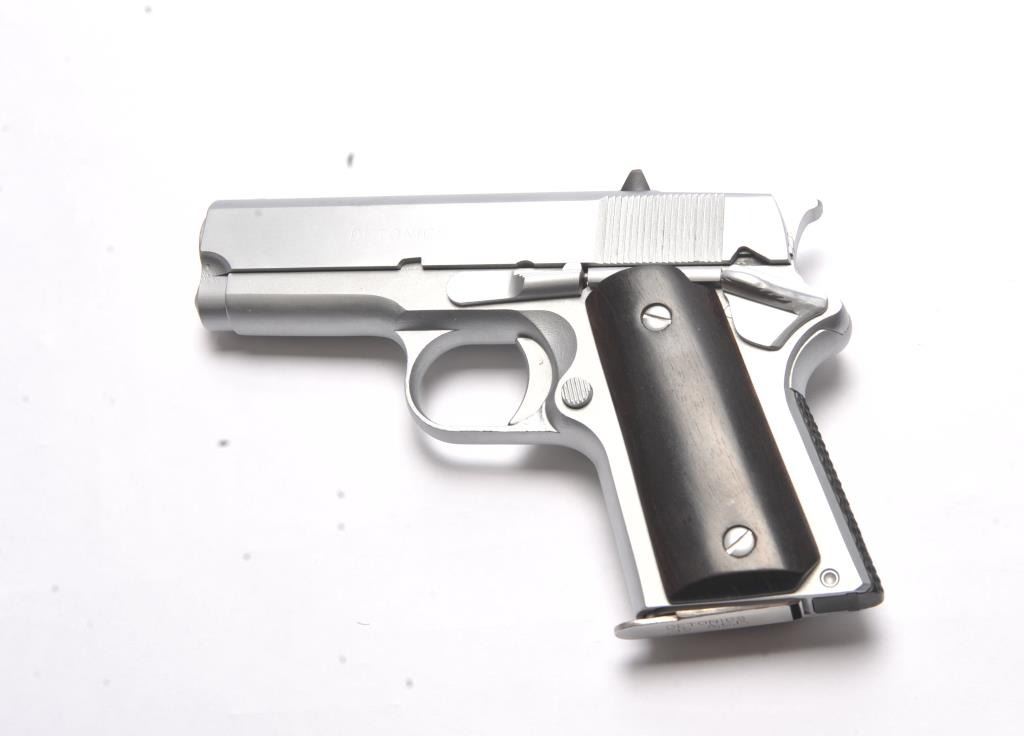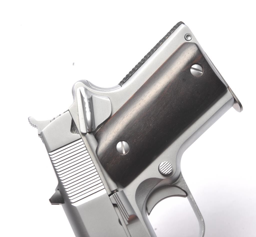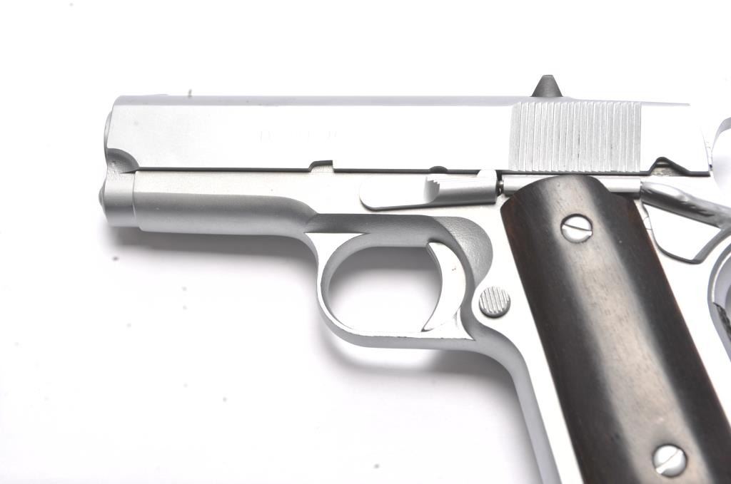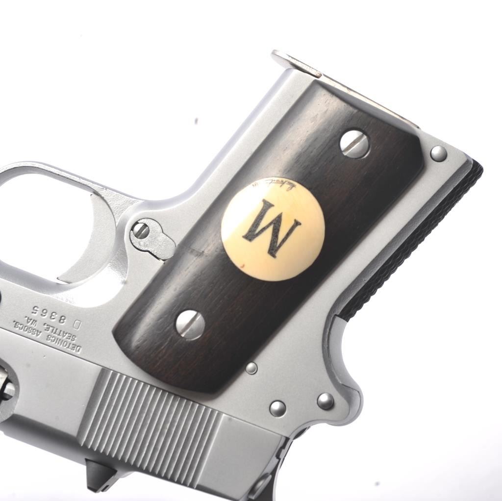 Detonics semi-automatic pistol, .45 ACP caliber, Serial #D8365. The pistol is in very good overall condition as lightly refinished with a 3 ½” barrel. The pistol retains a significant amount of mattestainless steel finish, the slide having been refinished. The smooth wood grips are in very good condition with inlay on the right grip and a checkered rubber back strap. The bore is good and the action is crisp. Thelot includes one Detonics marked magazine. Est.: $500-$1,000). (Modern/PPT).