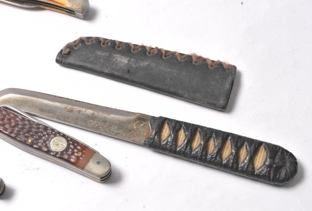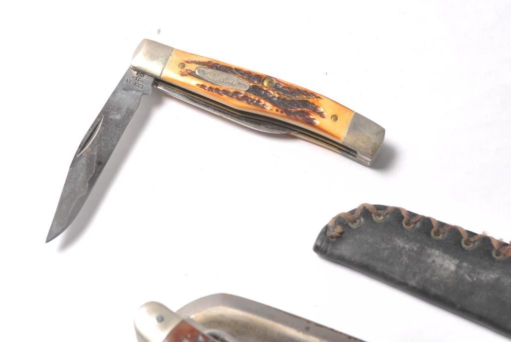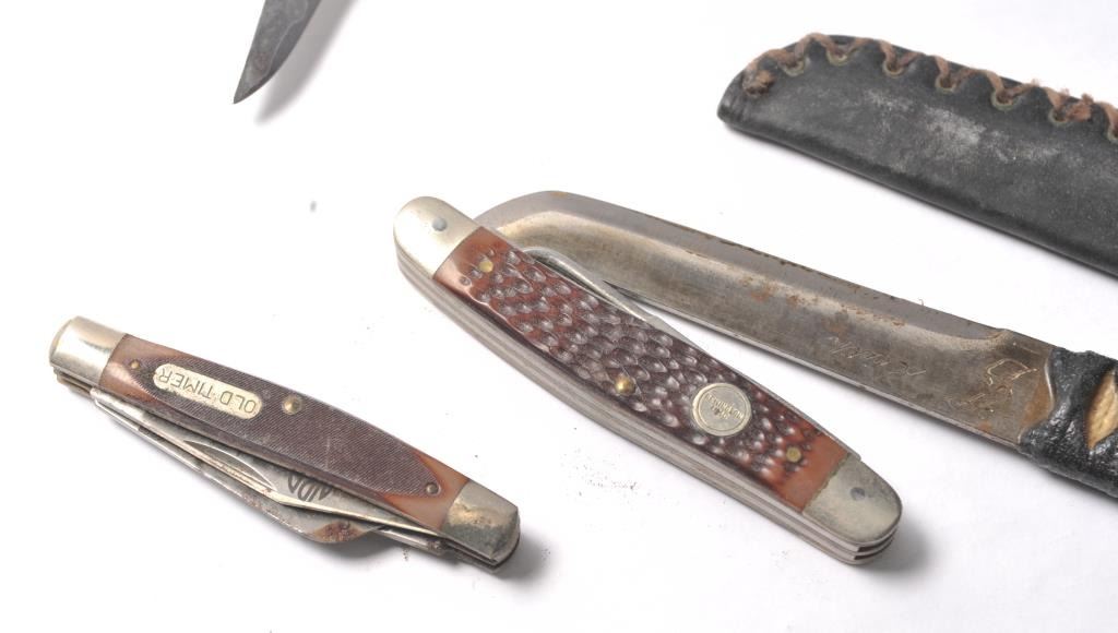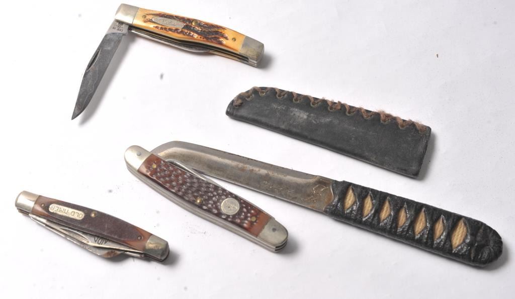 Lot of four knives, three folding and one fixed blade. The lot includes a UMC Remington marked folder with a jigged bone handle, an Old Timer folding and a Case folder with stag scales. The fourth knife is a small Tanto measuring 7 ½” in length with a 3 ½” blade marked, “Keith” on the blade. Est.: $80-$160.