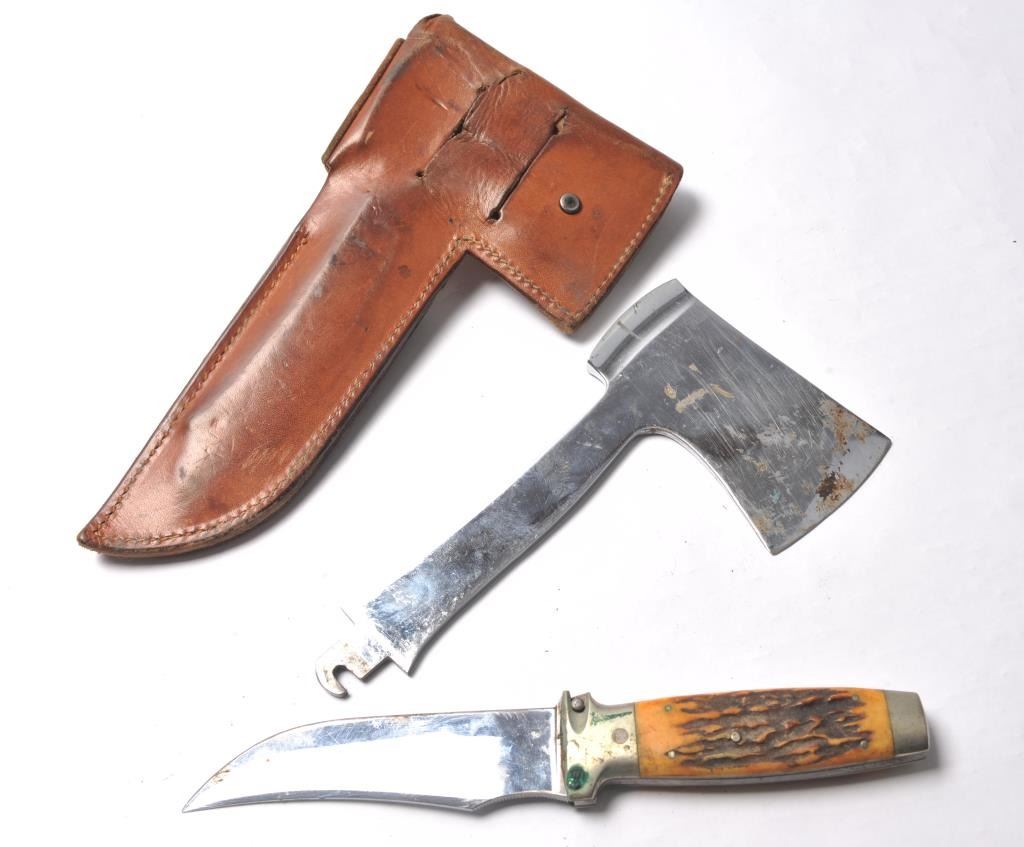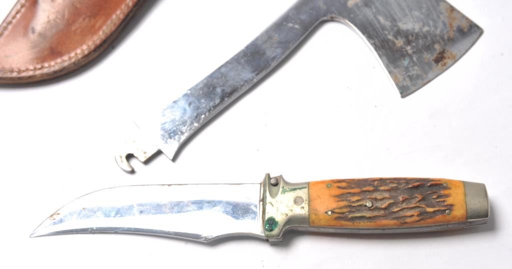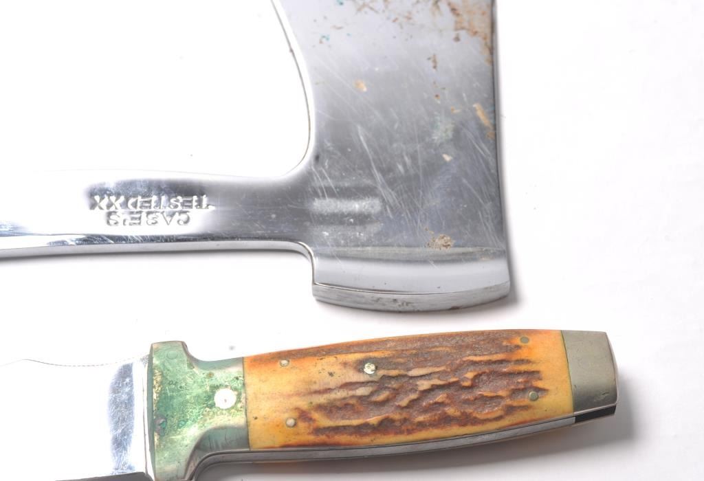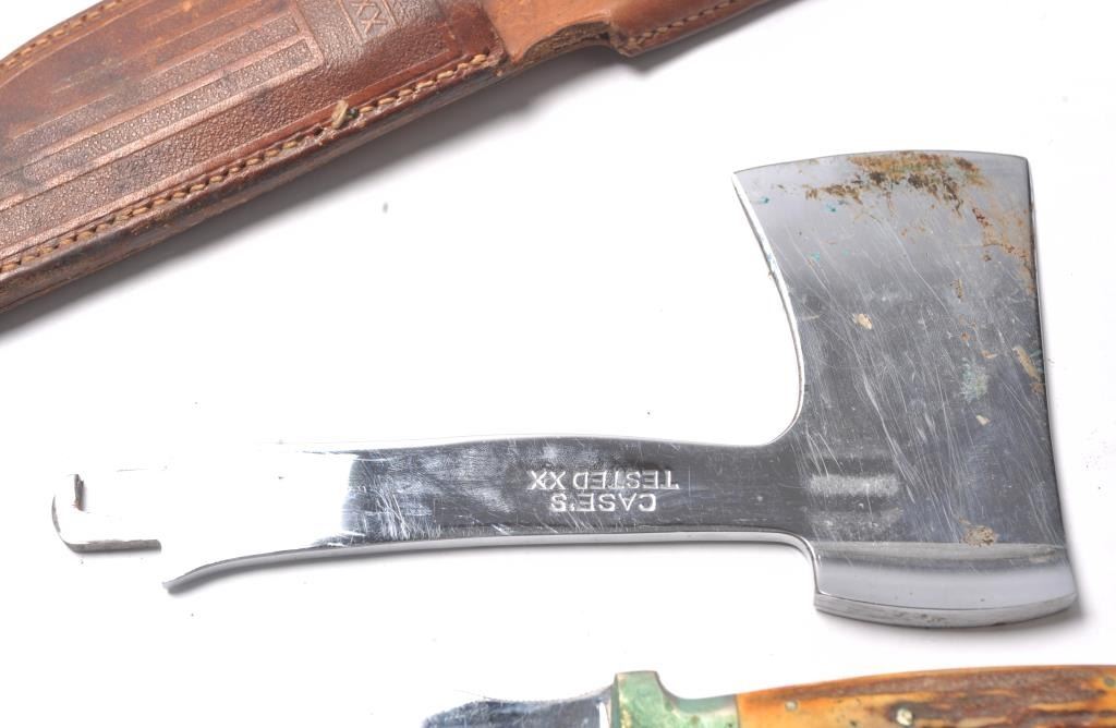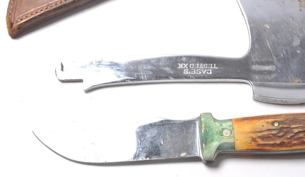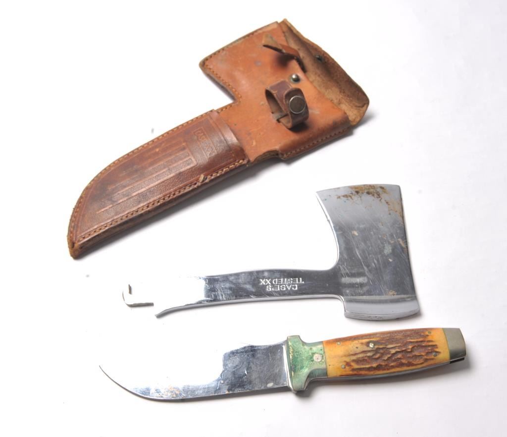 CASE XX combination knife and axe with genuine stag handle. The knife is 9 ¼” long with a 10 ¾” axe head and handle that interchanges. The set includes a genuine leather Case XX sheath. The five pin stagscales are in very good condition. Case produced the set from 1940 until 1964. Est.: $150-$300.