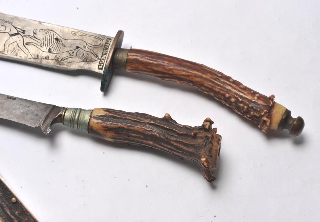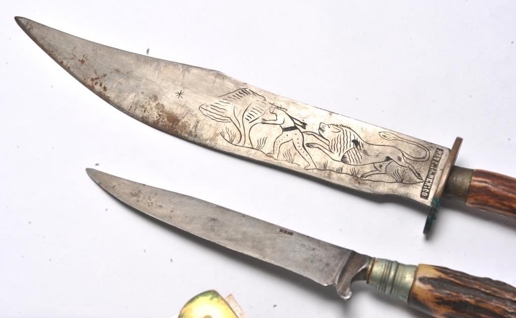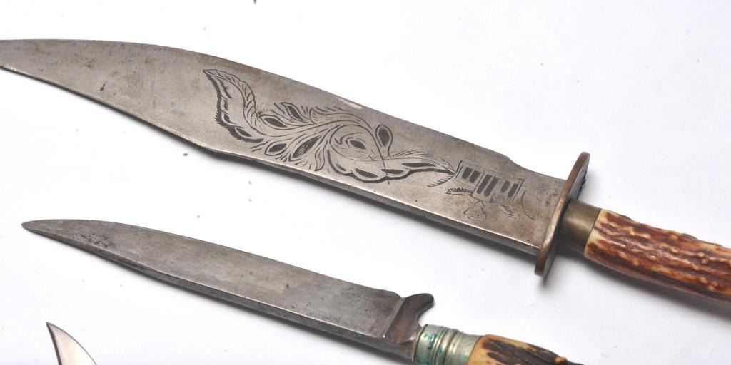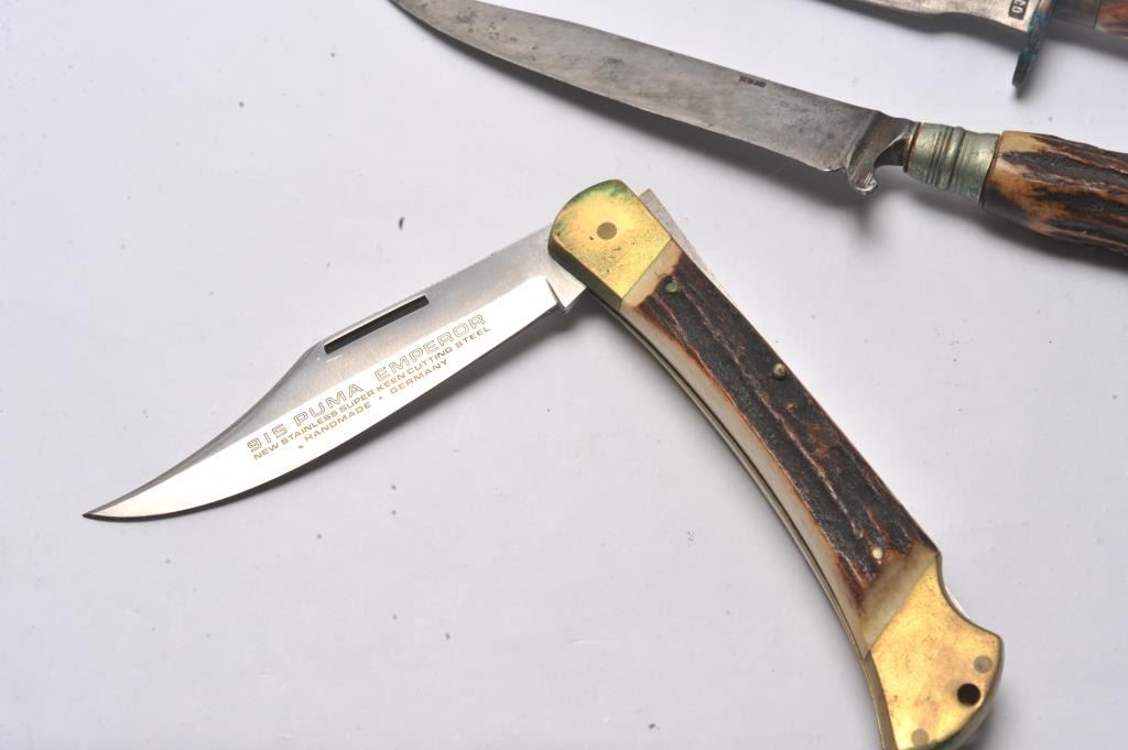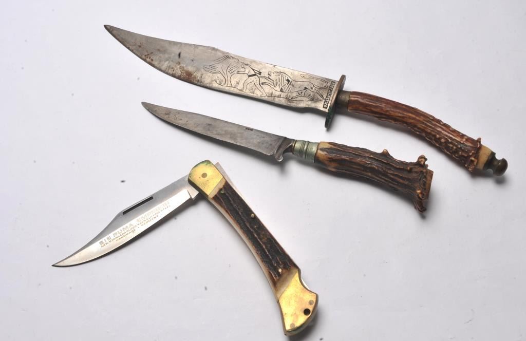 Lot of three knives, two fixed blade and one folding. The fixed blade knives are 9” and 14” in length each with stag handles. One is marked, “MADE IN MEXICO”. The third is a Model 915 Puma Emperor, 9 ¾” in total lengthwith a 4 ½” blade with brass hardware and three pin stag scales. Est.: $150-$300.