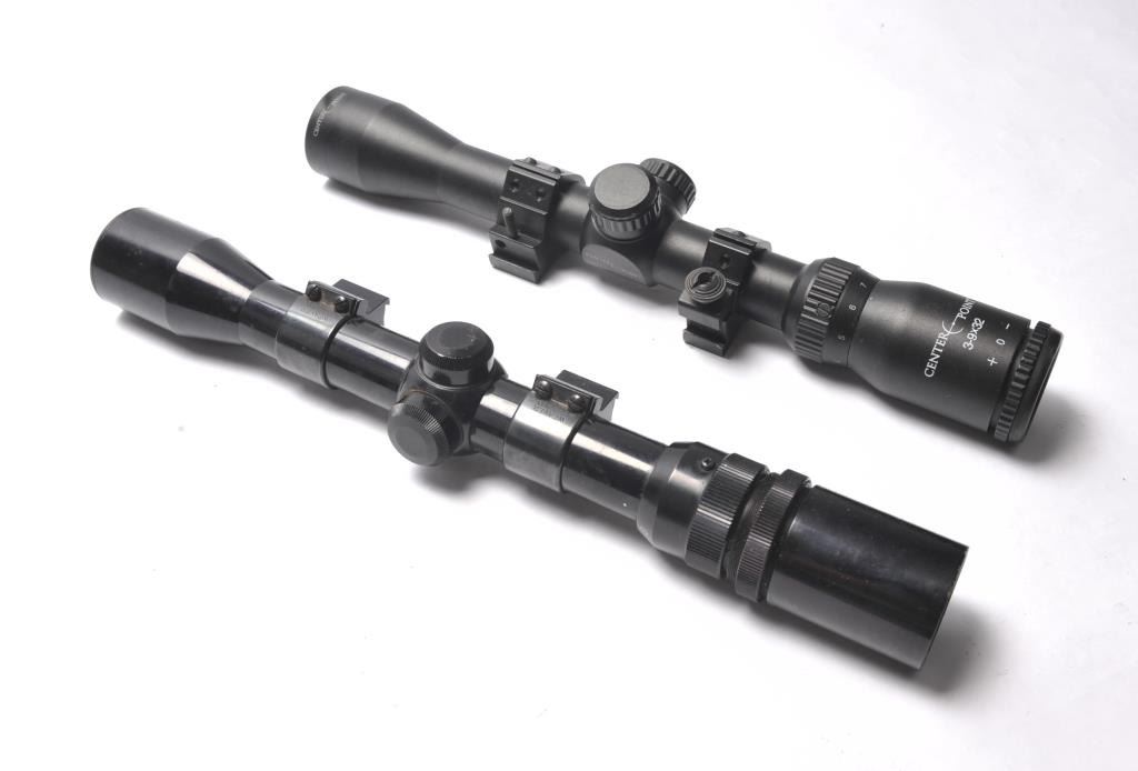 Lot of two rifle scopes. The lot includes a Center Point 3 x 9 x 32 variable power scope and a Bushnell Sportview 3 x 9 scope, both with clear crisp optics. Both scopes include attached Weaver style rings. Est.:$100-$200.