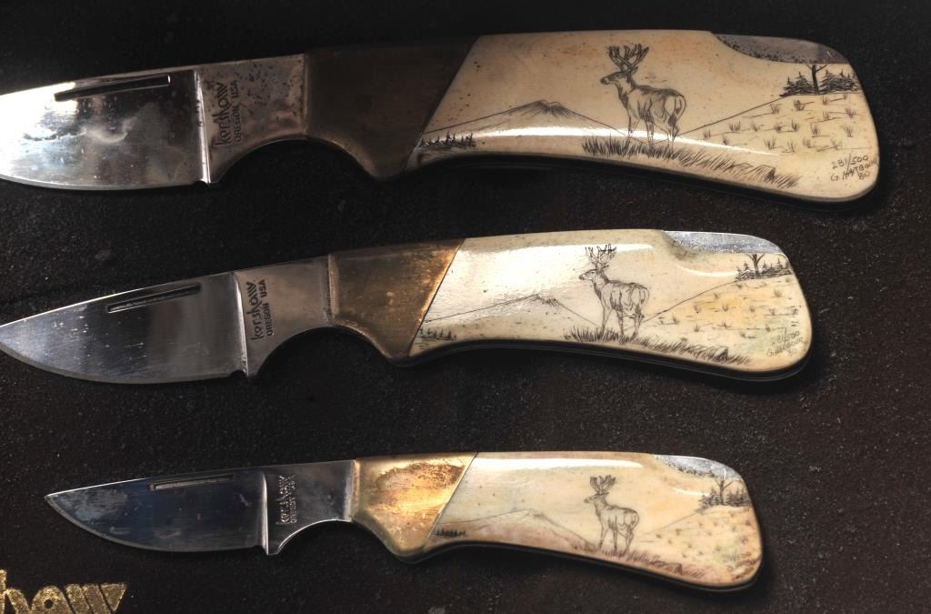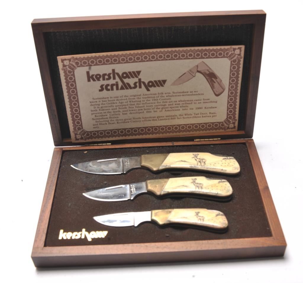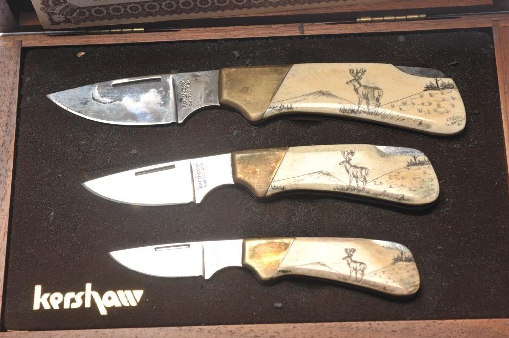 Kershaw scrimshaw folding knife set in wooden display case. The set includes three folding knives with scrimshawed scales depicting a Whitetail buck. The knives are 6 ½”, 5 ½” and 4 ½” respectively. The setcomes in a nice hardwood case with brown satin interior. The sets were limited production with only 500 sets produced. Est.: $150-$300.