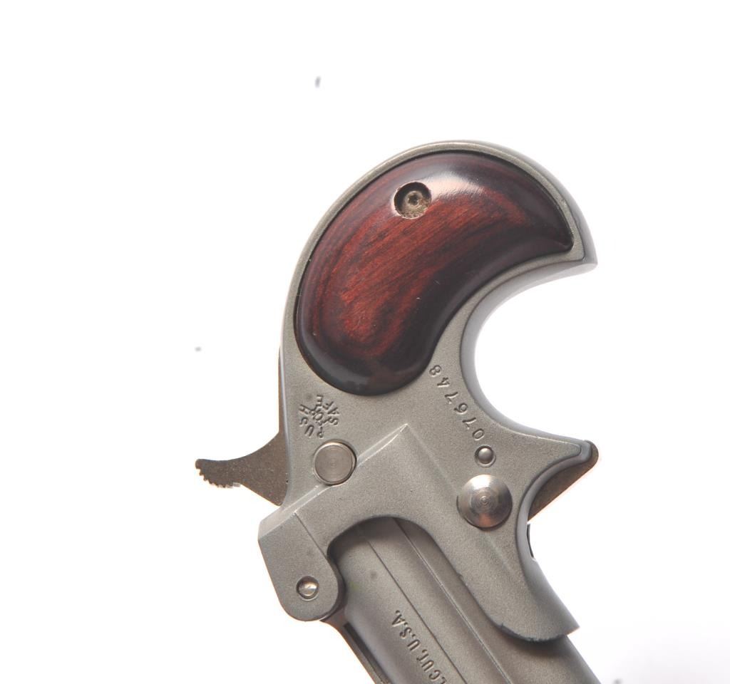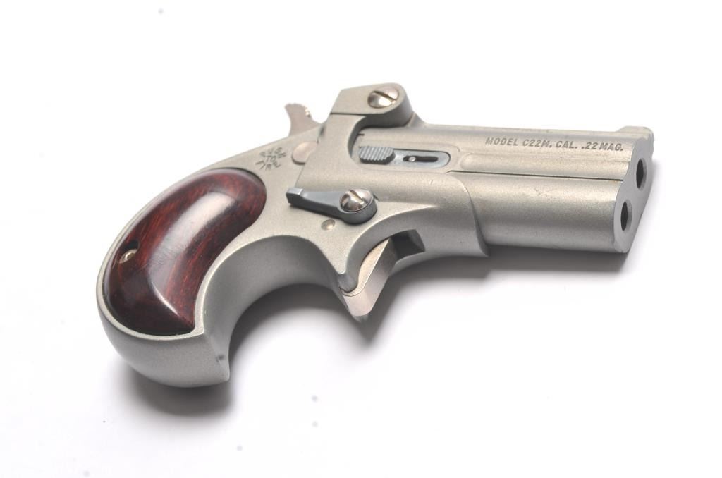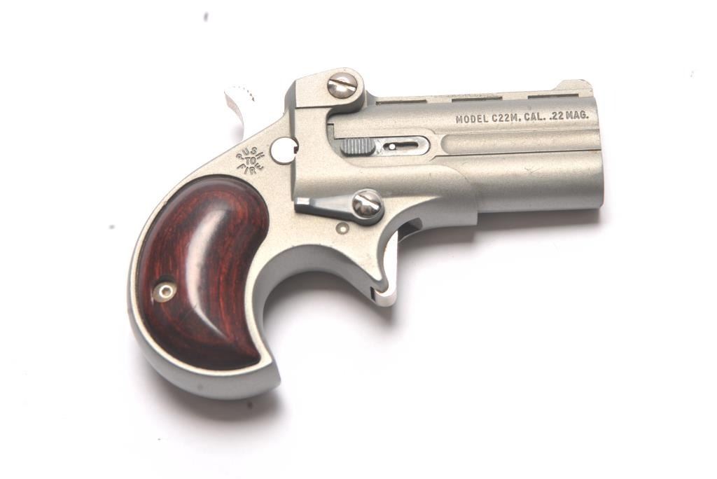 Cobra Enterprises Model 22CM O/U derringer, .22 Magnum caliber, Serial #076748. The pistol is in fine overall condition with 2 ¼” barrels. The pistol retains nearly all of the matte stainless finish. The smooth woodgrips are in very good condition. The bores are good and the action is crisp. Est.: $150-$300. (Modern/PPT).