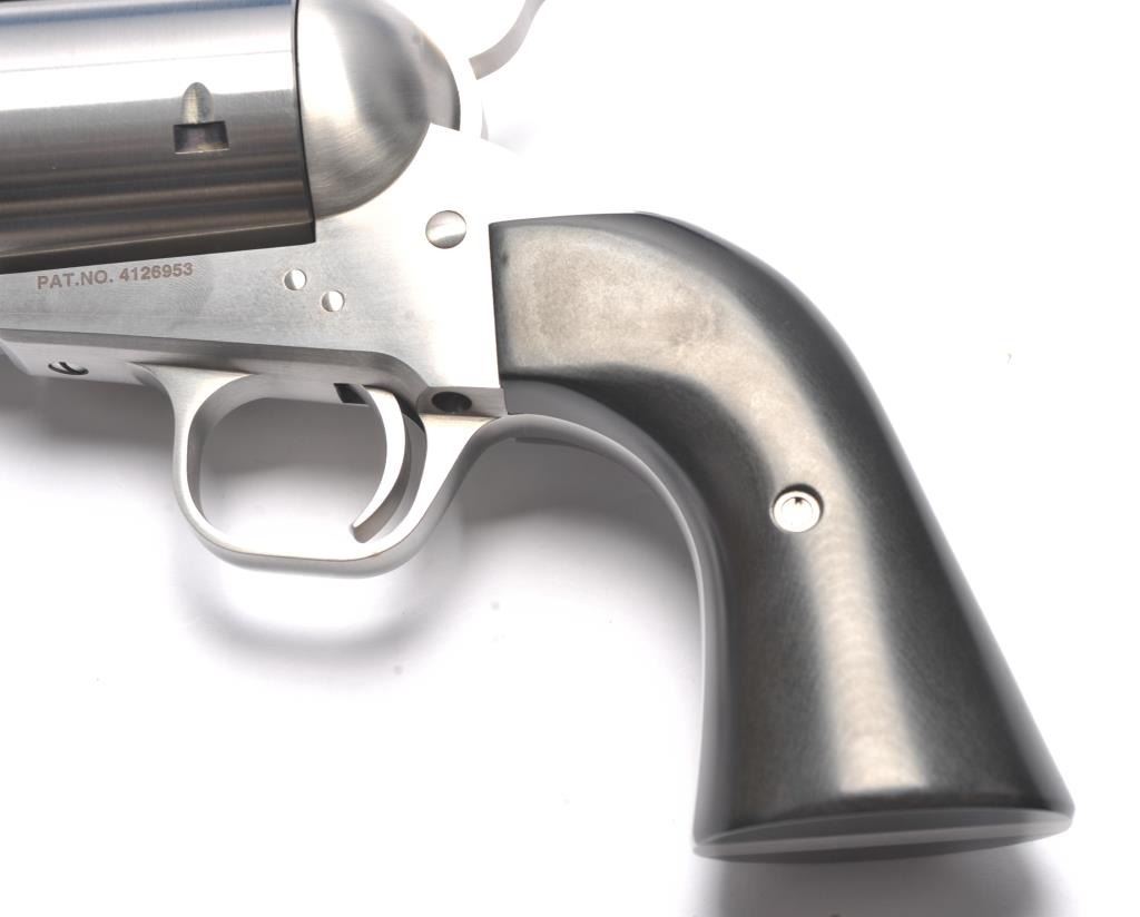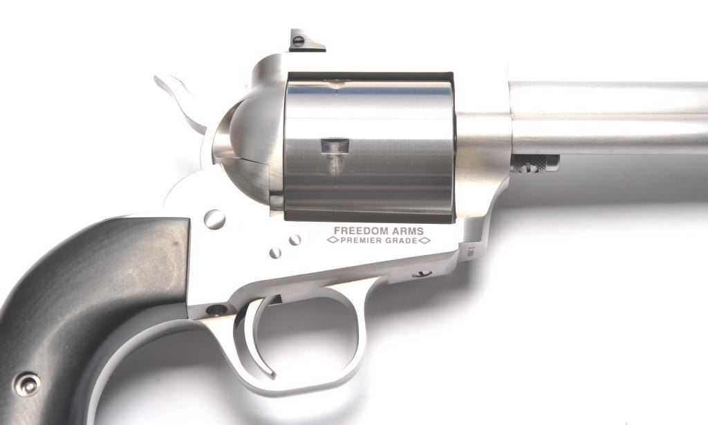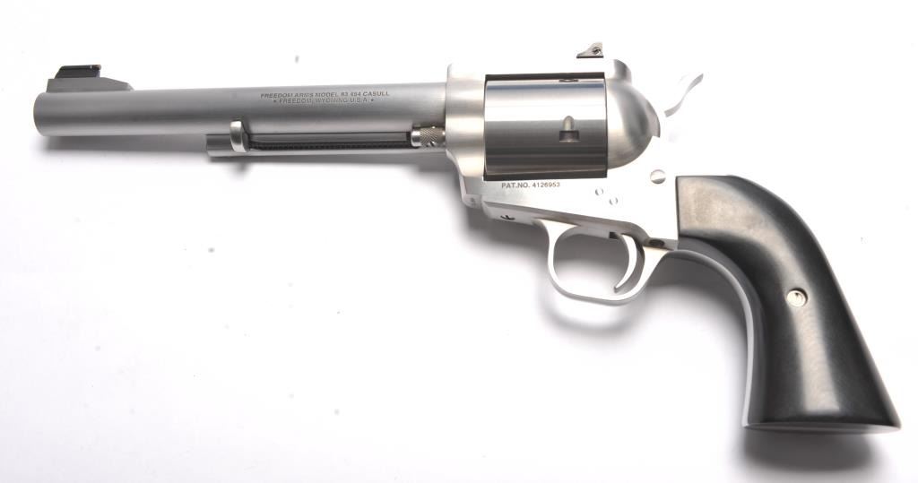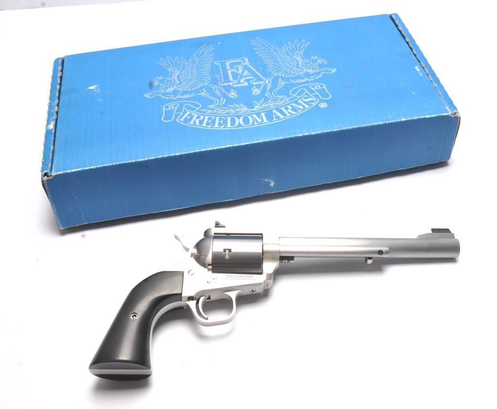 Freedom Arms Premium Grade Model 83 SA revolver, .454 Casull caliber, Serial #D19904. The pistol is as new in the factory box with a 7 ½” barrel with a blade front and adjustable rear sights. The pistolretains approximately 99% of the matte stainless finish. The smooth black Micarta grips are a special order, in excellent condition. The pistol is in the factory box with matching end label. Est.: $800-$1,400. (Modern/PPT).
