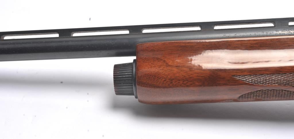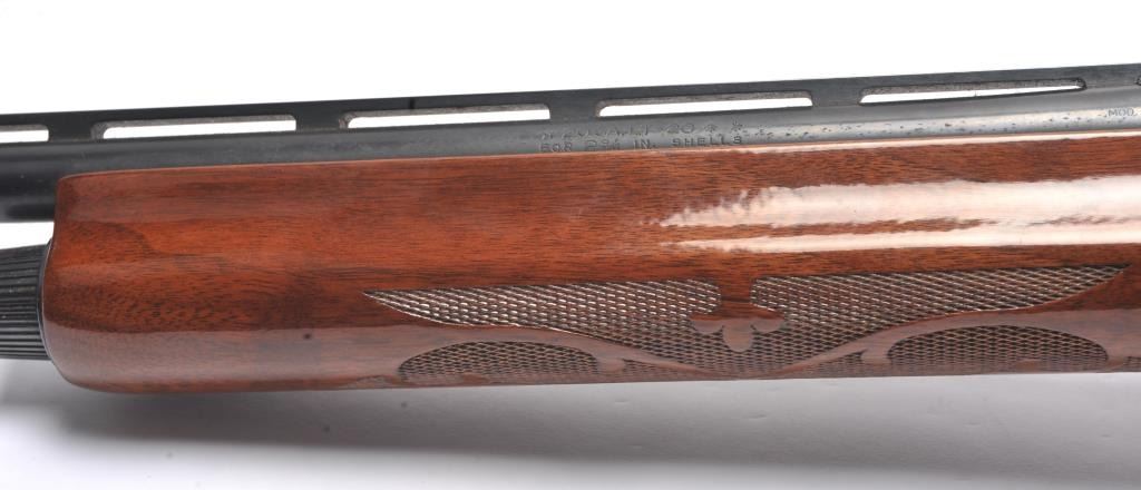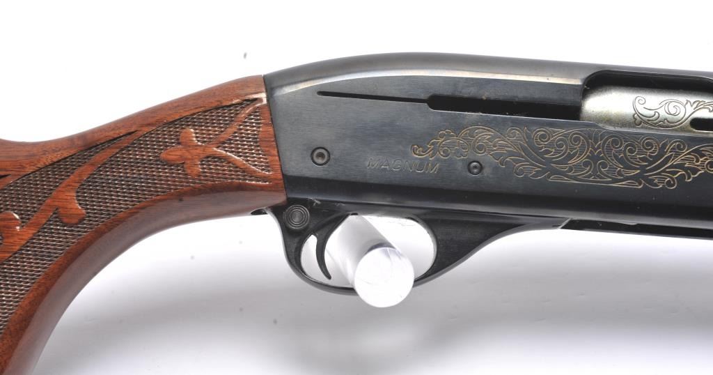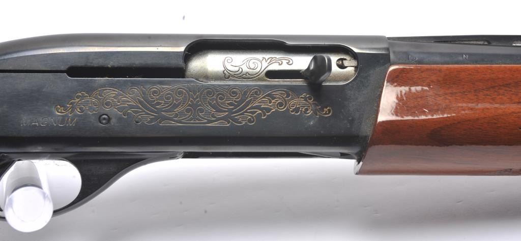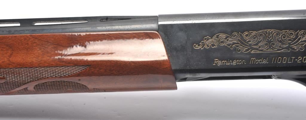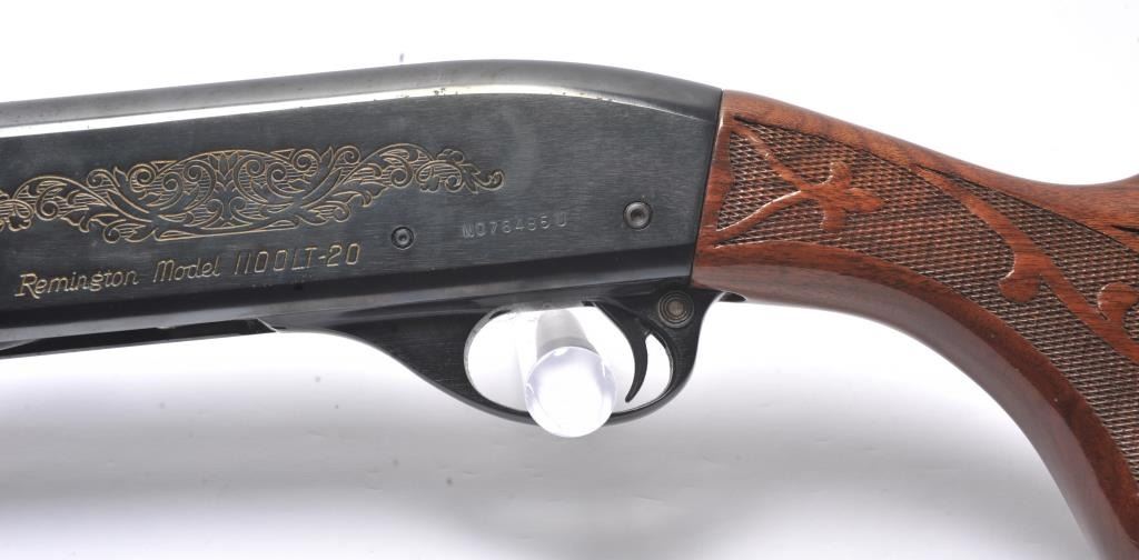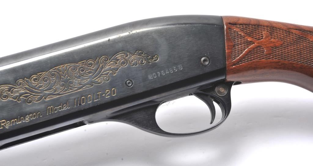 Remington Model 1100LT semi-automatic shotgun, 20 gauge, Serial #N076485U. The shotgun is in very good overall condition with a 28” barrel with a full-length ventilated rib. The shotgun retains asignificant amount of blue finish with mars and a light freckling of surface rust on the action. The receiver is lightly impress engraved and marked, “MAGNUM” on the right side of the receiver. The shotgun ischambered for 2 ¾” shells with a Modified choke. The checkered wood stock is in very good condition with a ventilated pad providing a 14 ¼” LOP. The bore is dirty and may clean to good. Est.: $300-$600.(Modern/PPT).