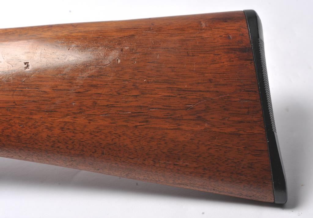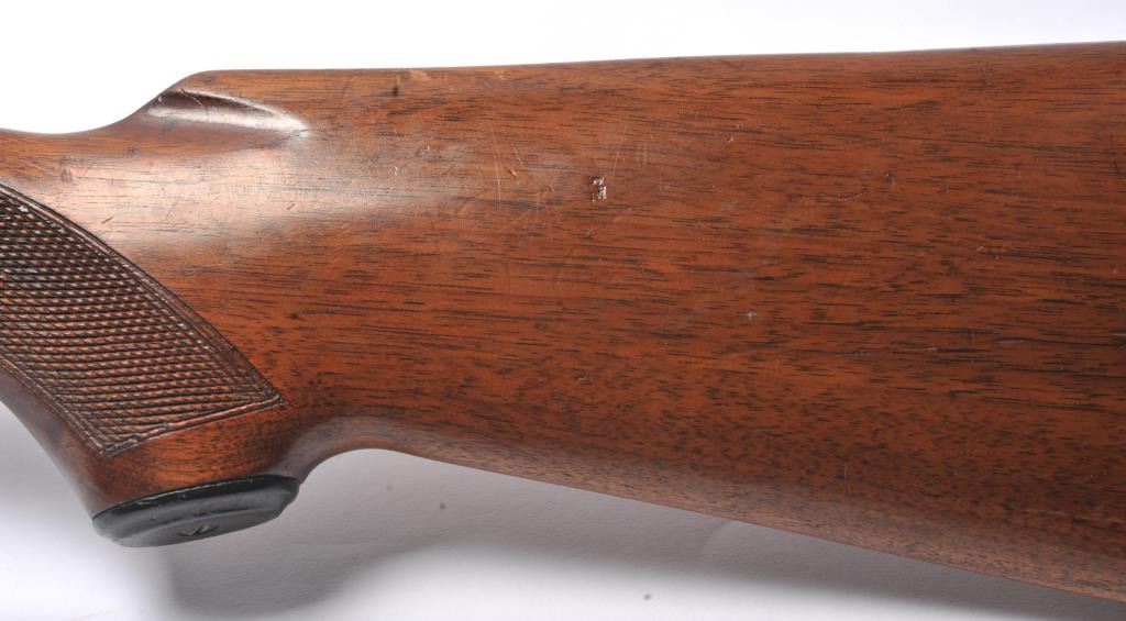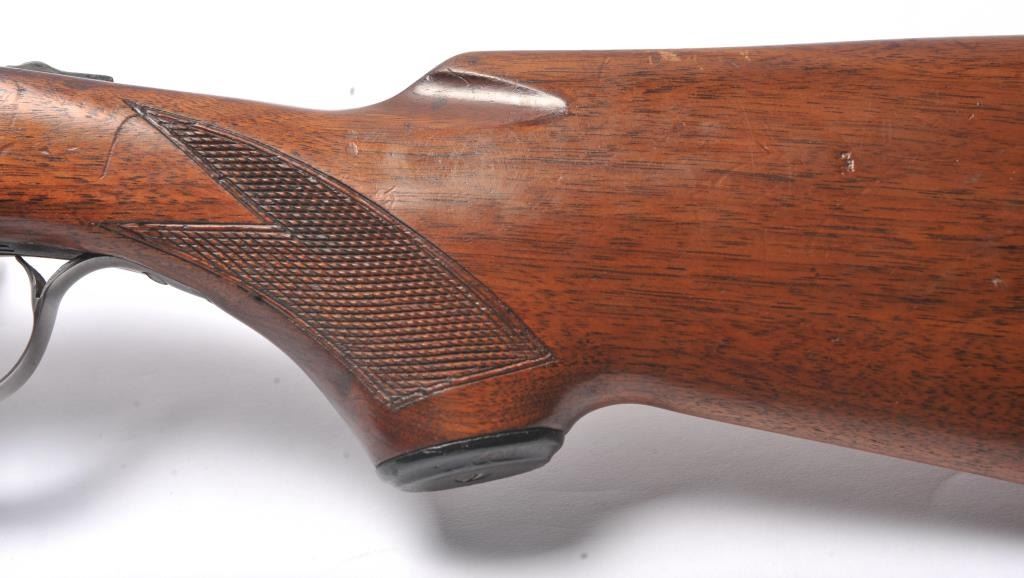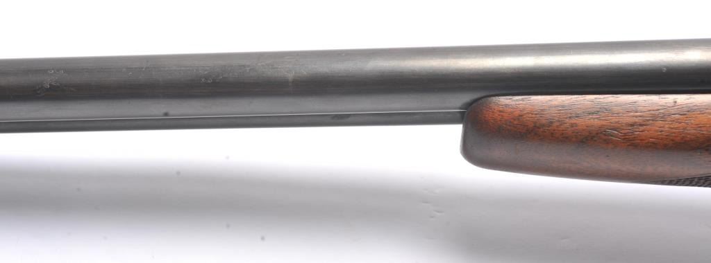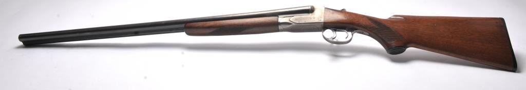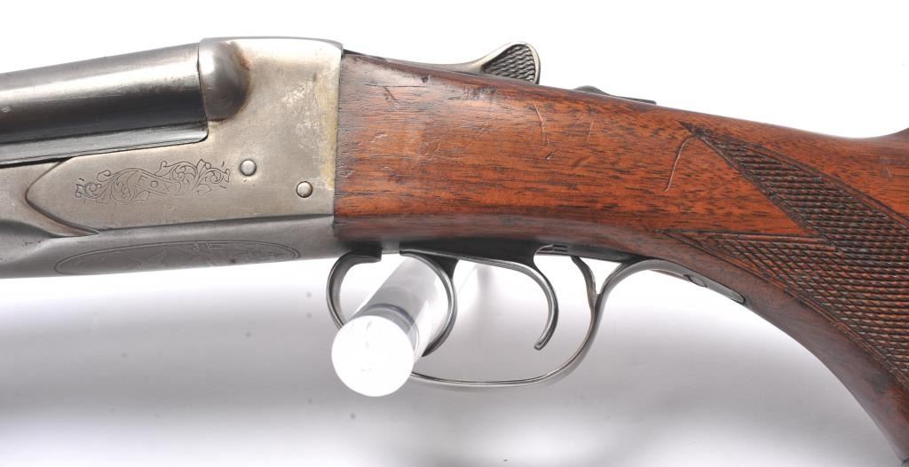 Fox Model B Side by Side shotgun, 20 gauge, Serial #NSNV. The shotgun is in good overall condition with 28” barrels. The barrels retain a significant amount of muted blue finish, while the receiver has gone tosilvered case hardening. There are double triggers and a tang mounted safety. The checkered wood stocks are in good condition with a plastic butt plate providing a 14 ¼” LOP to the front trigger. The bores aredirty and may clean to fair. Est.: $200-$400. (C+R/PPT).