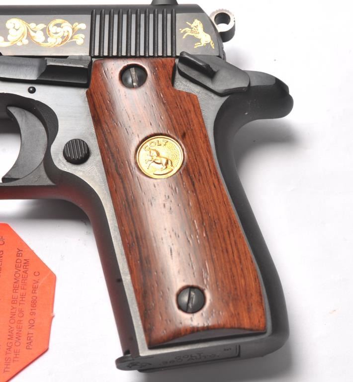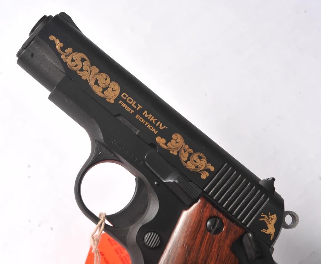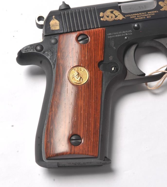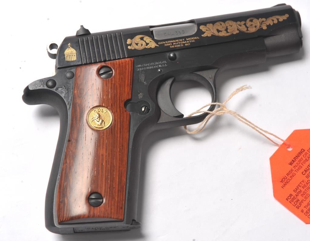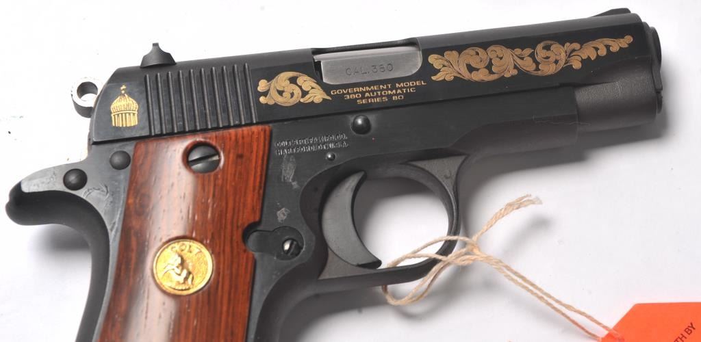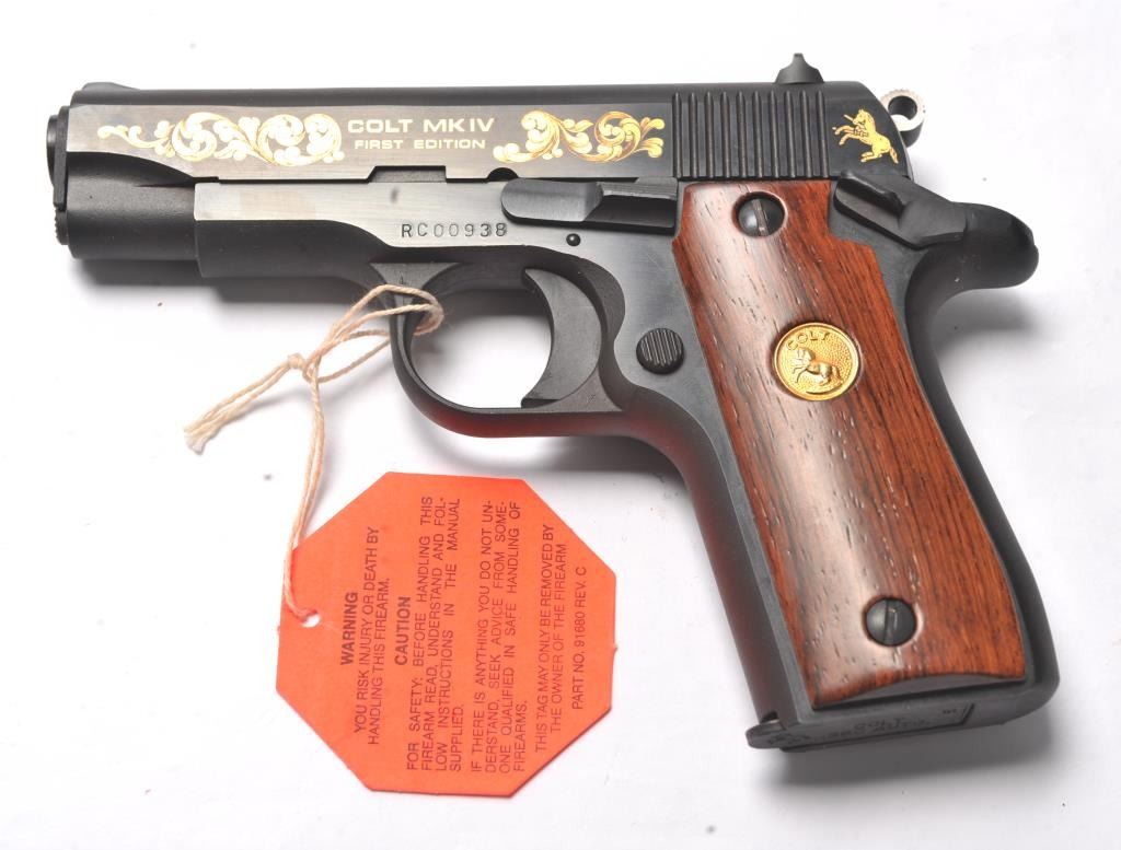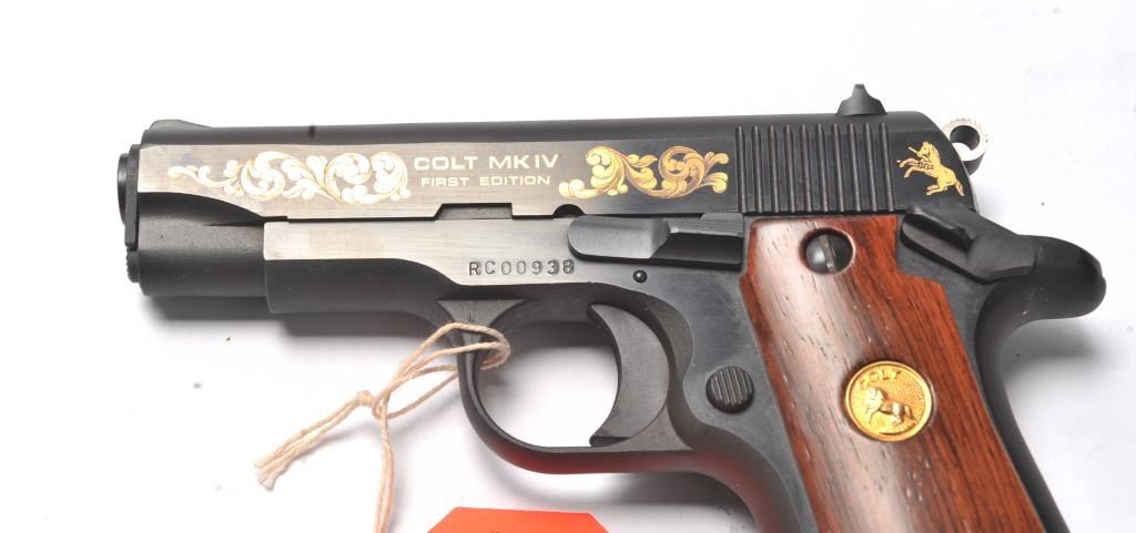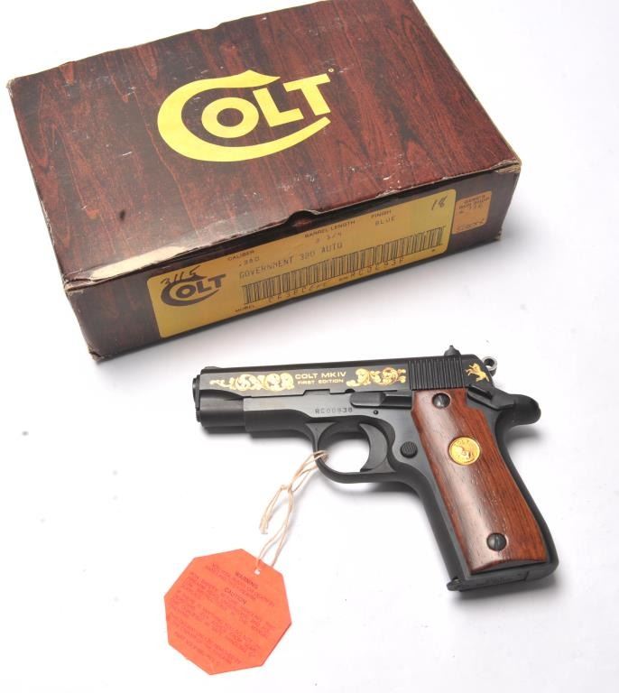 Colt MK IV First Edition Series 80 Government Model semi-automatic pistol, .380 ACP caliber, Serial #RC00938. The pistol is as new I the factory woodgrain cardboard box. The pistol has a 3 ¼” barrel with a goldinlayed slide with nice detail. The pistol retains approximately 98-99% of the blue finish. The smooth wood medallion grips are in near fine condition with light storage marks. The lot includes one correct, Coltmarked magazine. The pistol comes in the factory box with warranty cards, manual and a matching label. Est.: $1,000-$2,000. (Modern/PPT).