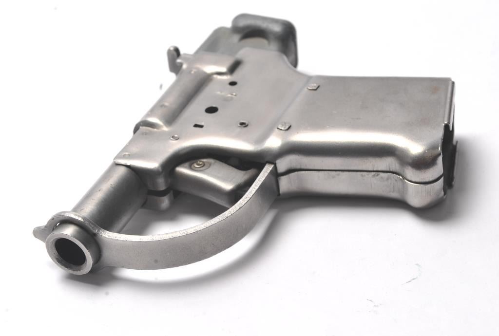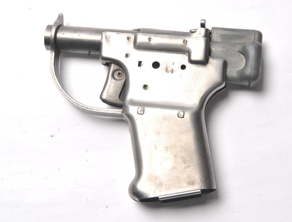 U.S. made WWII FP 45 Liberator single shot pistol, .45 caliber. This pistol was initially designed to be as cheap as possible to manufacture; they were made of stamped steel and fired a simple, single-shotmechanism with an unrifled barrel. The concept was to deliver these pistols via airdrop to resistance forces in occupied countries and be used by fighters to harass and kill German troops, taking their weapons. This example is in very good condition with no markings or numbering noted. Many of these pistols were never deployed and were subsequently destroyed. Est.: $2,000-$4,000. (C+R/PPT).