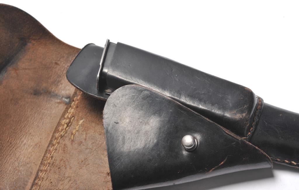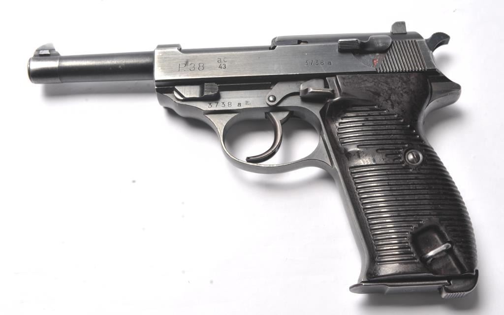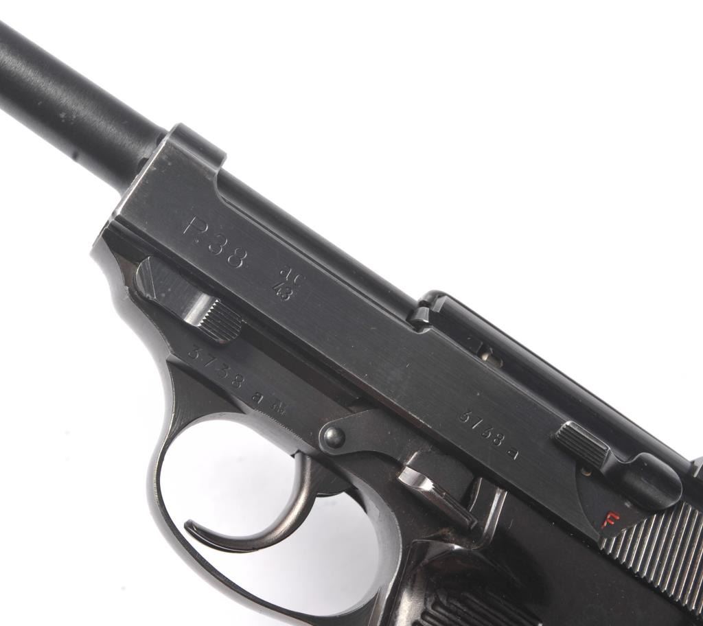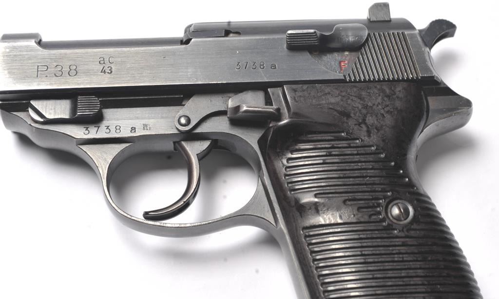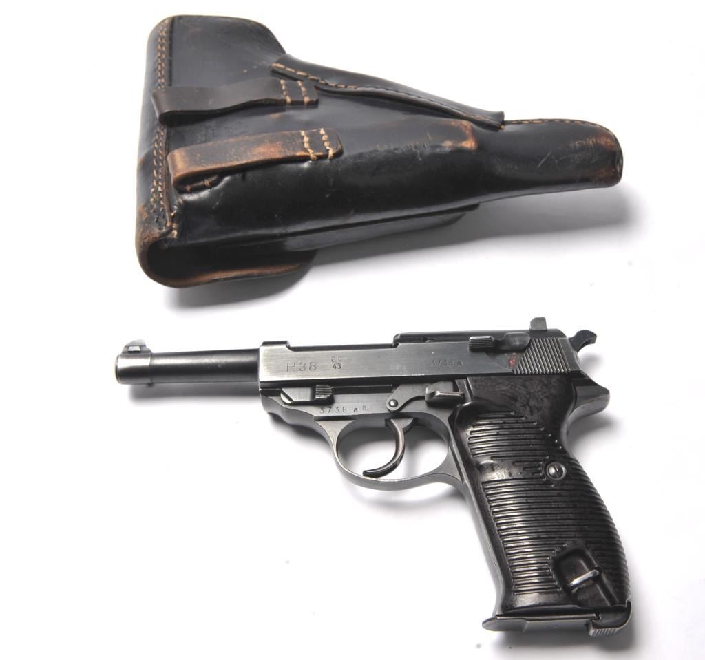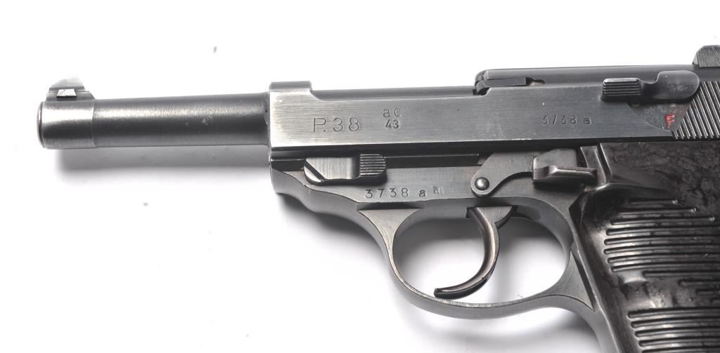 Walther P-38 semi-automatic pistol, 9mm caliber, Serial #3738a. The pistol is in near fine overall condition retaining a significant amount of military finish dated 1943. The slide and frame have numerousproofs and acceptance marks including the Waffen Eagle and other Nazi marks. The textured plastic grips are in very good condition with small mars and handling marks. The lot includes a period leather flapholster dated 1944 with a Nazi Eagle with swastika marked, “WaA159”. The holster is in good condition with scuffing some loss of finish. The lot further includes two correct magazines marked P38. The bore is good, the action is crisp and the markings are sharp on this WWII era P38 by Walther. Est.: $750-$1,500. (C+R/PPT).