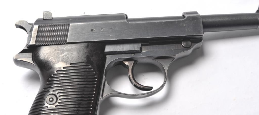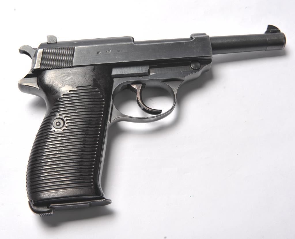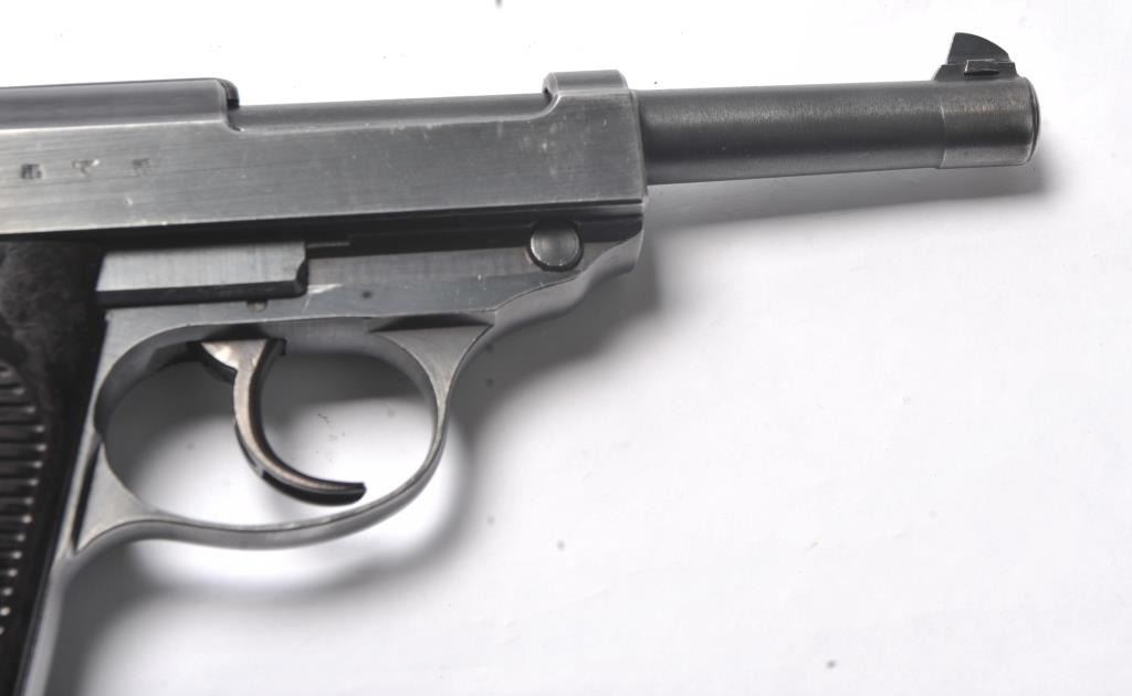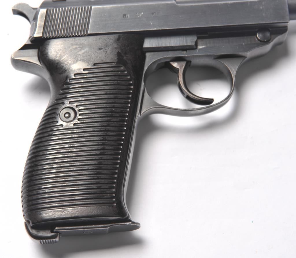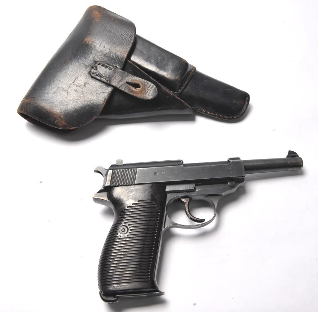 Walther P-38 semi-automatic pistol, 9mm caliber, Serial #3738a. The pistol is in near fine overall condition retaining a significant amount of military finish dated 1943. The slide and frame have numerousproofs and acceptance marks including the Waffen Eagle and other Nazi marks. The textured plastic grips are in very good condition with small mars and handling marks. The lot includes a period leather flapholster dated 1944 with a Nazi Eagle with swastika marked, “WaA159”. The holster is in good condition with scuffing some loss of finish. The lot further includes two correct magazines marked P38. The bore is good, the action is crisp and the markings are sharp on this WWII era P38 by Walther. Est.: $750-$1,500. (C+R/PPT).