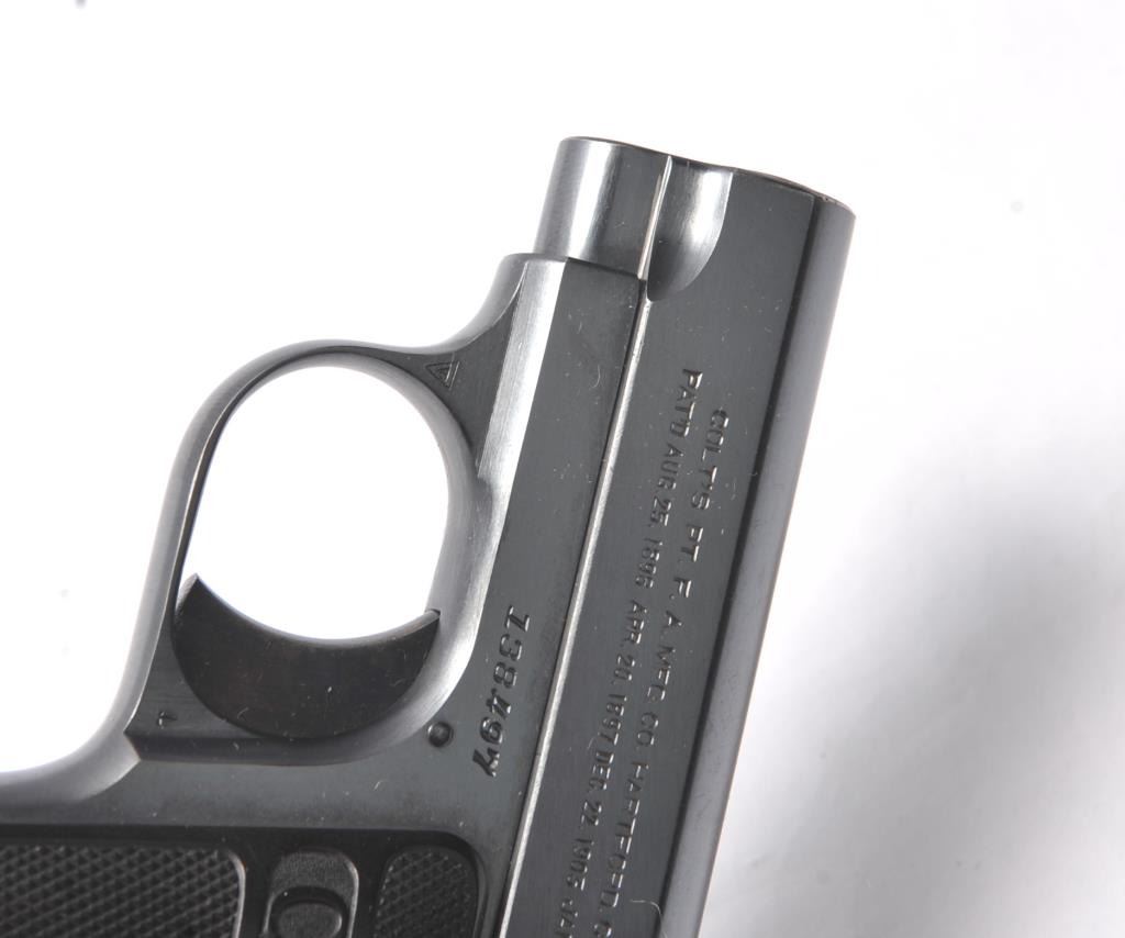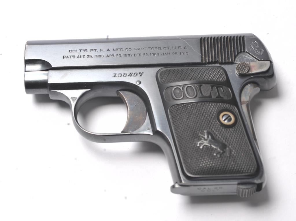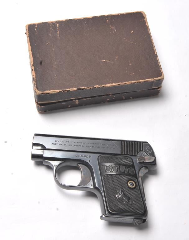 Colt 1908 Pocket Hammerless semi-automatic pistol, .25 ACP caliber, Serial #138497. The pistol is in fine overall condition with a 2” barrel. The metal surfaces retain approximately 95% plus of the toning bluefinish with high point edge wear. The trigger, manual safety and grip safety show vivid original case hardening. The markings are sharp with a crisp Rampant Colt at the left rear of the slide. The checkered hardrubber Colt marked grips are in near fine condition. The pistol comes with the original, 2nd type factory cardboard box with the original instruction sheet, bore brush and matching end label. The bore is good and the action is crisp on this desirable Model 1908 circa 1916. Est.: $750-$1,500. (C+R/PPT).