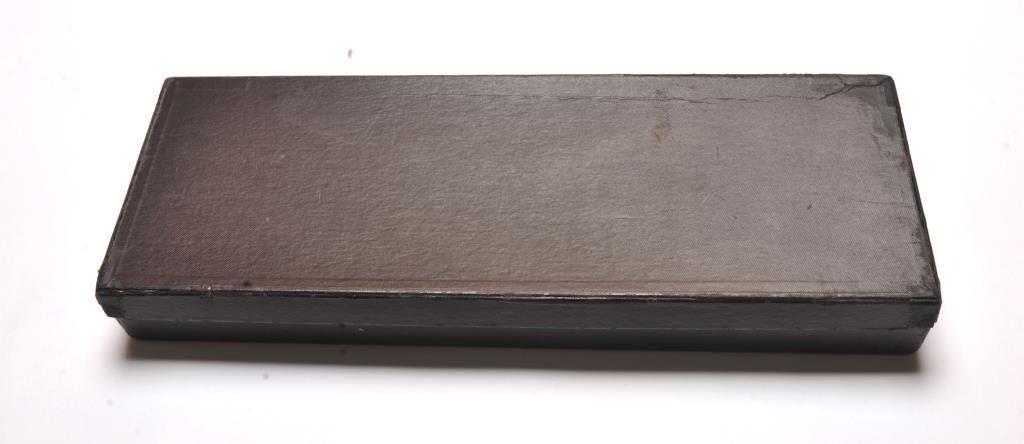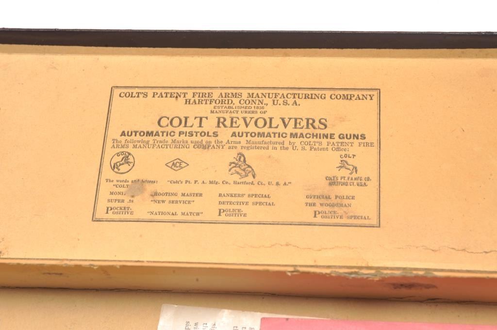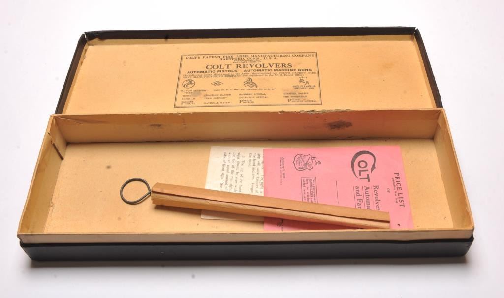 Vintage Colt factory black box with manual, price list, bore brush and “Shooting Suggestions” manual. The interior lid is Colt marked. The box is in very good condition with scuffs and wear at thecorners. The box measures 14” in length by 5” across. An authentic Colt factory box circa 1920’s to late 1930’s which has had a SAA label added later. Est.: $200-$400.