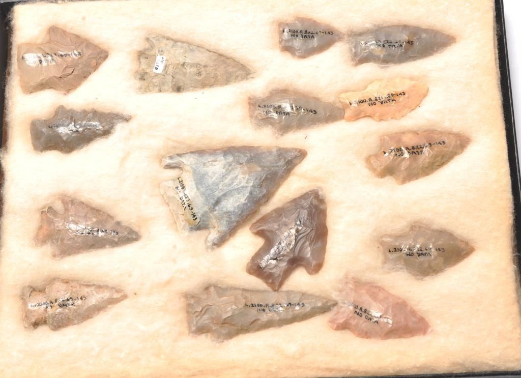 Small Riker case with 15 arrowheads collected in North Dakota. The arrowheads are marked with collection data and were found in North Dakota per the consignor. Est.: $125-$250.