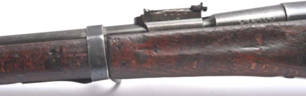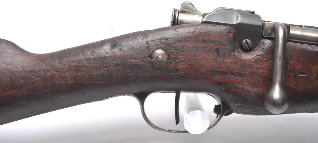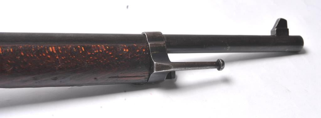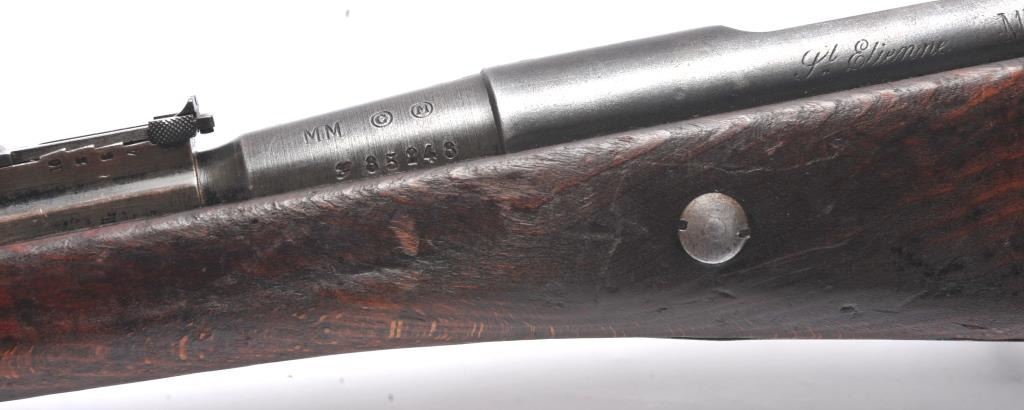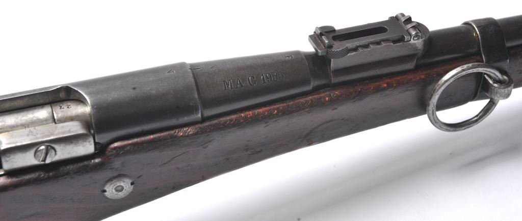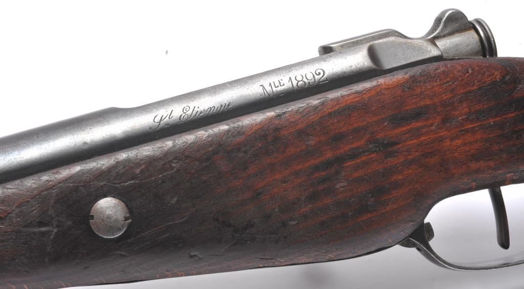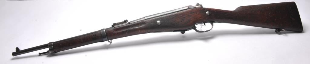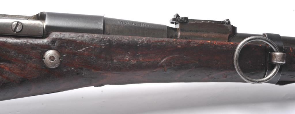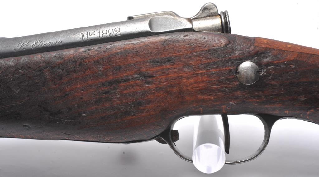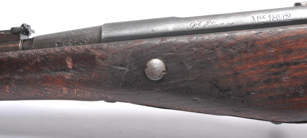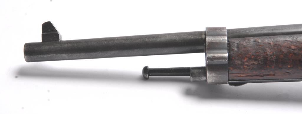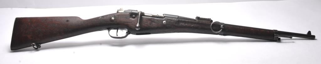 1892 St. Etienne French Lebel Berthier Artillery carbine, 8mm Lebel caliber, Serial #G85248. The carbine is in fair overall condition with an 18” barrel with a ramped blade front and military ladder style rearsights. The metal surfaces have gone to an even grey patina with numerous proofs and acceptance marks. The right side of the barrel is marked, “MAC 1935” just ahead of the front ring. The smooth wood stock is infair condition showing heavy use with significant mars, dents and numerous light cartouches. There is a saddle ring at the right side of the fore end. The bore is fair and the action works well. Est.:$250-$500. (C+R/PPT).