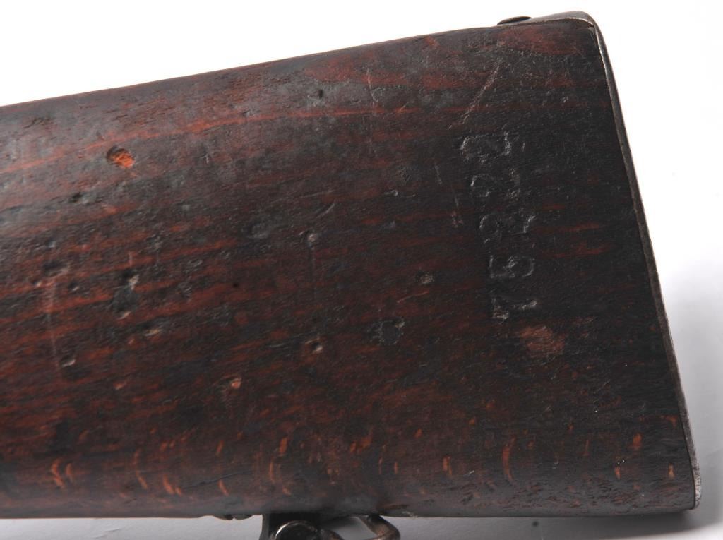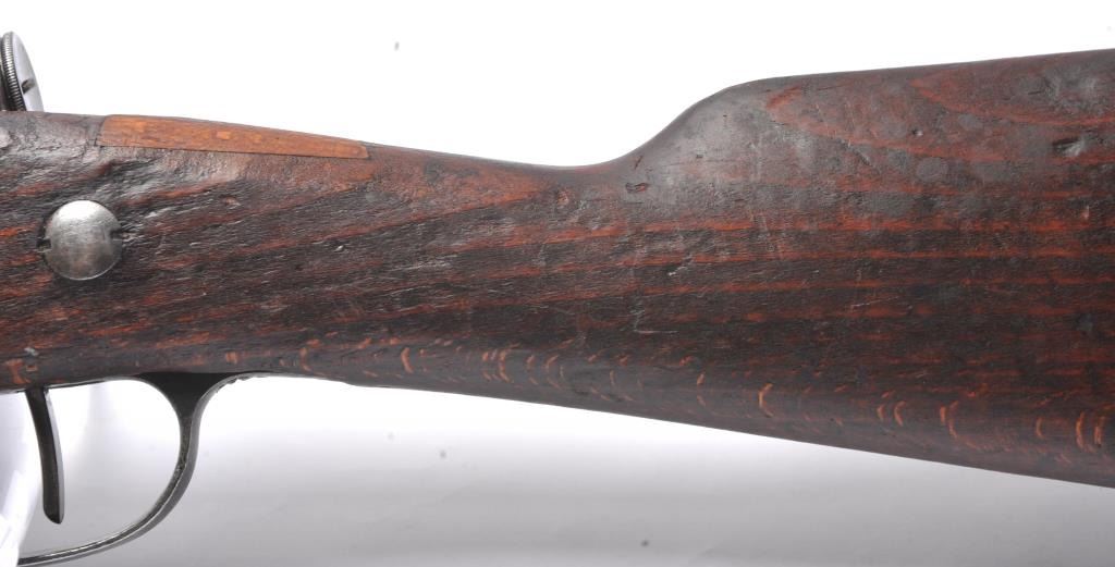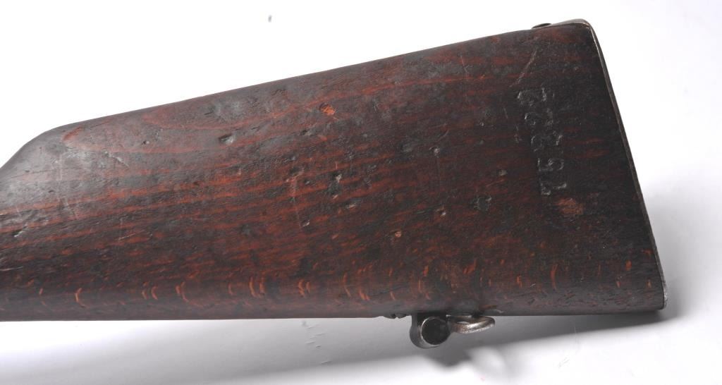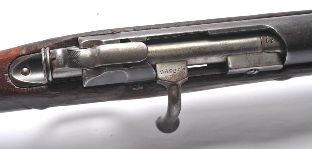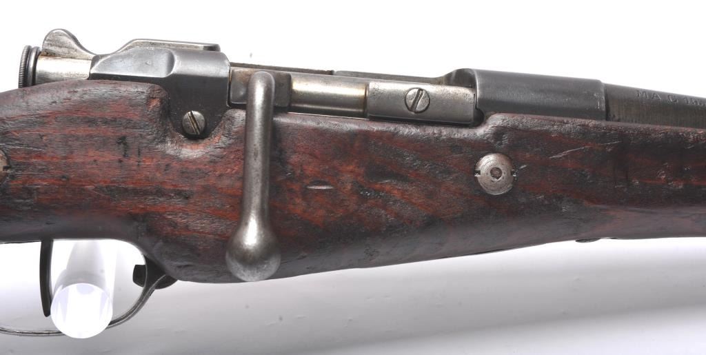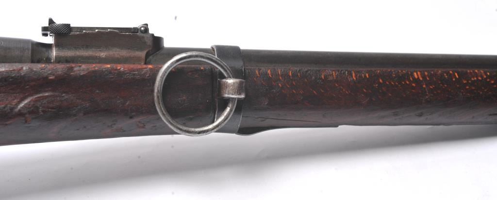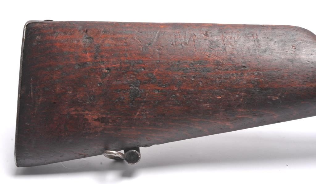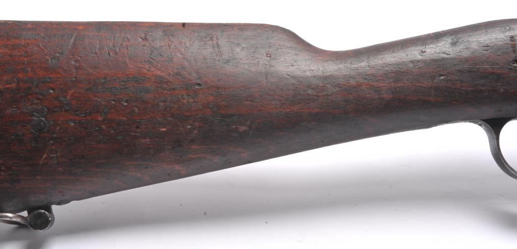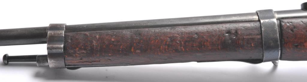 1892 St. Etienne French Lebel Berthier Artillery carbine, 8mm Lebel caliber, Serial #G85248. The carbine is in fair overall condition with an 18” barrel with a ramped blade front and military ladder style rearsights. The metal surfaces have gone to an even grey patina with numerous proofs and acceptance marks. The right side of the barrel is marked, “MAC 1935” just ahead of the front ring. The smooth wood stock is infair condition showing heavy use with significant mars, dents and numerous light cartouches. There is a saddle ring at the right side of the fore end. The bore is fair and the action works well. Est.:$250-$500. (C+R/PPT).