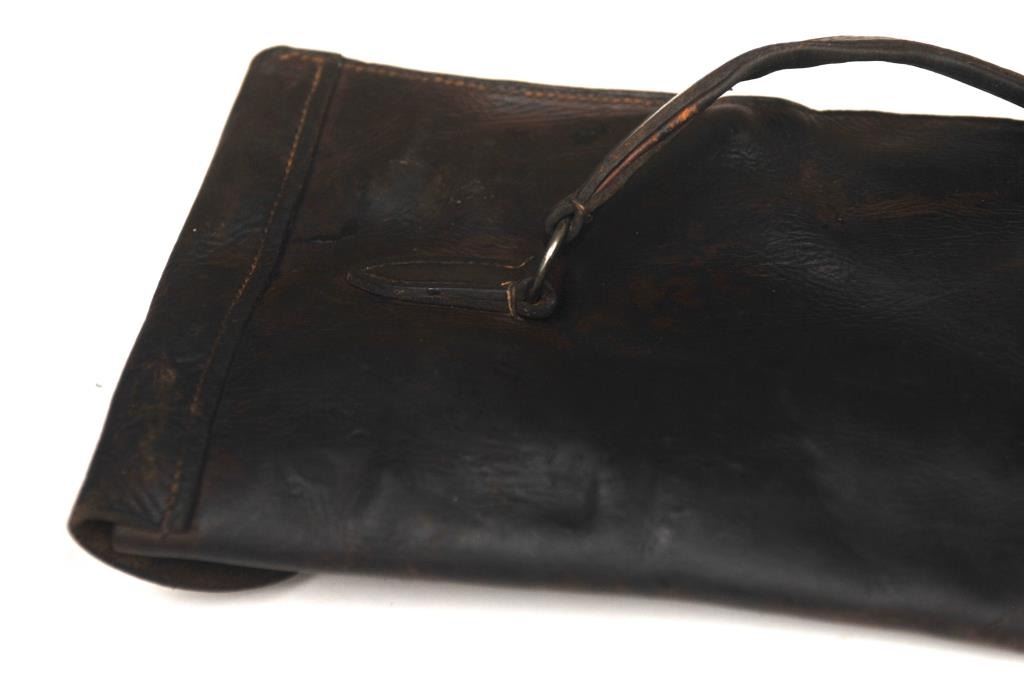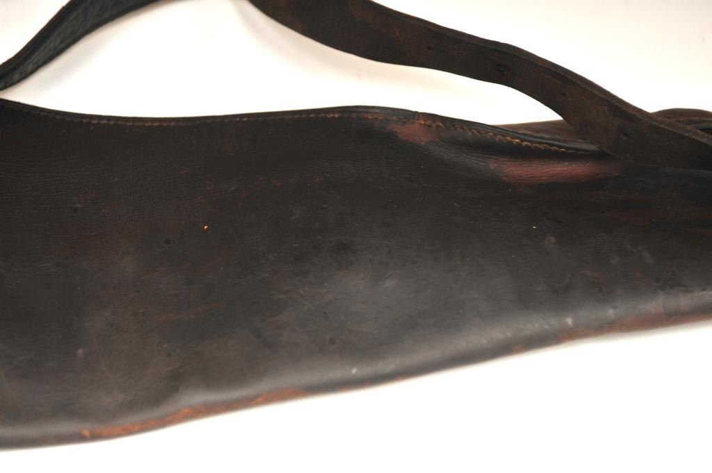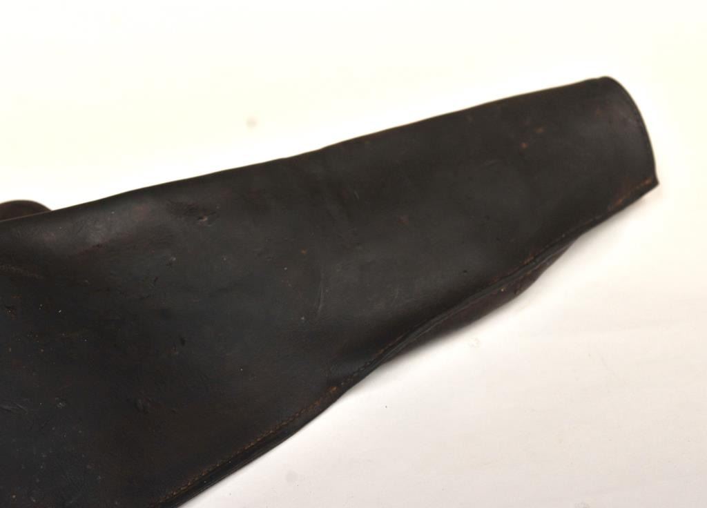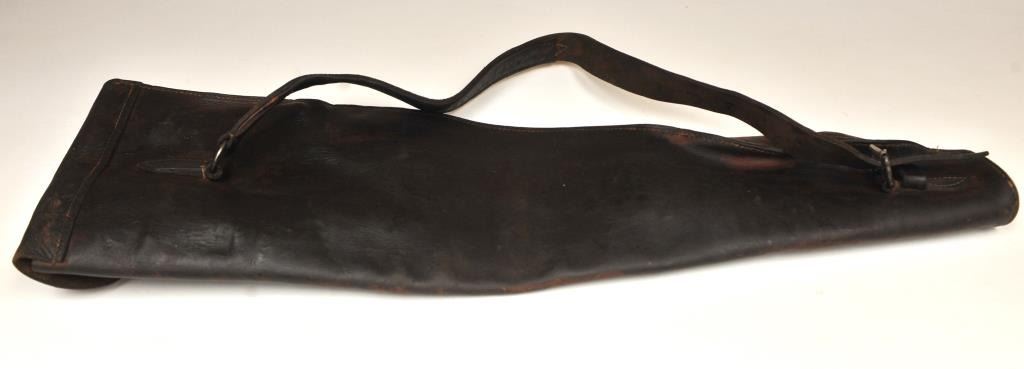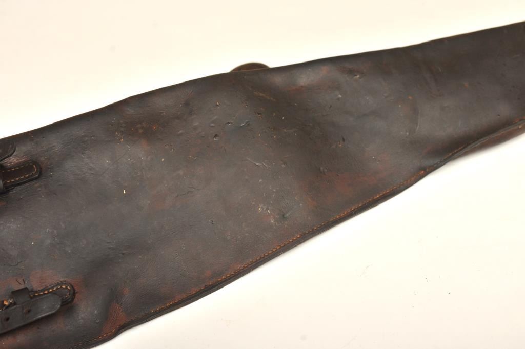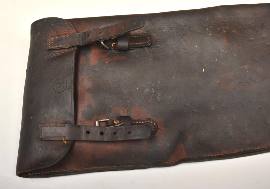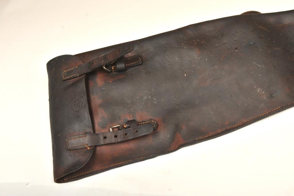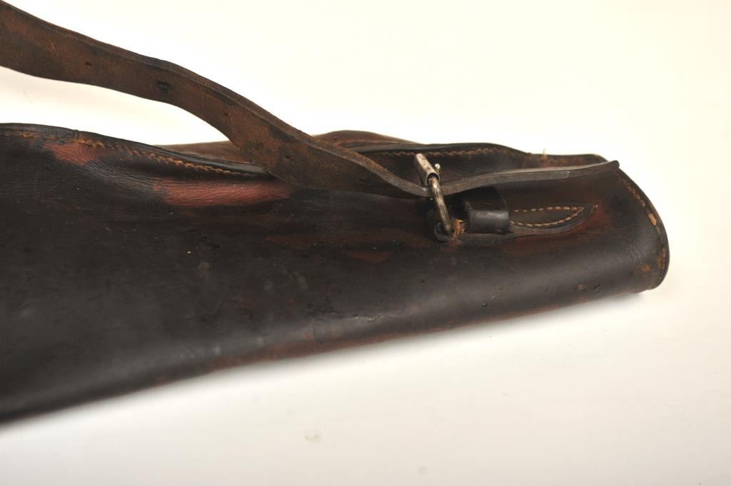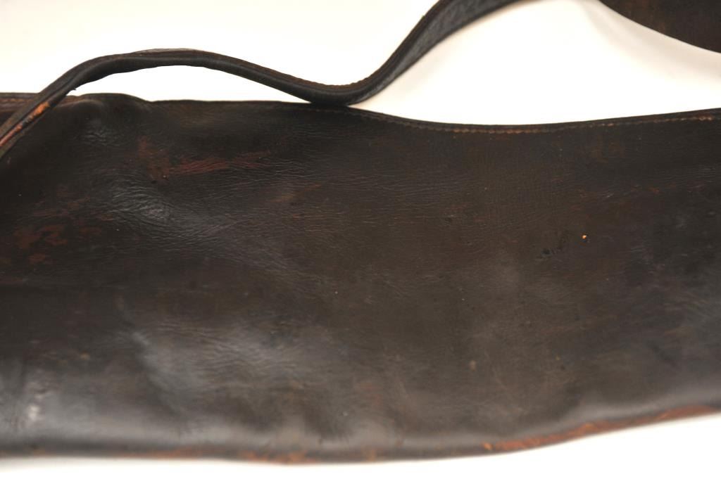 Vintage leather case for U.S. M1 paratrooper carbine. The leather case is in good overall condition with original straps and buckles. The case shows some light to moderate oil staining with stainless steel buckles and amaker’s mark on the flap. Est.: $150-$300.