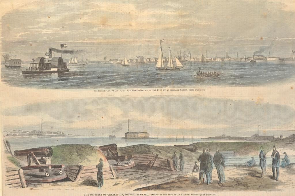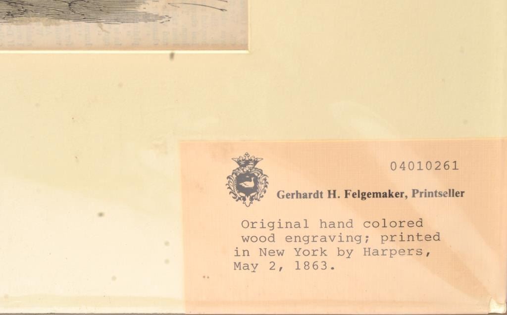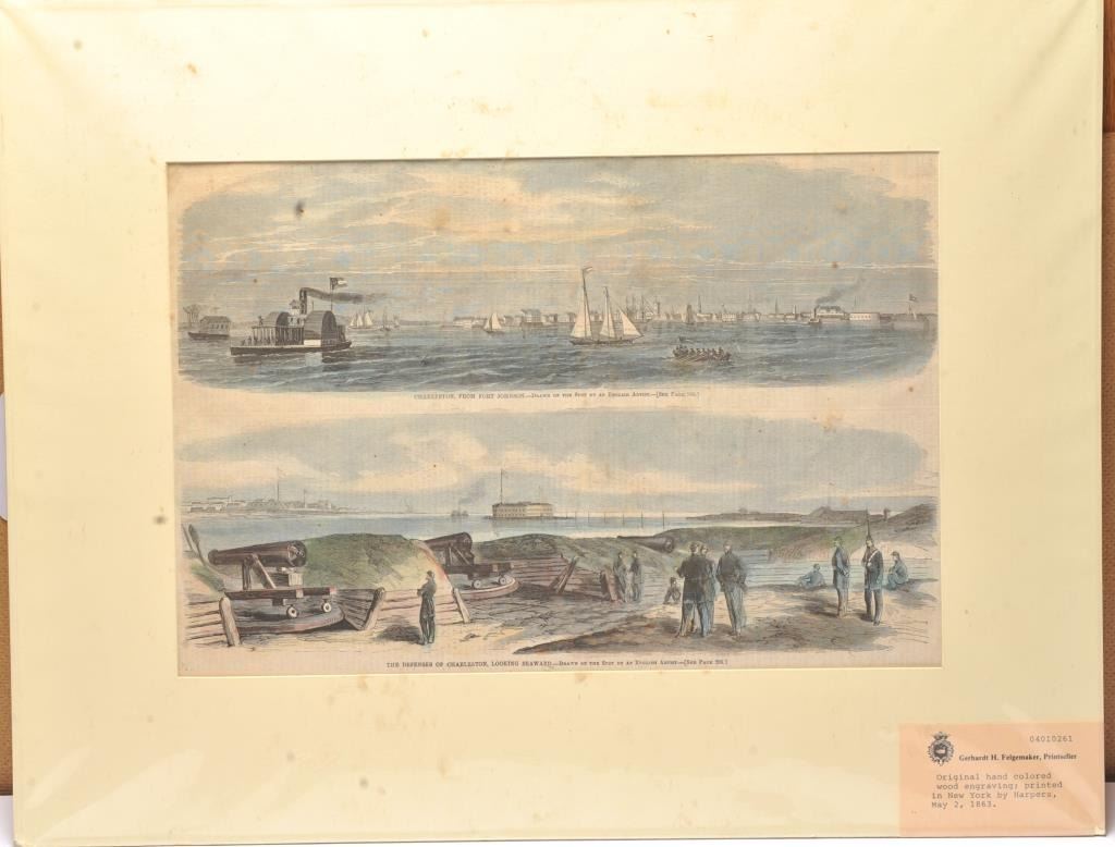 Original hand colored, wood engraving; printed in New York by Harper’s, dated May 2, 1863. The top drawing has the following caption, “CHARLESTON, FROM FORT JOHNSON”. The bottom is captioned, “THE DEFENSES OFCHARLESTON LOOKING SEAWARD”. Both pieces indicate they were drawn on spot by an English artist. An interesting lot showing Charleston during the period of the Civil War. The piece measures 20” x 15 ½” withmat. Est.: $75-$150.