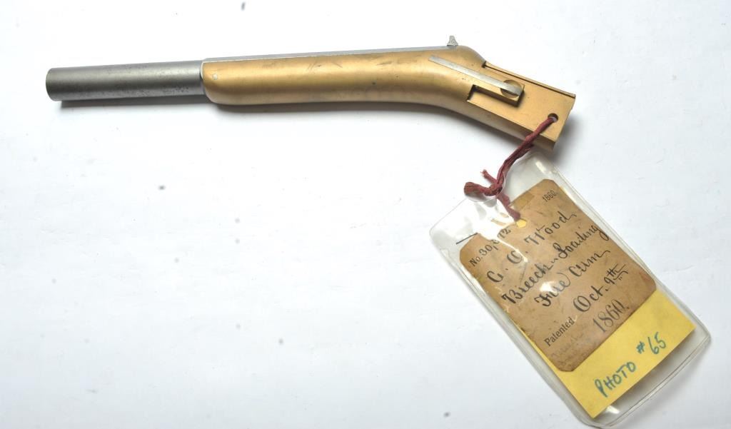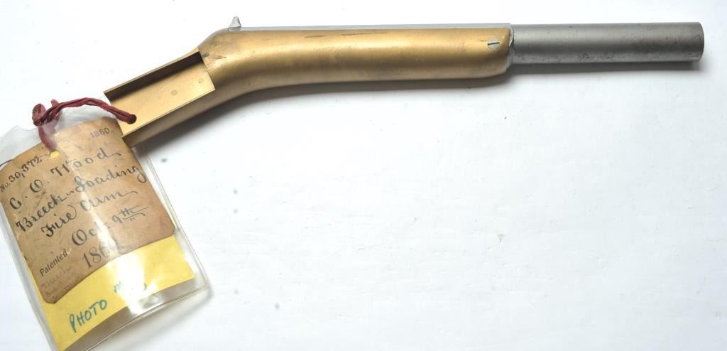 C.O. Wood breech loading firearm patent model  “#30,372 1860 dated” on patent office tag  with copy of patent papers and description of  operation. We have seen Woods name in  correspondence to Winchester and he may havehad an association. Good condition. Measures  12 ½” overall. Mr. & Mrs. O. Rundle Gilbert’s  U.S. Patent Model Collection.  Est.:  $600-$1200