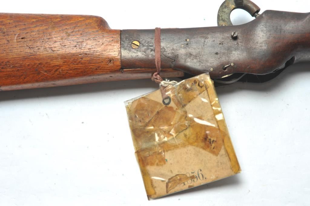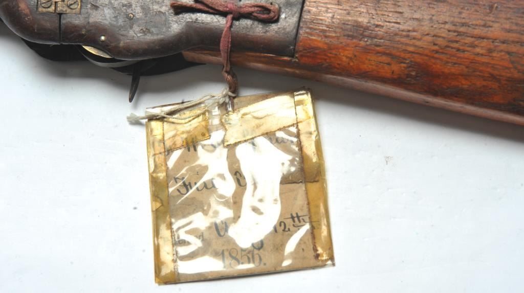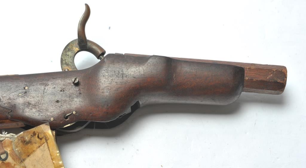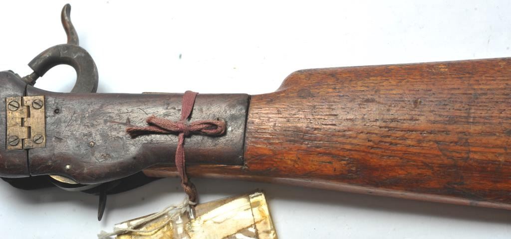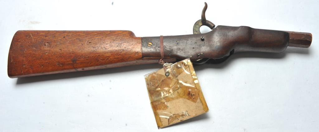 F.W. Hoffman Patent Model for breech loading  firearm “Aug 12th 1856” with tag attached,  copy of patent papers and description of  operation. Wood and metal model measuring 18  ½” from tip to end. Complicated and workingaction that cocking hammer exposes breech.  Good condition with minor cracking and aging  but working. Interesting and a competitor to  other breech loading Pre-Civil War arms. Mr.  & Mrs. O. Rundle Gilbert’s U.S. Patent ModelCollection. Est.: $800-$1600