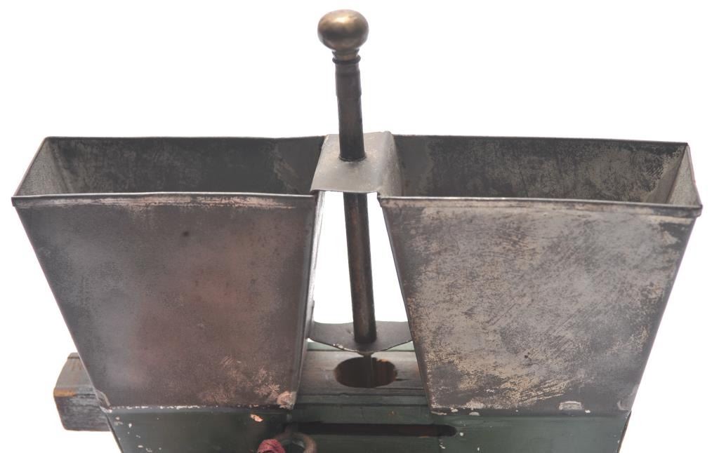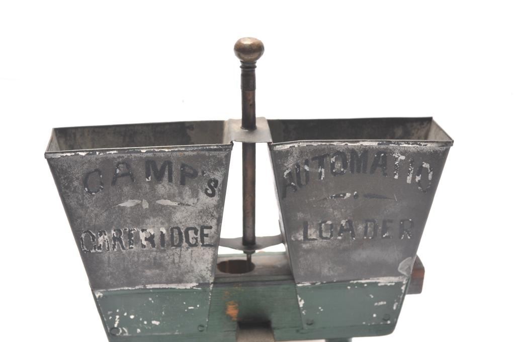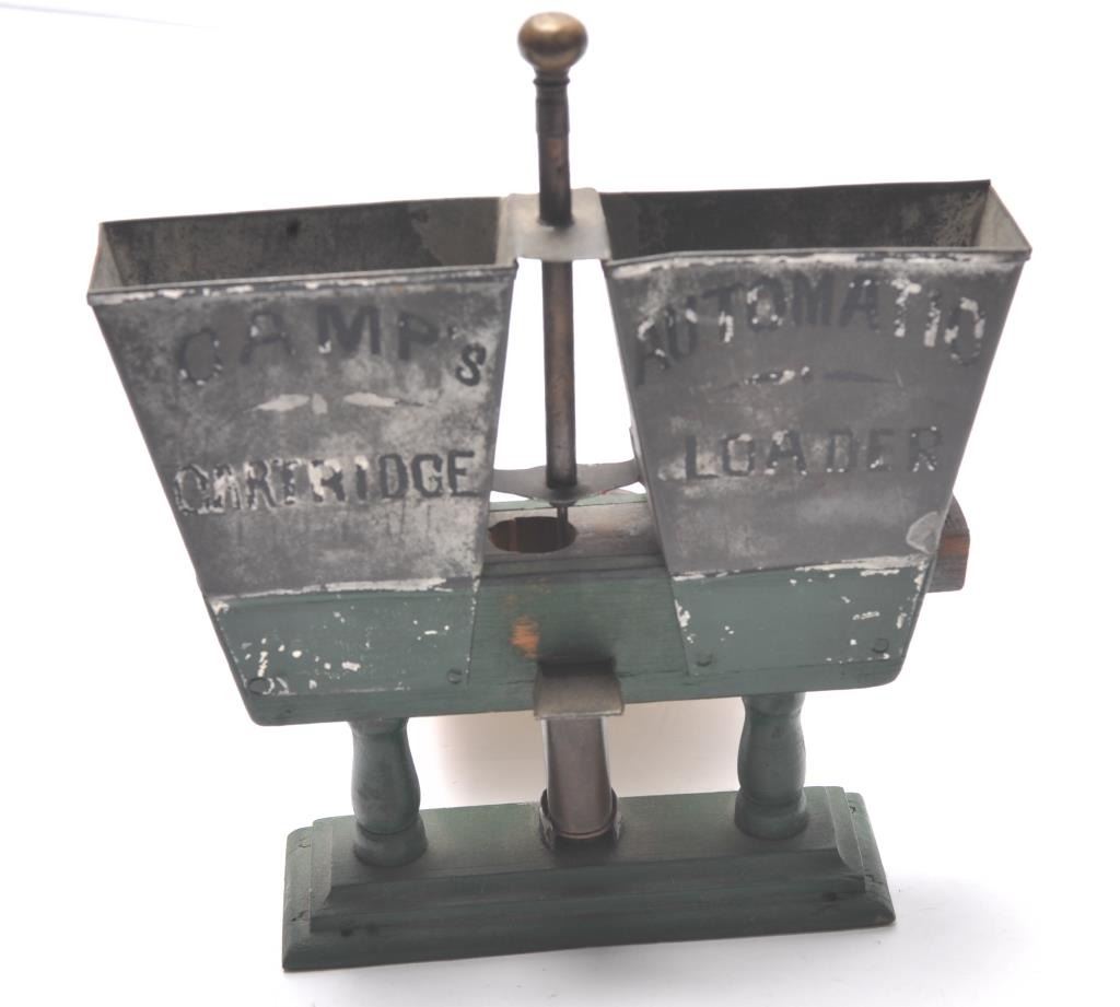 J.P. Camp cartridge loading device wit patent  tag “#183902 from U.S. Pat Office, Dated Oct  31 1876”. Operational wood and tin.  Approximately 8” in height. Good condition.  Est.: $250-$500