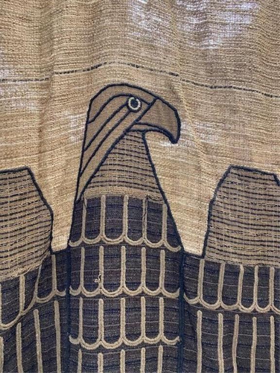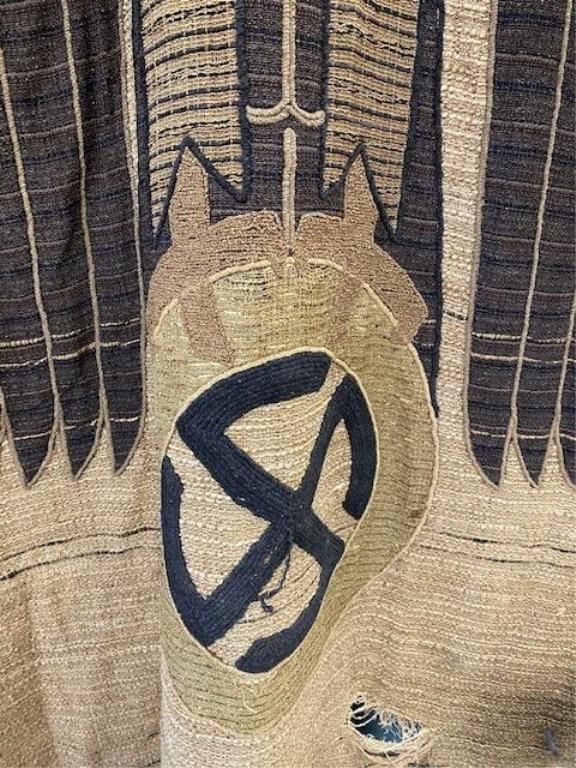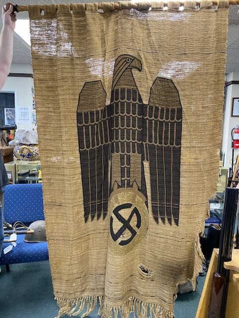 Nazi Era woven wall hanging w/Nazi symbols on inlaid and carved high quality rod hanger of same era. Approx. 8 ft by 4 ft. Ex Museum of World Wars Ron Lane Collection displayed with Goring Artifacts captured by Lt.Shapiro. So9me holes and natural aging and tears, rips and losses. Absolutely genuine, we could not find it on Shapiro's inventory, however he captured a truck load with Goring's entourage. Est:$750-1000